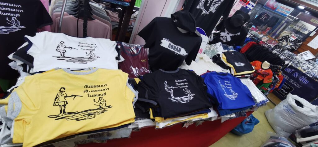 ได้มีนักท่องเที่ยวทั้งชาวไทยและชาวต่างประเทศ และประชาชนทั่วสารทิศ ได้แห่มาอุดหนุน เสื้อลายเส้น เด็กถือปืนฉีดน้ำไล่ลิง แน่นห้างประตูทองวัฒนา