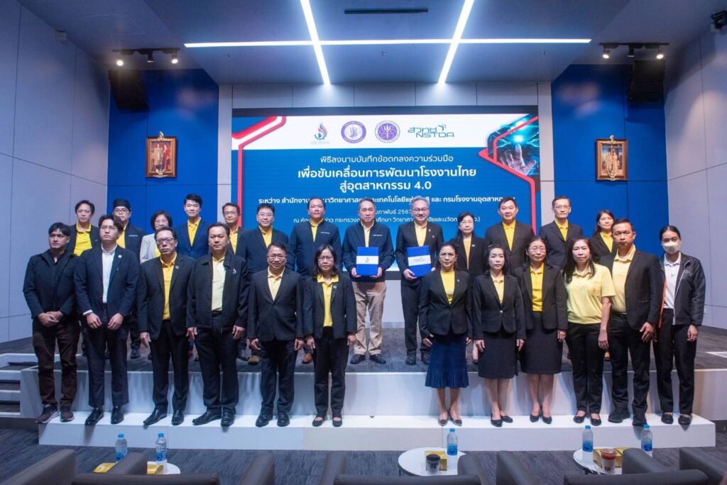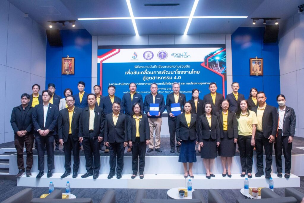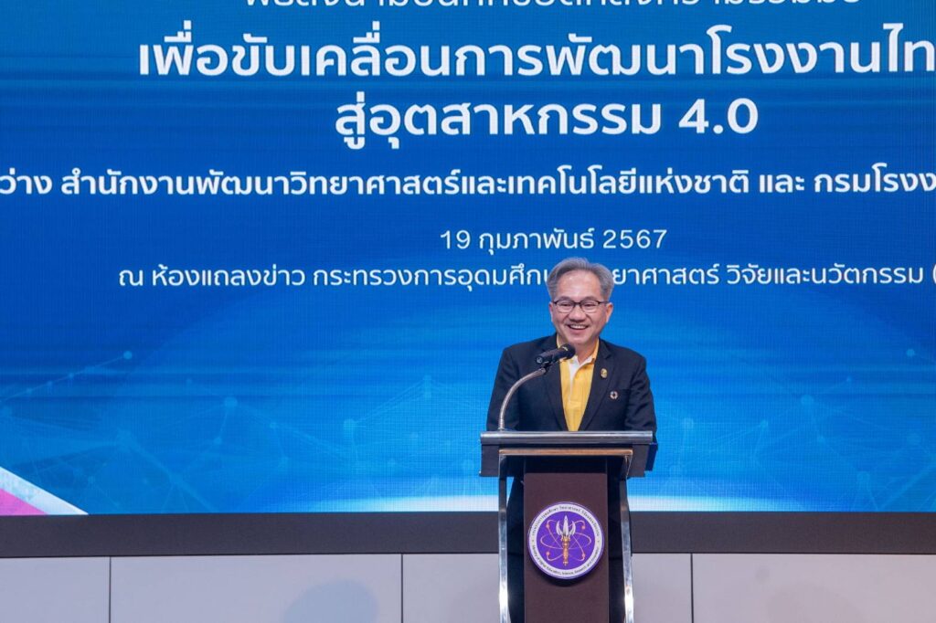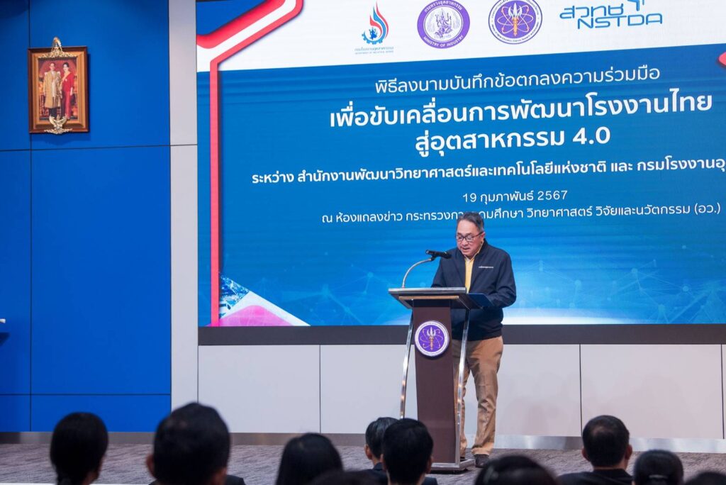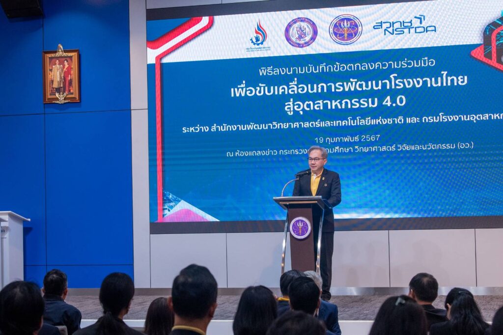 วันที่ 19 กุมภาพันธ์ 2567 ณ ห้องแถลงข่าวกระทรวง อว.ชั้น 1 อาคารพระจอมเกล้า ถ.พระรามที่ 6 : สำนักงานพัฒนาวิทยาศาสตร์และเทคโนโลยีแห่งชาติ (สวทช.) กระทรวงการอุดมศึกษา วิทยาศาสตร์ วิจัยและนวัตกรรม (อว.) โดย ศาสตราจารย์ ดร.ชูกิจ ลิมปิจำนงค์ ผู้อำนวยการสำนักงานพัฒนาวิทยาศาสตร์และเทคโนโลยีแห่งชาติ (สวทช.) พร้อมด้วย ดร.จุลพงษ์ ทวีศรี อธิบดีกรมโรงงานอุตสาหกรรม กระทรวงอุตสาหกรรม ร่วมพิธีลงนามบันทึกข้อตกลงความร่วมมือเพื่อขับเคลื่อนการพัฒนาโรงงานไทยสู่อุตสาหกรรม 4.0 ระหว่าง สำนักงานพัฒนาวิทยาศาสตร์และเทคโนโลยีแห่งชาติ และ กรมโรงงานอุตสาหกรรม โดยมี ดร.รวีภัทร์ ผุดผ่อง ผู้อำนวยการแพลตฟอร์มสนับสนุนอุตสาหกรรม 4.0 สวทช. และผู้บริหารทั้งสองหน่วยงานร่วมแถลงข่าว