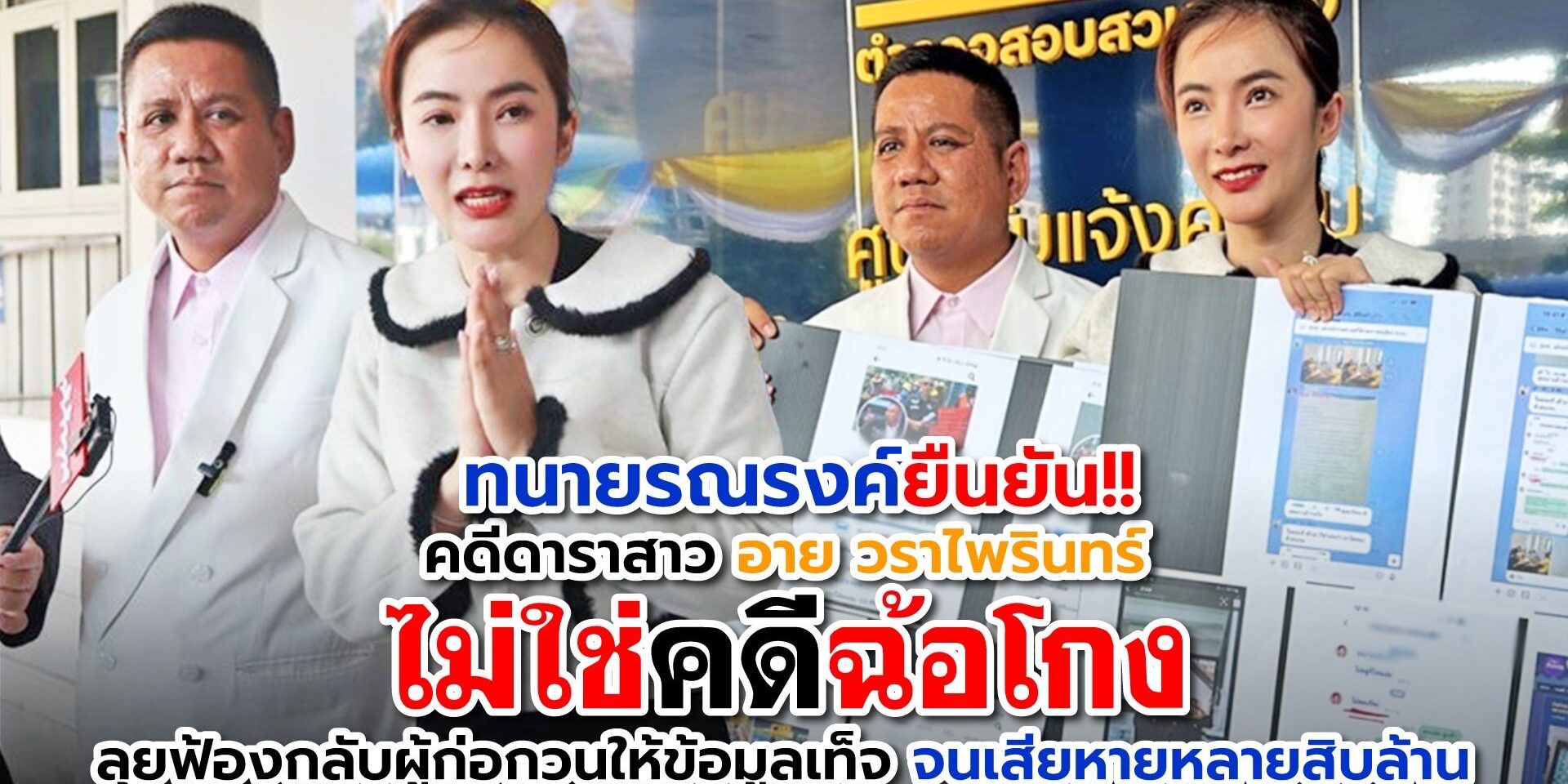 เวลา 15:00 น. ที่กองบังคับการปราบปราม อาย วราไพรินทร์ ธนวริสพร นักแสดงชื่อดัง พร้อมทีมงานและทนายรณณรงค์ แก้วเพ็ชร์ ทนายความ บริษัท ทนายคู่ใจ จำกัด นำพยานหลักฐานเข้าพบตำรวจหลังจากถูกกลุ่มคนแถลงข่าวที่บริเวณหน้ากองปราบปราบ กล่าวหาว่าเป็นดาราสาวชื่อดังต้มตุ๋นโกงเงินร่วมหลายสิบล้านจากผู้ประกอบการส่งออกตะวันออกกลาง
