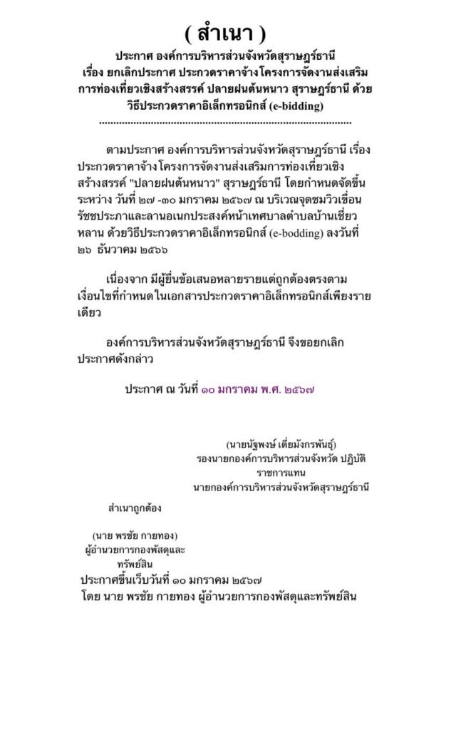 อีกทั้ง ความไม่ชอบมาพากลที่แสดงให้เห็นถึงวิธีการปฏิบัติที่ไม่โปร่งใสมากที่สุด นั่นคือ เมื่อมีการยื่นประกวดราคาจัดจ้างทางอิเล็กทรอนิกส์ (e-bidding) เรียบร้อยแล้ว โดยมีผู้ยื่นเสนอราคาหลายราย แต่กลายเป็นว่าไม่มีการประกาศผู้ชนะการประมูล แต่องค์การบริหารส่วนจังหวัดสุราษฎร์ธานี กลับออกประกาศให้มีการยกเลิกการประกวดราคาจัดจ้างในครั้งนี้ โดยให้เหตุผลว่า “มีผู้ยื่นข้อเสนอหลายราย แต่ถูกต้องตรงตามเงื่อนไขที่กำหนดไว้ในเอกสารประกวดราคาจัดจ้างทางอิเล็กทรอนิกส์เพียงรายเดียว” ซึ่งออกประกาศ ณ วันที่ 10 มกราคม 2567