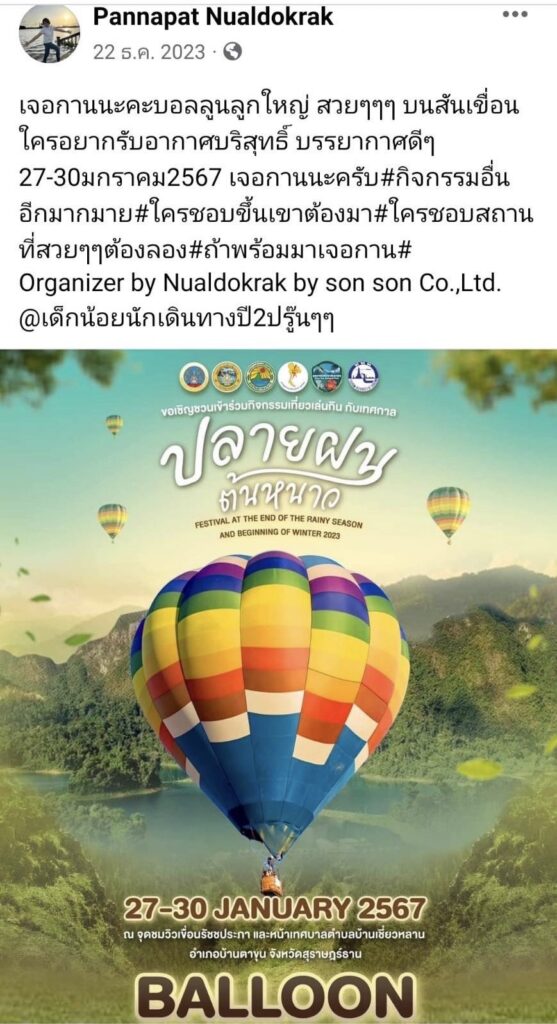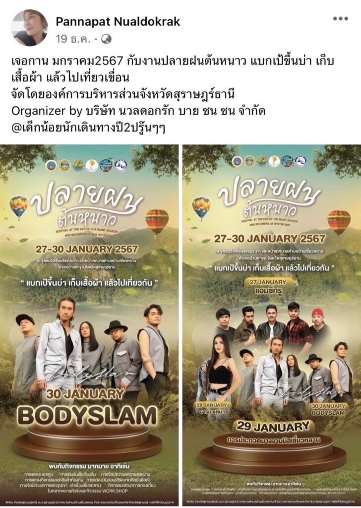 โดยพบพิรุธและหลักฐานในการทุจริต (ฮั้วประมูล) อาทิเช่น กรรมการผู้มีอำนาจของบริษัทที่ชนะการประมูล ได้โพสต์ข้อความในเฟสบุ๊คส่วนตัว ตั้งแต่วันที่ 19 ธันวาคม 2566 ระบุใจความว่า “เจอกานมกราคม 2567 กับงานปลายฝนต้นหนาว แบกเป้ขึ้นบ่า เก็บเสื้อผ้าแล้วไปเที่ยวเขื่อน จัดโดย องค์การบริหารส่วนจังหวัดสุราษฎร์ธานี Organizer by บริษัท……….จำกัด” พร้อมมีการนำรูปภาพของศิลปินและวงดนตรีมาแจ้งให้ทราบอย่างละเอียดว่า จะขึ้นเล่นคอนเสิร์ตในงานเรียงตามลำดับวันไหน โดยเป็นวงดนตรีและศิลปินที่มีชื่อเสียงระดับประเทศทั้งสิ้น ซึ่งเป็นที่ชัดเจนว่าจะต้องมีการนัดหมายพูดคุยจองคิวการแสดงกับวงดนตรีและศิลปินเป็นที่เรียบร้อยแล้ว ทั้งที่ความเป็นจริง จะมีการประมูลราคาจัดจ้างทางอิเล็กทรอนิกส์ (e-bidding) ขึ้นในวันที่ 5 มกราคม 2567