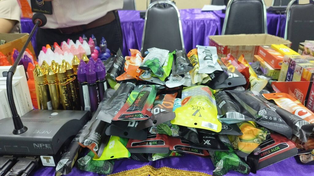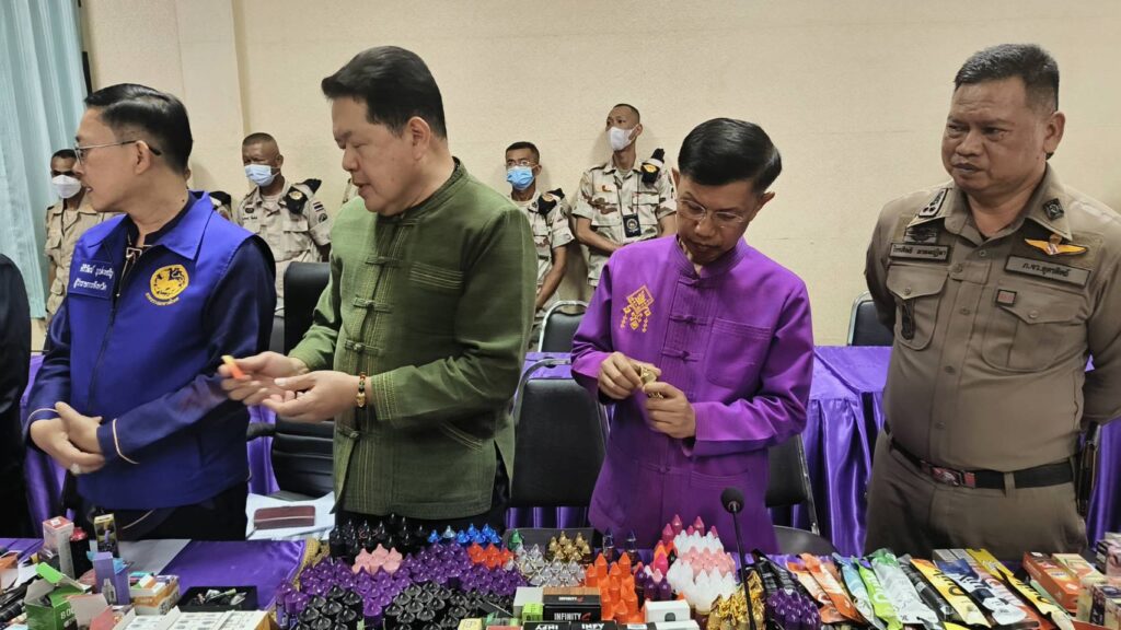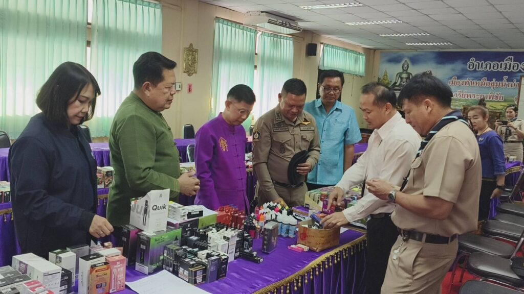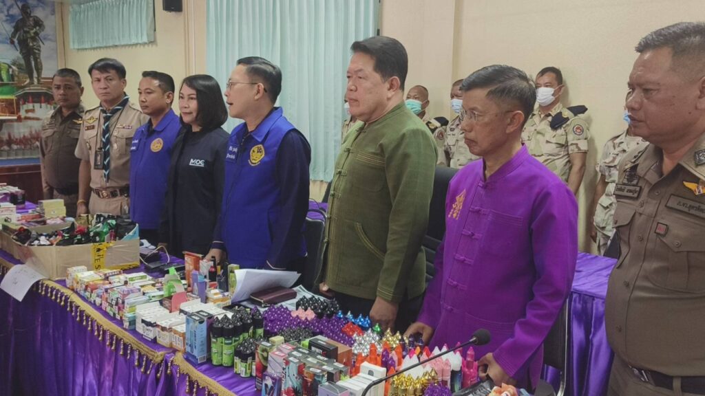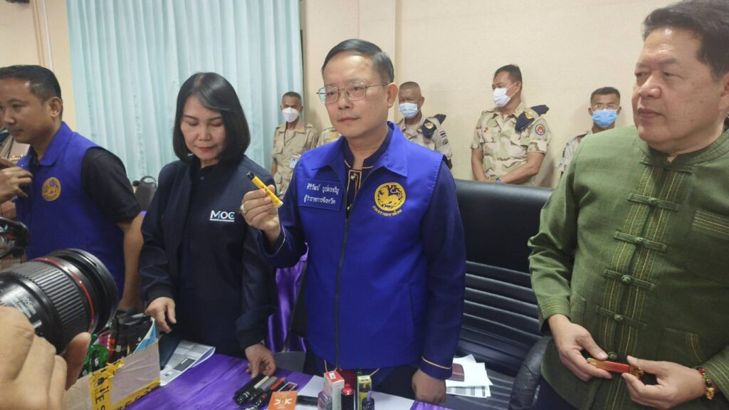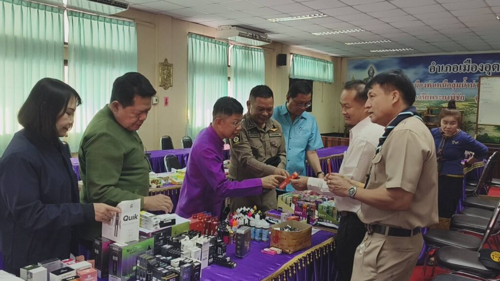 ผู้สื่อข่าวรายงานว่าเมื่อวันที่ 21 กุมภาพันธ์ 2567 เวลา 17.00 น. นายศิริวัฒน์ บุปผาเจริญ ผู้ว่าราชการจังหวัดอุตรดิตถ์ พร้อมด้วยนายศิวัช ฟูบินทร์ นายอำเภอเมืองอุตรดิตถ์ พ.ต.อ.ไกรสิทธิ์ พรหมปฏิมา ผู้กำกับสถานีตำรวจเมืองอุตรดิตถ์ ร่วมแถลงผลการจับกุมผู้ลักลอบเปิดร้านจำหน่ายบุหรี่ไฟฟ้ากลางใจเมืองอุตรดิตถ์ ได้ของกลางหลายรายการมูลค่ากว่า 7 แสนบาท พร้อมผู้ต้องหา ชึ่งได้รับสารภาพว่าเป้นเพียงผู้รับจ้างเฝ้าร้านและจำหน่ายแต่ไม่ได้เป็นเจ้าของร้าน โดยได้จำหน่ายให้กับบุคคลทั่วไปและกลุ่มวัยรุ่น จากการมีผู้ร้องเรียนมายังศูนย์ดำรงค์ธรรมจังหวัดอุตรดิตถ์ ว่ามีการลักลอบขายบุหรี่ไฟฟ้าในเขตเทศบาลเมืองอุตรดิตถ์ ผู้ว่าราชการจังหวัดอุตรดิตถ์จึงได้สั่งการ ให้ชุดจัดระเบียบสังคมแบบบูรณาการออกตรวจตามข้อร้องเรียน โดยได้ส่งสายเข้าล่อซื้อบุหรี่ไฟฟ้า พร้อมกับถ่ายธนบัตรฉบับละ 500 บาท จำนวน 1 ฉบับ ธนบัตรฉบับละ 100 บาท จำนวน 5 ฉบับ ซื้อตัวบุหรี่ไฟฟ้าและน้ำยาจำนวน 2 ชิ้น หลังจากนั้นเจ้าหน้าที่ได้ขอเข้าตรวจค้นอาคารพานิชย์ ถนนเจษฎาบดินทร์ ชื่อร้าน KT Shop พบนางสาว เอ (นามสมมุติ) อายุ 24 ปี เป็นพนักงานประจำร้าน เจ้าหน้าที่ได้แสดงตน ขอตรวจค้นภายในร้านพบตัวบุหรี่ไฟฟ้า น้ำยา จำนวนกว่า 3,517 ชิ้น มีมูลค่ากว่า 7 แสนบาท จึงได้นำของกลางพร้อมผู้ต้องหามาสอบสวนและขยายผลการจับกุมต่อไป โดยได้ตั้งข้อกล่าวหา จำนวน 3 ข้อกล่าวหา