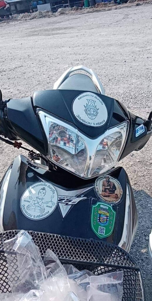 ฝากระโปรงหน้ารถมอเตอร์ไซค์ ด้านซ้าย เป็นรูปสมเด็จพุฒาจารย์โตสีดำเป็นภาพวงกลมอยู่ด้านบน ด้านซ้ายเป็นผ้ากุมารทอง ตัวหนังสือสีดำพื้นสีขาวเป็นวงกลมติดอยู่ด้านบน