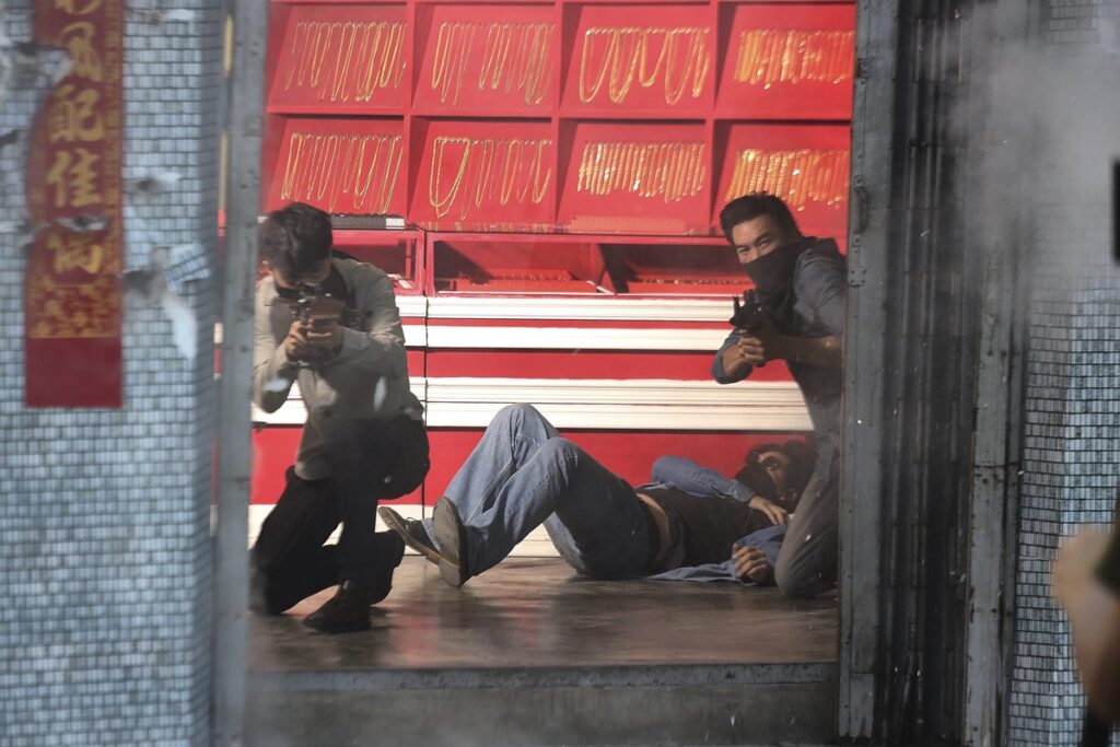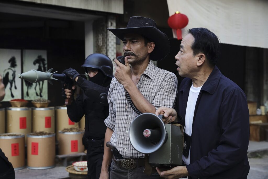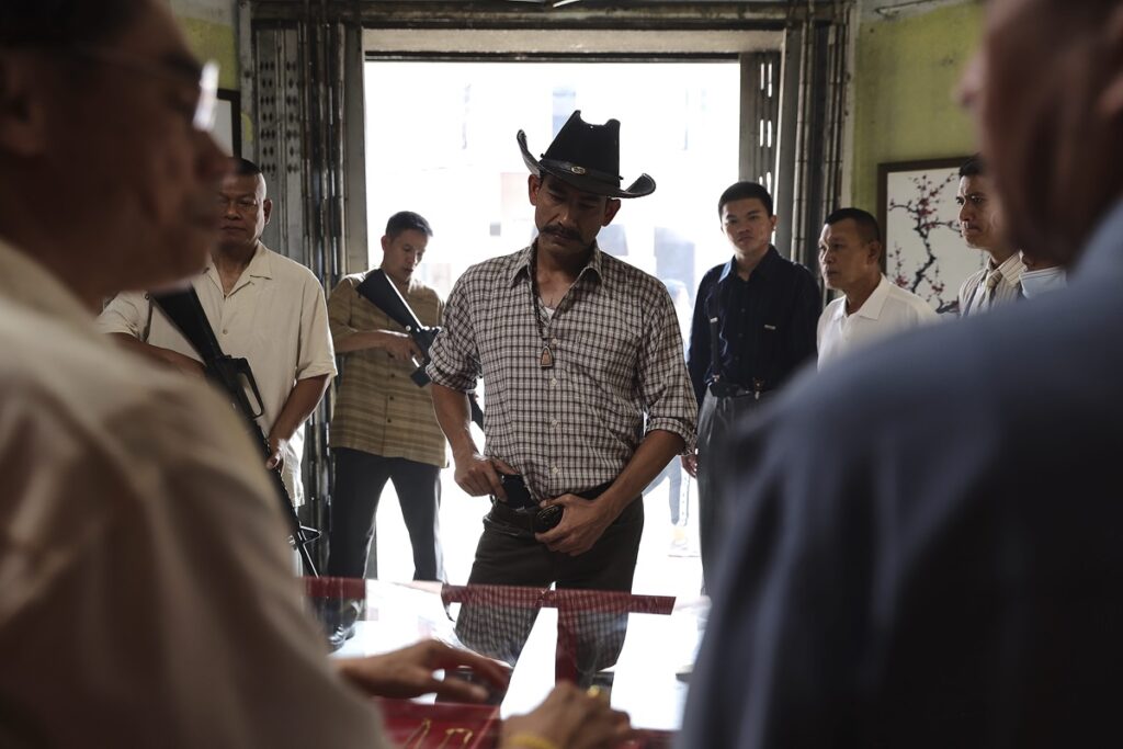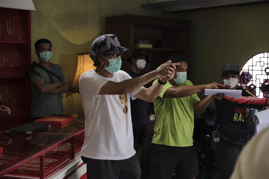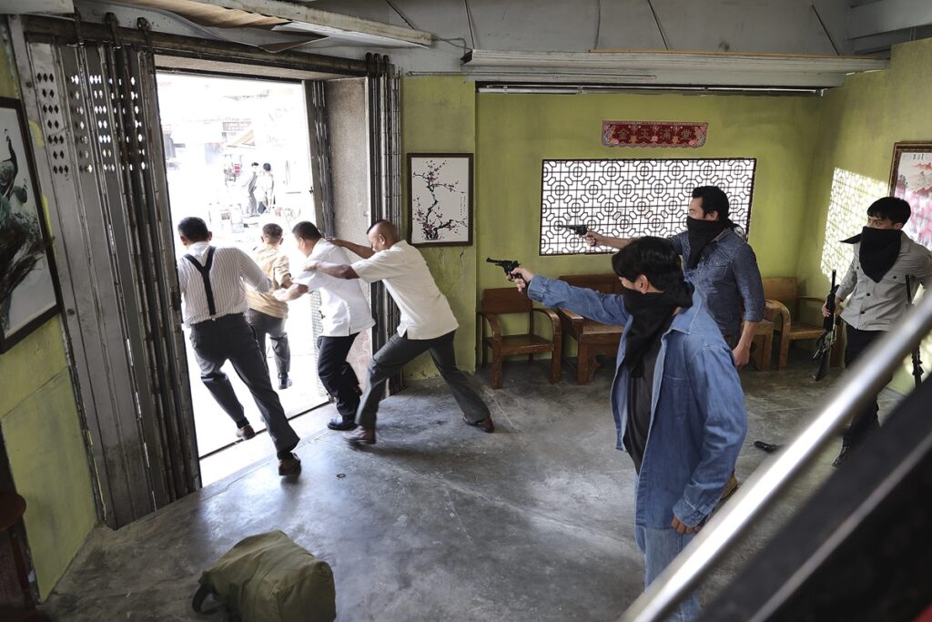โดยเบื้องหลังมีการ จัดเซ็ตให้ย่านเวิ้งนาครเขษมมีชีวิตชีวาขึ้นอีกครั้ง ด้วยโปรดักชั่นจัดร้านค้าต่าง ๆ เสมือนจริง ผู้กำกับ อู๋และทีมงานทำการบ้านมาอย่างดี ทำให้ได้กลิ่นอายย่านการค้าในอดีตกลับมา ซึ่งยอมทุ่มงบประมาณเพื่อโลเคชั่นนี้แบบไม่อั้นด้วย โดยเป็นฉากที่ หนึ่ง (ขุนเผด็จ) นิมิตเห็นเหตุการณ์ล่วงหน้า ว่าจะมีการปล้นร้านทองเกิดขึ้น จึงรายงาน แฟรงค์ (ผู้กอง วิมล) พร้อมขอกำลังพลรวบรวมนายตำรวจมือดีในพื้นที่ต่าง ๆ มาซ้อนแผนปลอมตัวเป็นชาวบ้านเพื่อรับมือแก๊งเขี้ยวพยัคฆ์ งาน นี้ผู้กำกับและทีมงาน นอกจากจะเนรมิตให้เวิ้งนาครเขษมเป็นย่านการค้าที่รุ่งเรือง ซึ่งเป็นหัวใจหลักในการถ่ายทำของซีนนี้ ก่อน ซักซ้อมคิวกับแก๊งเขี้ยวพยัคฆ์ ชาคริต (อำไพ), เต๋า (หม่อม) และ ภีม (ห้าว) ที่ปิดบังใบหน้า พร้อมอาวุธ เดินอุกอาจเข้าไปยัง ร้านทอง และรู้ในเวลาต่อมาว่าตัวเองโดนซ้อนแผน หนึ่ง (ขุนเผด็จ) นำทีมตำรวจพร้อมจับกุม ก่อนจะยิงปืนขู่ และเกิดการยิงสวนกันไปมา ในทันทีจนเกิดการระดมยิงต่อสู้แบบเอาเป็นเอาตาย เอฟเฟคกระสุนปืน, ปืนกล, ระเบิดดังปัง ๆ สนั่นอย่างสะใจ เรียกบรรดาไทยมุงแถบนั้นมาร่วมดูว่าเกิดอะไรขึ้น ซึ่ง ชาคริต, เต๋าและ ภีม ต่างทุ่มเทกับซีนนี้อย่างมาก ซึ่ง อู๋ใจเย็นและใส่ใจในเนื้องาน มากเป็นพิเศษ เพื่อเก็บรายละเอียดให้สมบูรณ์ที่สุด ณ เวิ้งนาครเขษมถึง 3 วัน นับถือพลังของนักแสดงและทีมงานอย่างมาก