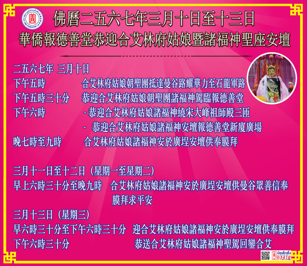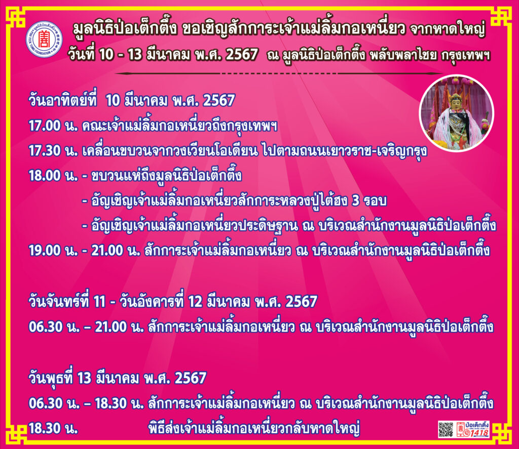 ระหว่างวันที่ 10 – 13 มีนาคม 2567 มูลนิธิป่อเต็กตึ๊ง ร่วมกับมูลนิธิมิตรภาพสามัคคี (ท่งเซียเซี่ยงตึ๊ง) หาดใหญ่ ขอเชิญศิษยานุศิษย์ และสาธุชนที่เลื่อมใส ร่วมสักการะเจ้าแม่ลิ้มกอเหนี่ยวจากหาดใหญ่ องค์ฮกเต็กแป๊ะกง และองค์นาจาไท้จื้อ (เทพโกมินทร์) ณ บริเวณลานสำนักงาน มูลนิธิป่อเต็กตึ๊ง พลับพลาไชย กรุงเทพฯ โดยวันอาทิตย์ที่ 10 มีนาคม 2567 เวลา 17.30 น. คณะเจ้าแม่ลิ้มกอเหนี่ยวเดินทางถึงกรุงเทพฯ ผ่านบริเวณวงเวียนโอเดียน ไปตามถนนเยาวราช – เจริญกรุง โดยขบวนจะแห่ถึงมูลนิธิป่อเต็กตึ๊ง เวลาประมาณ 18.00 น. และในวันที่ 11-12 มีนาคม 2567 มูลนิธิป่อเต็กตึ๊งเปิดให้ผู้มีจิตศรัทธาเข้าสักการะตั้งแต่เวลา 06.30 – 21.00 น. สำหรับวันพุธที่ 13 มีนาคม 2567 เวลา 18.30 น. จะมีพิธีส่งเจ้าแม่ลิ้มกอเหนี่ยวกลับหาดใหญ่