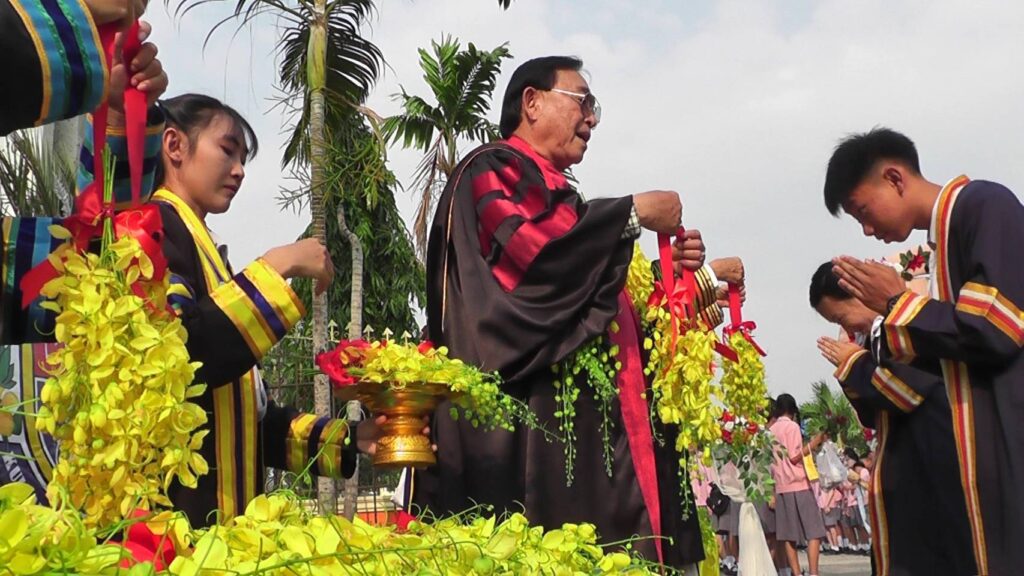 จากนั้น ดร.บัณฑิต ครุฑางคะ ผู้รับใบอนุญาตและผู้จัดการโรงเรียนกุลดิศวิทยานุสรณ์ พร้อมด้วย นางวรรณวิมล ครุฑางคะ ผู้อำนวยการโรงเรียนกุลดิศวิทยานุสรณ์ และคณะผู้บริหารฯ ได้นำนักเรียนที่จบการศึกษา ตั้งแถวเดินผ่านซุ้มแสดงความยินดี ตามธรรมเนียมปฏิบัติ โดยมีนักเรียนรุ่นน้อง ตั้งแต่ระดับชั้นประถมศึกษา จนถึงระดับชั้นมัธยมศึกษาปีที่ 2 คอยตั้งแถวรอรับยาวเหยียด พร้อมมอบดอกไม้ ของขวัญ เพื่อแสดงความยินดี ก่อนรุ่นพี่ทั้งหมดจะได้เข้ารับมอบประกาศนียบัตร และเข้าสู่พิธีบายศรีสู่ขวัญ ปิดท้ายด้วยการ ร่วมร้องเพลงประสานเสียง ท่ามกลางบรรยากาศ สุดชื่นมื่น