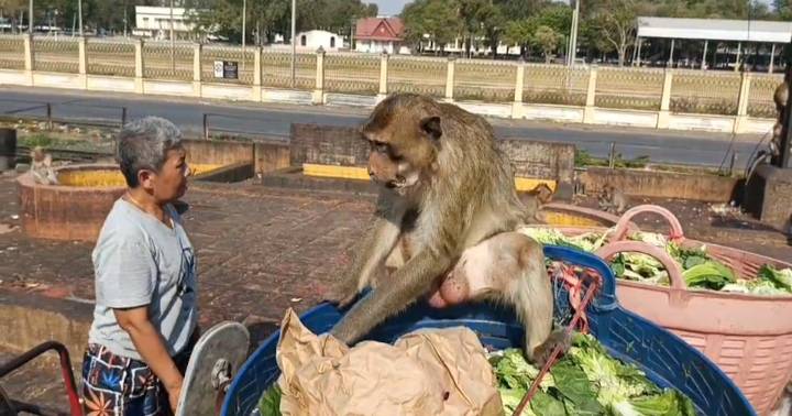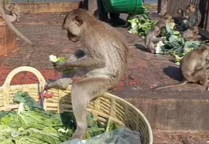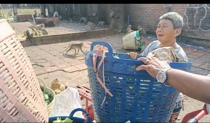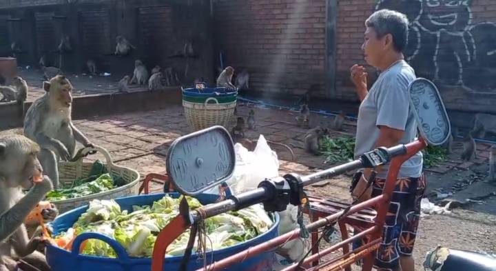 ตนเองได้เหมาเข่งผักสดนานาชนิดมาเลี้ยงลิง