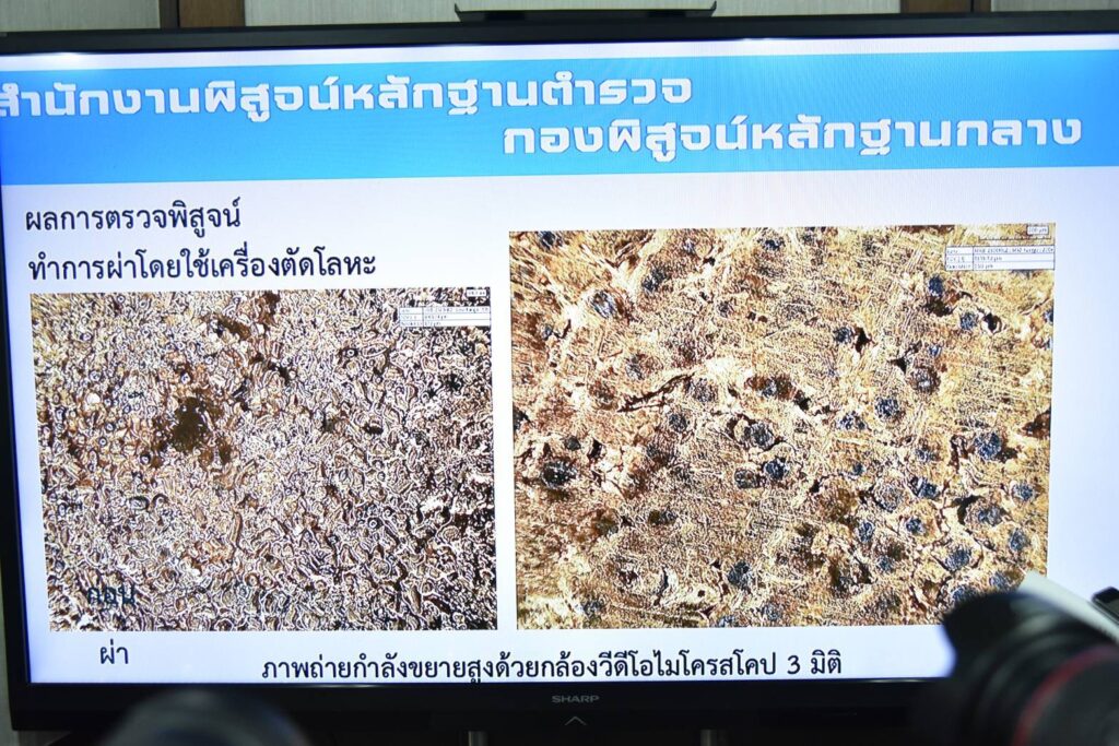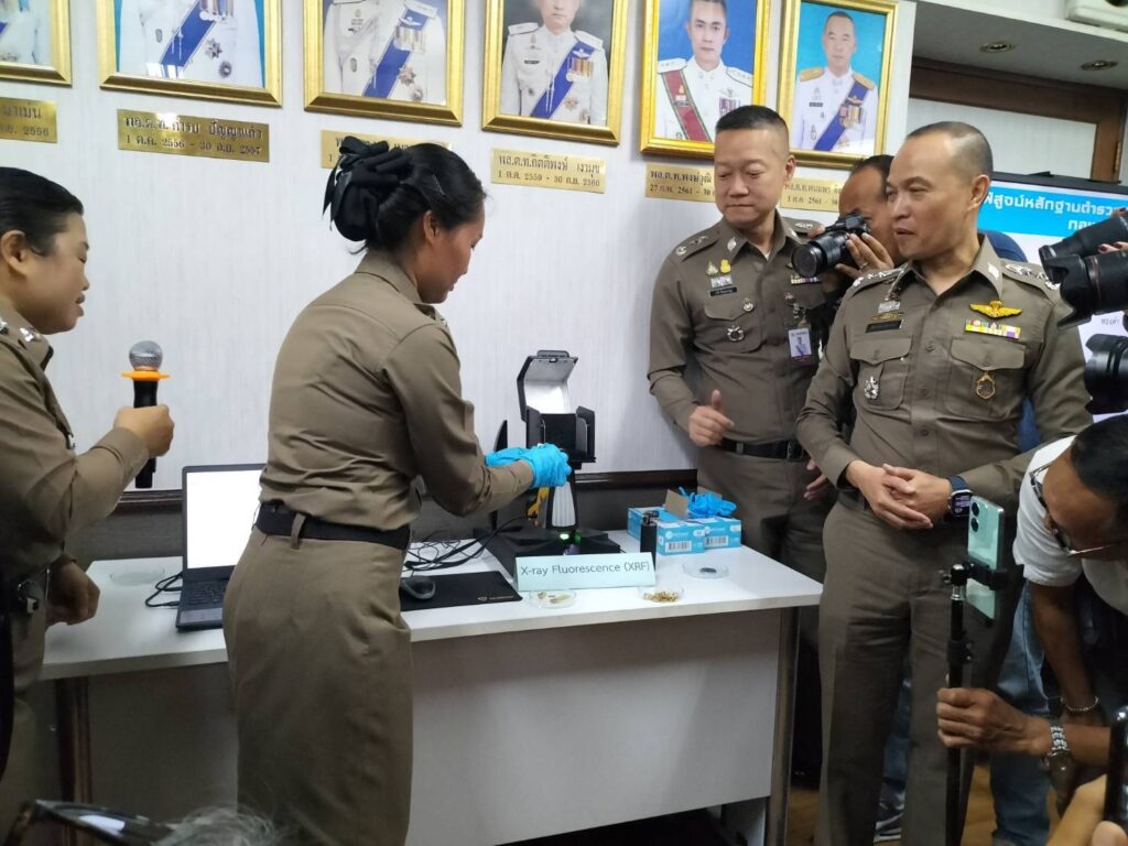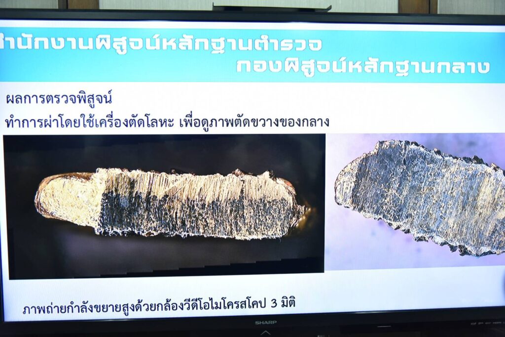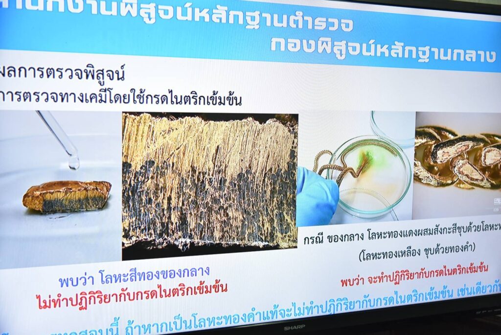 ผลการตรวจพิสูจน์ของกลุ่มงานตรวจทางเคมี ฟิสิกส์ กองพิสูจน์หลักฐานกลาง พบว่า โลหะที่ใช้ผสมกับโลหะทองคำ เป็นธาตุโลหะรีเนียม (Rhenium) และทังสเตน (Tungsten) ซึ่งไม่สามารถใช้เทคนิคพื้นฐาน เช่น หยดกรด เผาไหม้ หรือใช้เครื่องมือ X-ray ขนาดเล็กในการตรวจวิเคราะห์ เจอได้ ทำให้จำเป็นต้องใช้เครื่องมือวิทยาศาสตร์ขั้นสูง ในการตรวจพิสูจน์