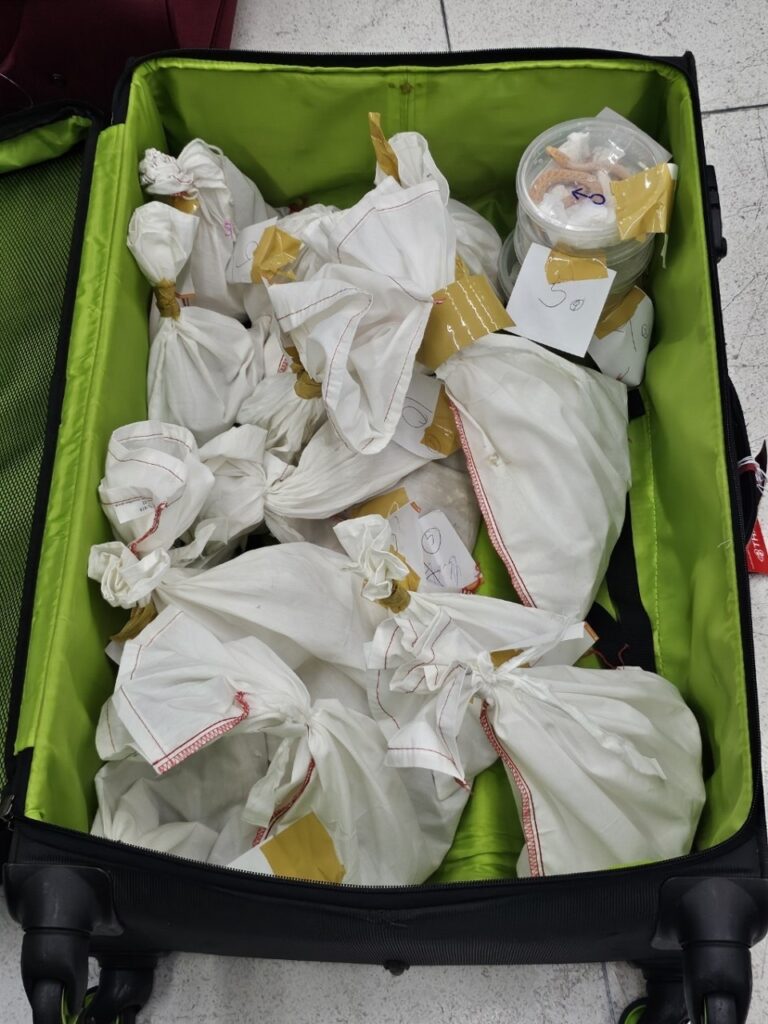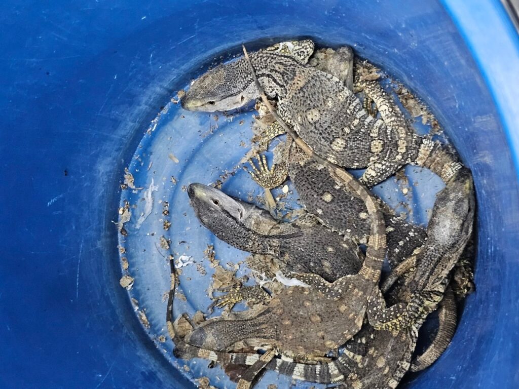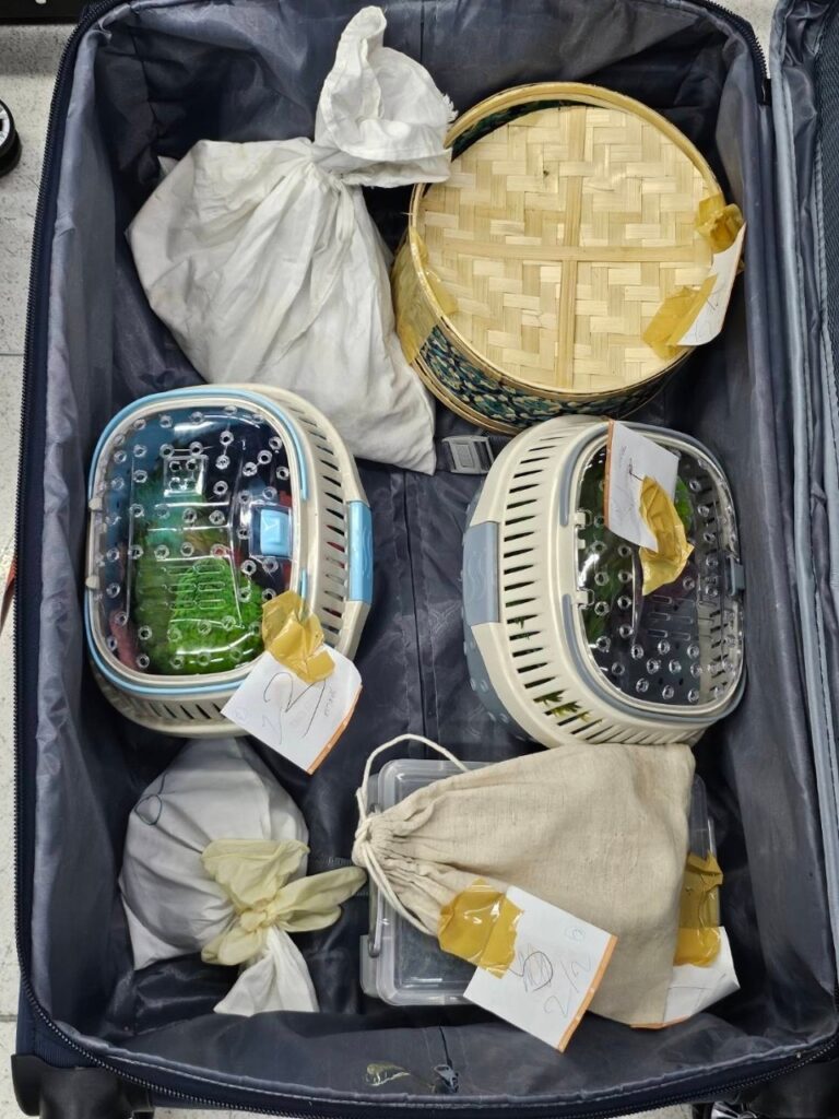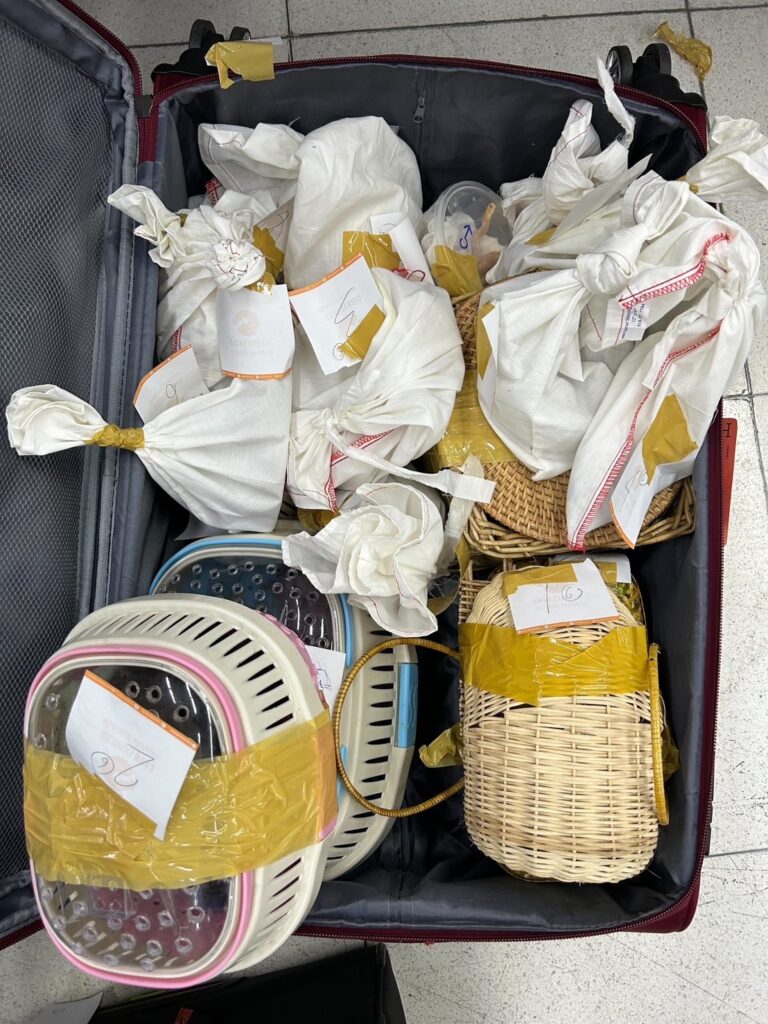 โดยพบสัตว์เลื้อยคลานและสัตว์เลี้ยงลูกด้วยนม ได้แก่ กิ้งก่า (Black Throat Monitor,อื่น ๆ) 29 ตัว,งู (Corn Snake, Red Bamboo, อื่นๆ) 21 ตัว,นก (Bird of Paradise,นกแก้วปากใหญ่,อื่น ๆ) 15 ตัว,ตะกวด 7 ตัว,จิ้งเหลน 4 ตัว,กระรอกตาแดง 2 ตัว,ค้างคาว 2 ตัว,ลิงหัวสำลี (Cotton Top) 2 ตัว,เสือปลา 1 ตัว,แพนด้าแดง 1 ตัว,หมี Sulawesi Bear Cuscus 1 ตัว,กบ 1 ตัว และ หนู 1 ตัว รวมทั้งสิ้นจำนวน 87 ตัว โดยของกลางทั้งหมด ได้บรรจุซุกซ่อนอยู่ในกระเป๋าเดินทางที่ผู้โดยสารจะโหลดใต้ท้องเครื่อง