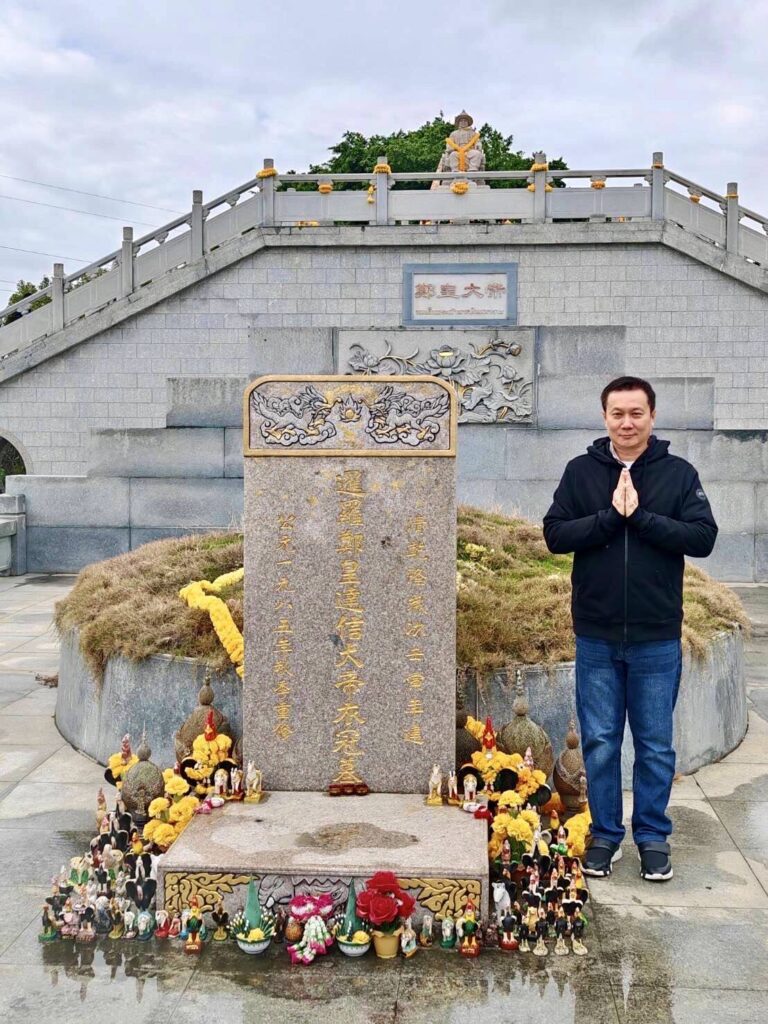 สำหรับที่เถ่งไฮ่ ซัวเถา เป็นบ้านเกิดบิดาของพระเจ้าตากสินมหาราช คนจีนแต้จิ๋วในยุคนั้น จึงภูมิใจและรักพระเจ้าตากสินดังเช่นคนไทย ชื่อจีนของพระเจ้าตากสินมีชื่อว่า แต่อ๊วง ตระกูลของพระเจ้าตากสินจึงมีแซ่ว่า ”แต้” ที่เมืองนี้มีหลุมฝังศพของพระเจ้าตากสิน แม้ว่าจะเรียกว่าเป็นหลุมศพ แต่เป็นเพียงที่ฝังเสื้อผ้าของท่านเท่านั้น สุสานแห่งนี้จึงมีความหมายต่อใจของคน ในเถ่งไฮ่ เพราะอุตส่าห์ส่งเสื้อผ้าของท่านข้ามน้ำข้ามทะเลมาจากไทย เพื่อมาสร้างหลุมศพที่นี่ ก็แสดงให้เห็นว่าคนจีนในไทยให้ความสำคัญกับพระเจ้าตากสินมาก