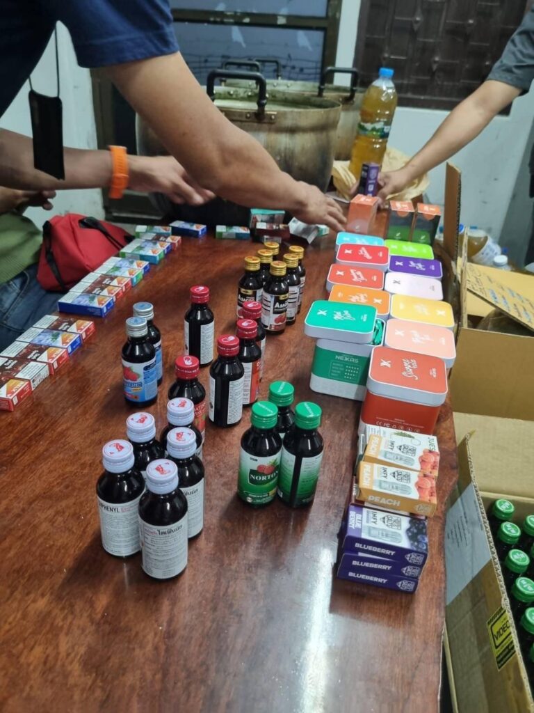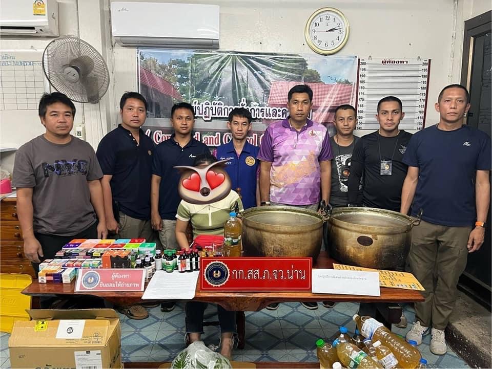 วันที่ 6 มีนาคม 2567 เวลาประมาณ 10.10 น. ชุดปฎิบัติการพิเศษฝ่ายปกครองจังหวัดน่าน นำโดย นายเอกชัย กังคำ ป้องกันจังหวัดน่าน ว่าที่ ร.อ.พลวัฒน์ โรงคำ นายณัฐพล พรมไชยะ ผู้ช่วยป้องกันจังหวัดน่าน นำกำลังพลสมาชิก อส.กองบังคับการกองอาสารักษาดินแดนจังหวัดน่าน ร่วมบูรณาการกับเจ้าหน้าที่กองกับการการสืบสวนสถานีตำรวจภูธรจังหวัดน่าน พ.ต ท. นิติภูมิ ผดุง รอง ผกก สส.ภ จ.น่าน , พ ต. ท.ตันติกร ดวงตา สว.สส.สภ.เรือง ร.ต.อ.ณัฐนันท์ พูลเพิ่ม รอง สว.ชุดปฏิบัติการ ภ.จ.น่าน และนายปียะพงศ์ มาแก้ว นักวิชาการสาธารณสุข เจ้าหน้าที่สาธารณสุขจังหวัดน่าน ได้จับกุมผู้ต้องหาที่มีพฤติการณ์ลักลอบจำหน่ายบุหรี่ไฟฟ้า, บารากู่, ยาอันตราย (นำไปผสมสูตร 4×100), ใบกระท่อม และน้ำกระท่อม โดยร้านอยู่บริเวณหลังโรงแรมเทวราช ถ.มหายศ ต.ในเวียง อ.เมืองน่าน จ.น่าน ซึ่งได้รับการร้องเรียนมาอย่างต่อเนื่องว่า ลักลอบจำหน่ายให้กับบุคคลทั่วไป โดยเฉพาะที่เป็นเด็ก เยาวชนจะนำไปดื่มกินและมั่วสุมในการกระทำผิดกฎหมาย จึงวางแผนเข้าทำการจับกุม น.ส. หากินกับเด็ก (นามสมมุติ) เจ้าของร้าน แห่งหนึ่งบริเวณหลังโรงแรมเทวราช ถ.มหายศ ต.ในเวียง อ.เมืองน่าน จ.น่าน