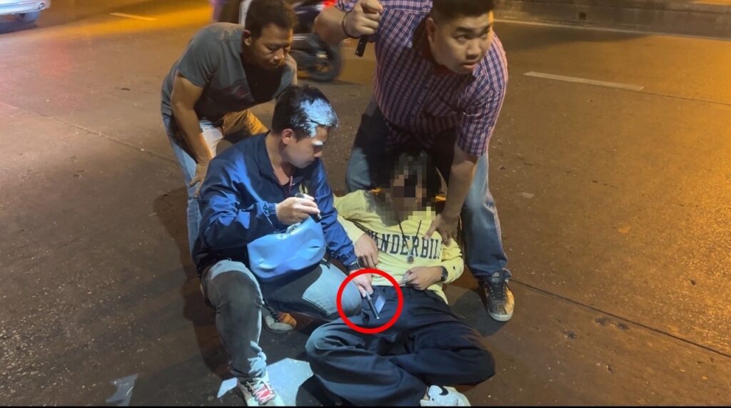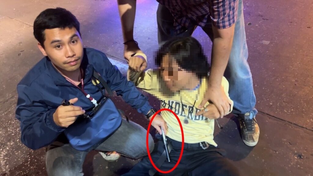 กระทั่งเวลา 00.30 น. เจ้าหน้าที่ชุดจับกุมได้ออกตรวจพื้นที่มาถึงใต้สะพานพุทธ ได้พบกับ ชายวันรุ่น กำลังยืนอยู่บนฟุตบาทใต้สะพานพุทธ มีลักษณะอาการพิรุธต้องสงสัย คล้ายมีสิ่งของผิดกฎหมาย ซุกซ่อนอยู่ ทางเจ้าหน้าที่ตำรวจชุดจับกุม จึงได้เรียกให้ ชายวัยรุ่นคนดังกล่าวหยุดพร้อมทั้งแสดงตัวเป็นเจ้าหน้าที่ตำรวจ แต่วัยรุ่นดังกล่าวเตรียมจะวิ่งหนีแต่ไม่ทัน ทราบชื่อนาย วีรภาพ หรือ ฟลุ๊ค และจากการตรวจค้นตัว พบ อาวุธปืน ไทยประดิษฐ์ แบบปืนปากกา ขนาด.38 มม. จำนวน 1 กระบอก ซุกซ่อนอยู่ในช่องกระเป๋ากางเกงซับใน ด้านหน้า ข้างขวา ซึ่งมี กางเกงขายาว สีดำ นุ่งทับอยู่
