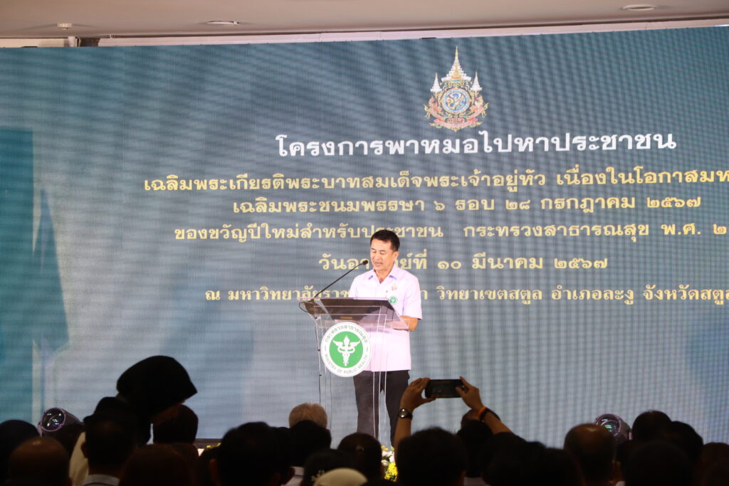 วันนี้ 10 มีนาคม 2567 ที่ มหาวิทยาลัยราชภัฏสงขลา วิทยาเขตสตูล อำเภอละงู จังหวัดสตูล นายแพทย์ชลน่าน ศรีแก้ว รัฐมนตรีว่าการกระทรวงสาธารณสุข เป็นประธานในพิธีเปิด “โครงการพาหมอไปหาประชาชน” เฉลิมพระเกียรติพระบาทสมเด็จพระเจ้าอยู่หัว เนื่องในโอกาสมหามงคล เฉลิมพระชนมพรรษาครบ 6 รอบ 28 กรกฎาคม 2567 โดยมี นายแพทย์โอภาส การย์กวินพงศ์ ปลัดกระทรวงสาธารณสุข นายศักระ กปิลกาญจน์ ผู้ว่าราชการจังหวัดสตูล นายแพทย์ชัยรัตน์ ลำโป นายแพทย์สาธารณสุขจังหวัดสตูล และคณะผู้บริหาร ร่วมพิธี