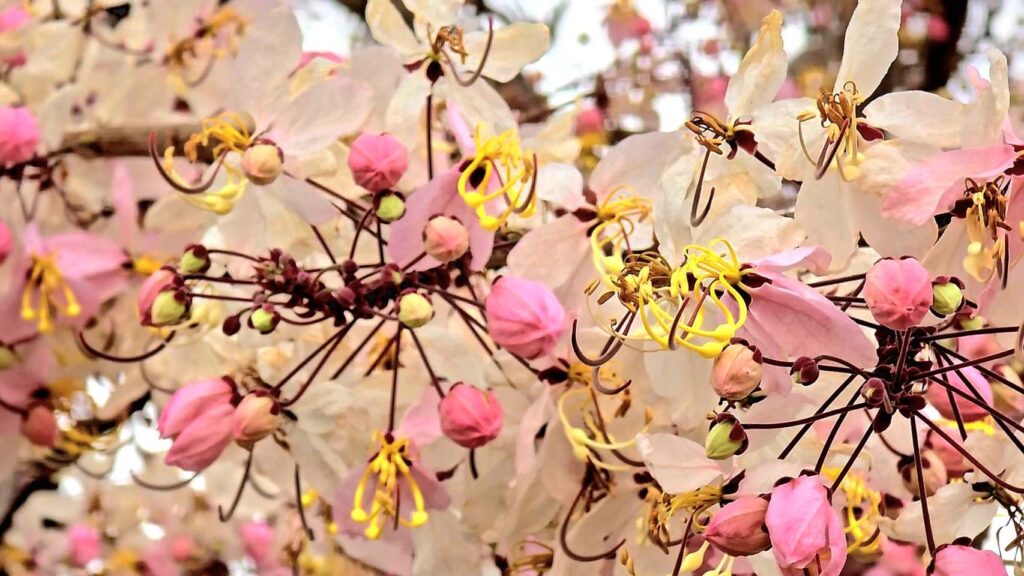 สำหรับดอกกัลปพฤกษ์ ออกดอกเป็นช่อกระจายตามกิ่งพร้อมกับแตกใบอ่อน ช่อดอก ยาวได้ประมาณ 5-10 เซนติเมตร มีขนสีเหลืองขึ้นปกคลุม ช่อดอกจะออกแน่นเป็นกลุ่มตลอดกิ่ง เมื่อเริ่มบานดอกจะเป็นสีชมพู แล้วจะเปลี่ยนเป็นสีชมพูเรื่อ ๆ จนถึงสีขาวเมื่อใกล้ร่วงโรย ประโยชน์ของกัลปพฤกษ์ ในสมัยก่อนจะใช้เนื้อในฝักกินกับหมาก ต้นกัลปพฤกษ์ จัดเป็นไม้มงคลที่มีรูปทรงสวยงาม ให้ดอกสวย ออกดอกดกเต็มต้น มีสีชมพูอ่อนสดใสดูงดงามเหมือนดอกเชอร์รี่ แต่ชาวบ้านที่นีจะเรียกว่า… “ซากุระ เมืองไทย”