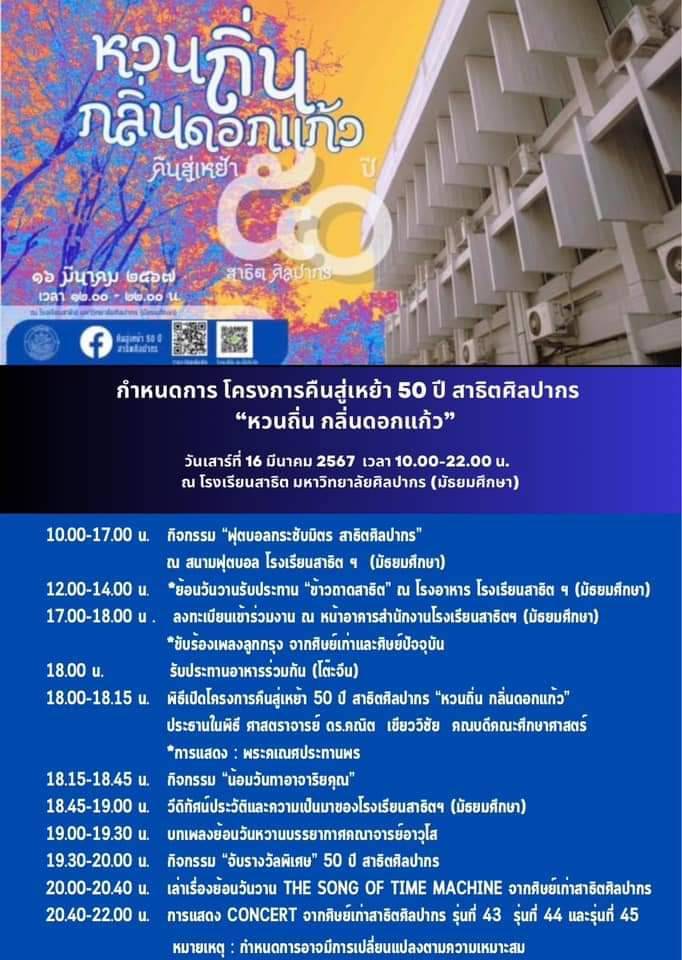 อ.ณัฐดนัย บุตรพลับ ผู้อำนวยการโรงเรียนสาธิตมหาวิทยาลัยศิลปากร (มัธยมศึกษา) ขอเชิญชวนศิษย์เก่าทุกรุ่นและศิษย์ปัจจุบัน มาพบปะสังสรรค์ร่วมงานคืนสู่เหย้า 50 ปี สาธิตศิลปากร “หวนถิ่น กลิ่นดอกแก้ว” ในเสาร์ที่ 16 มีนาคม 2567 ณ โรงเรียนสาธิต มหาวิทยาลัยศิลปากร (มัธยมศึกษา) พร้อมกับอีกงานที่สำคัญอย่างมาก ที่ทาง ผอ.และโรงเรียนตั้งใจจัดกิจกรรมนี้ขึ้นมาก็คือในวันอาทิตย์ที่ 17 มี.ค.2567 “เดินวิ่งการกุศล สาธิตฯศิลปากร มินิ-ฮาล์ฟมาราธอน 2024 ครั้งที่ 1” ชิงถ้วยรางวัลพระราชทานและเหรียญรางวัลพระราชทาน สมเด็จพระกนิษฐาธิราชเจ้า กรมสมเด็จพระเทพรัตนราชสุดาฯ สยามบรมราชกุมารี จึงขอเชิญชวนนักวิ่งมาราธอนจากทั่วทุกสารทิศ และศิษย์เก่า-ศิษย์ปัจจุบันทุกรุ่น มาร่วมงานกันอย่างพร้อมเพรียง