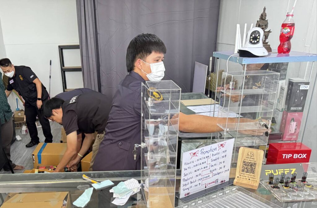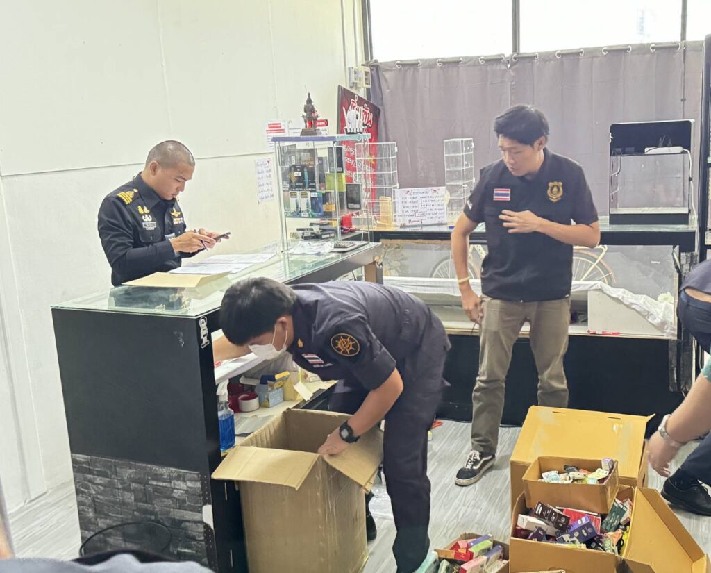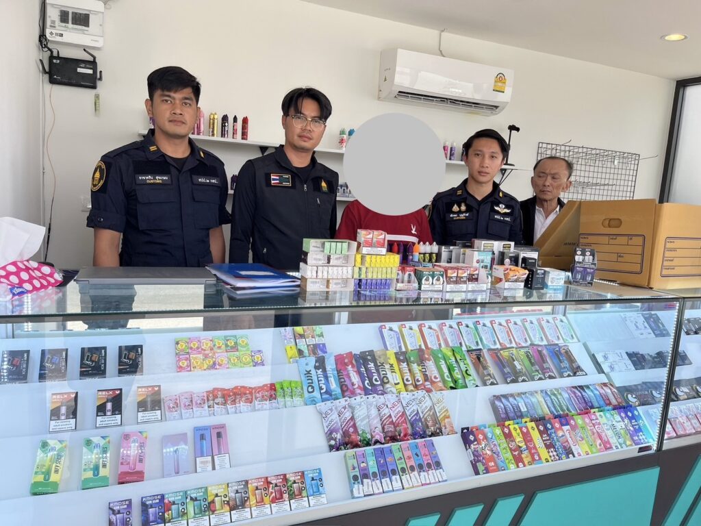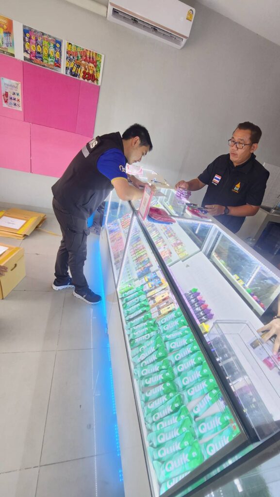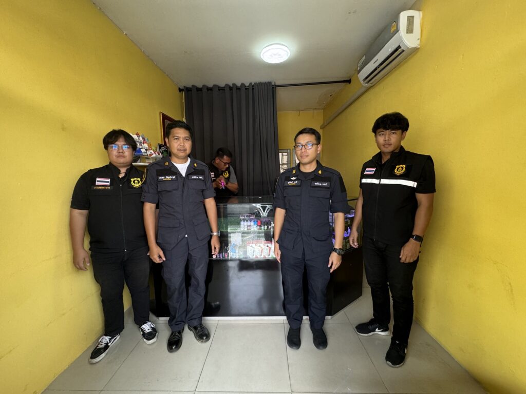 2.ร้านค้าตั้งอยู่ในตลาดทีมาร์เก็ต พบบุหรี่ไฟฟ้า จำนวน 549 ชิ้น น้ำยาบุหรี่ไฟฟ้า 760 ชิ้น และอุปกรณ์อื่นๆ จำนวน 402 ชิ้น รวมจำนวน 1,711 ชิ้น มูลค่า 330,000 บาท