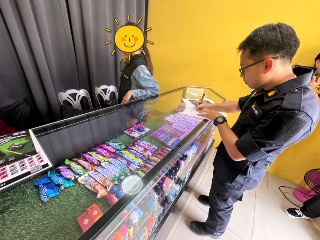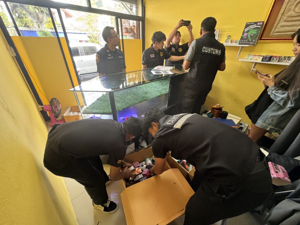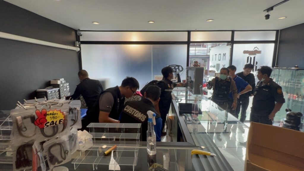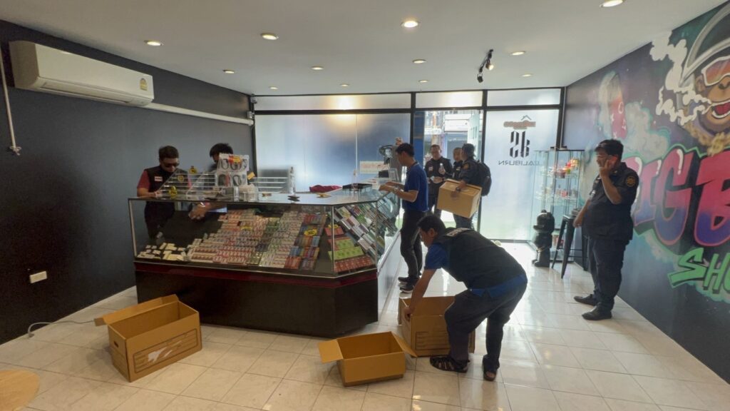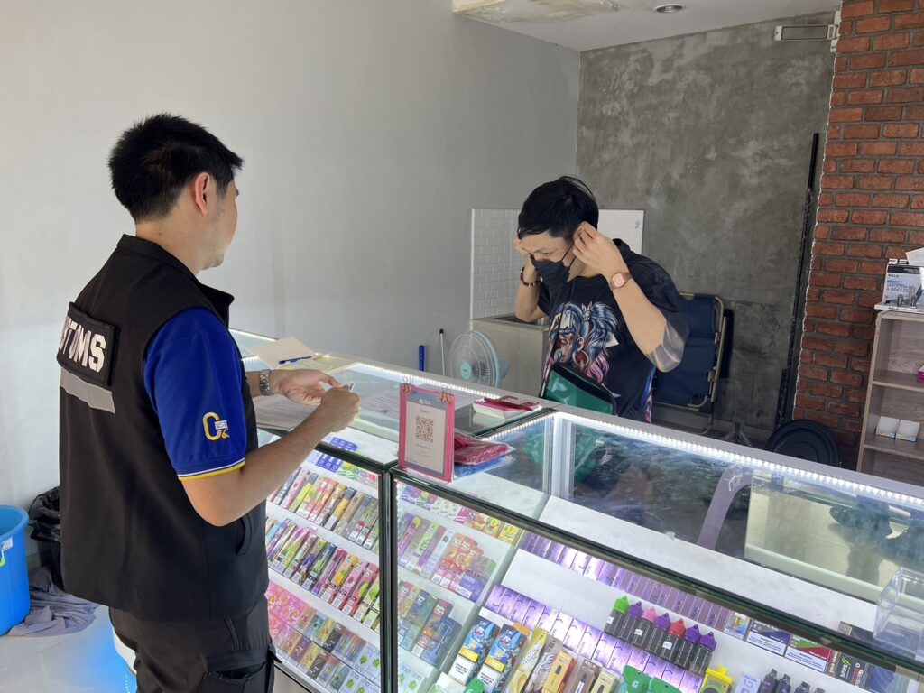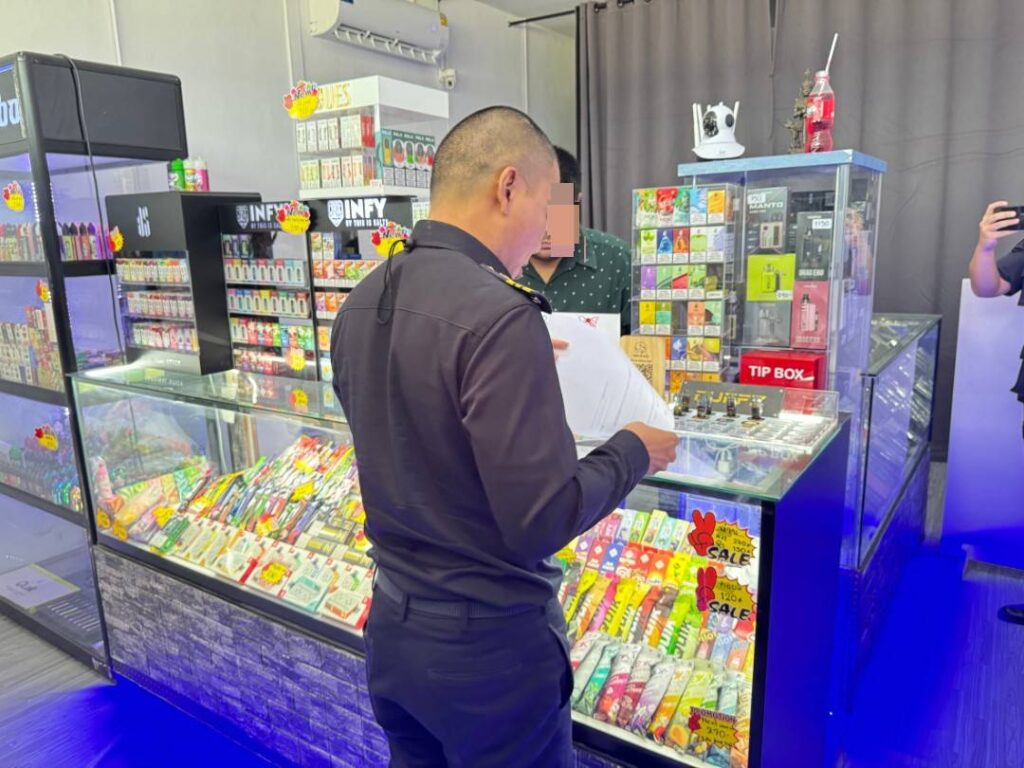 2.ร้านค้าตั้งอยู่ในตลาดทีมาร์เก็ต พบบุหรี่ไฟฟ้า จำนวน 549 ชิ้น น้ำยาบุหรี่ไฟฟ้า 760 ชิ้น และอุปกรณ์อื่นๆ จำนวน 402 ชิ้น รวมจำนวน 1,711 ชิ้น มูลค่า 330,000 บาท