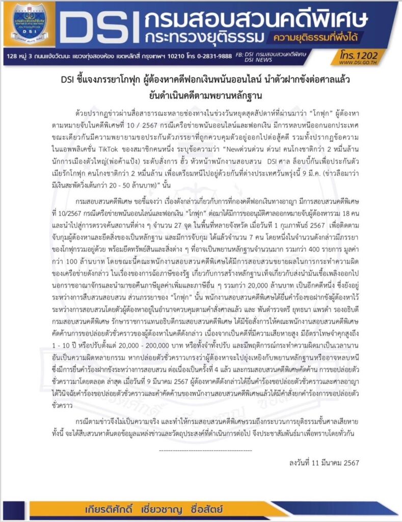 ด้วยปรากฏข่าวผ่านสื่อสาธารณะหลายช่องทางในข่วงวันหยุดสุดสัปดาห์ที่ผ่านมาว่า “โกฟุก” ผู้ต้องหาตามหมายจับในคดีพิเศษที่ 10 / 2567 กรณีเครือข่ายพนันออนไลน์และฟอกเงิน มีการหลบหนีออกนอกประเทศขณะเดียวกันมีความพยายามขอประกันตัวภรรยาที่ถูกควบคุมตัวอยู่ออกไปต่อสู้คดี รวมทั้งปรากฏข้อความในแอพพลิเคชั่น TikTok ของสมาชิกคนหนึ่ง ระบุข้อความว่า “Newด่วนด่วน ด่วน! คนโกงชาติกว่า 2 หมื่นล้าน นักการเมืองตัวใหญ่ (พ่อค้าแป้ง) ระดับสั่งการ ฮั้ว หัวหน้าพนักงานสอบสวน,DSI,ศาล ล็อบบี้กันเพื่อประกันตัวเมียรักโกฟุก คนโกงชาติกว่า 2 หมื่นล้าน เพื่อเตรียมหนีไปอยู่ด้วยกันที่ต่างประเทศวันพรุ่งนี้ 9 มี.ค. (ข่าวลือมาว่ามีเงินสะพัดวิ่งเต้นกว่า 20 – 50 ล้านบาท)” นั้น