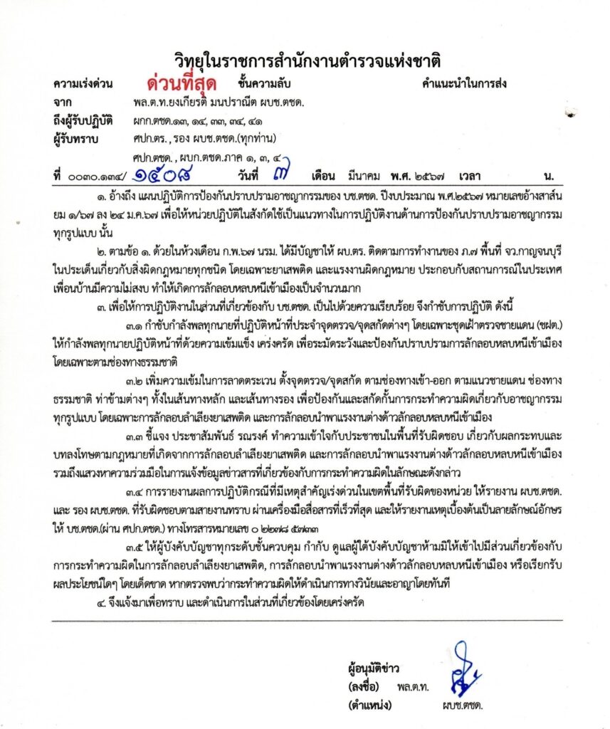 (2.) ตามข้อ 1 ด้วยในห้วงเดือน ก.พ.2567 นายกรัฐมนตรีได้มีบัญชาให้ ผบ.ตร. ติดตามการทำงานของ ภ.7 พื้นที่ จ.กาญจนบุรี ในประเด็นเกี่ยวกับสิ่งผิดกฎหมายทุกชนิด โดยเฉพาะยาเสพติด และแรงงานผิดกฎหมาย ประกอบกับสถานการณ์ในประเทศ เพื่อนบ้านมีความไม่สงบ ทำให้เกิดการลักลอบหลบหนีเข้าเมืองเป็นจำนวนมาก