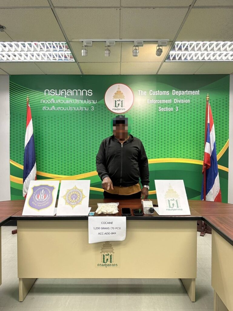 และจากการผนึกกำลังร่วมกับ AITF อย่างต่อเนื่อง ในวันที่ 10 มีนาคม 2567 กรมศุลกากร โดยเจ้าหน้าที่กองสืบสวนและปราบปราม ร่วมกับสำนักงานศุลกากรตรวจของผู้โดยสารท่าอากาศยานสุวรรณภูมิ ได้ตรวจพบบัญชีรายชื่อผู้โดยสารที่มีความเสี่ยงในการลักลอบลำเลียงยาเสพติดเข้ามาในประเทศ เพศชาย สัญชาติไนจีเรียน เดินทางจากกรุงแอดดิสอาบาบา สหพันธ์สาธารณรัฐประชาธิปไตยเอธิโอเปีย ปลายทางท่าอากาศยานสุวรรณภูมิ ประเทศไทย เมื่อผู้โดยสารที่ต้องสงสัยเดินทางมาถึง เจ้าหน้าที่ได้ขอตรวจสอบกระเป๋าสัมภาระและร่างกาย เห็นว่าผู้ต้องสงสัยแสดงอาการพิรุธ จึงส่งตัวเข้าตรวจสอบพิสูจน์โดยละเอียด ผลปรากฎ พบยาเสพติดให้โทษประเภท 2 (โคคาอีน) ซุกซ่อนอยู่ภายในร่างกายโดยวิธีการกลืน จำนวน 70 ก้อน น้ำหนักรวมสิ่งห่อหุ้ม 1,230 กรัม มูลค่า 3,690,000 บาท เจ้าหน้าที่ชุดจับกุมจึงทำบันทึกจับกุมและนำตัวส่งพนักงานสอบสวนสถานีตำรวจภูธรท่าอากาศยานสุวรรณภูมิเพื่อดำเนินคดีต่อไป