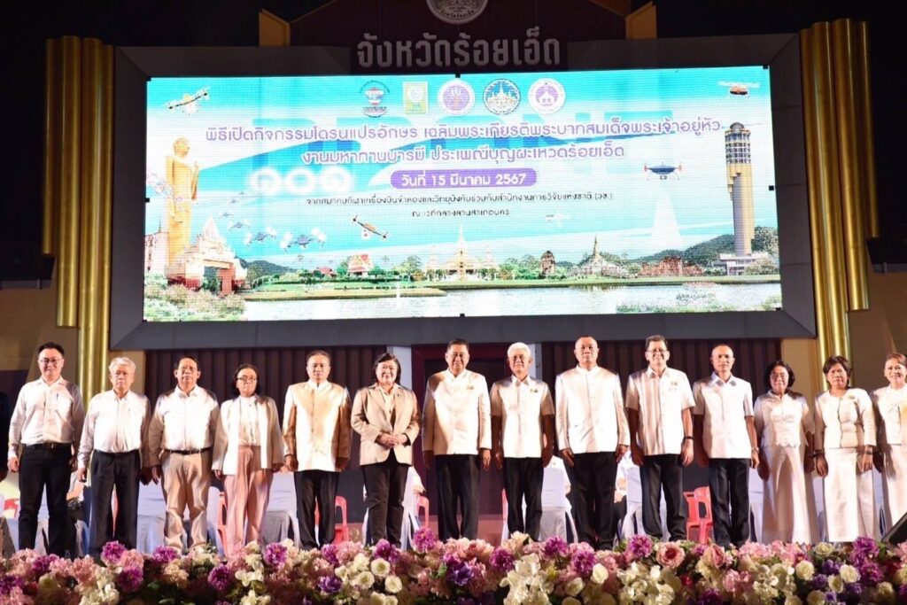 เมื่อวันที่ 15 มีนาคม 2567 สำนักงานการวิจัยแห่งชาติ (วช.) กระทรวงการอุดมศึกษา วิทยาศาสตร์ วิจัยและนวัตกรรม (อว.) ร่วมกับ สมาคมกีฬาเครื่องบินจำลองและวิทยุบังคับ และจังหวัดร้อยเอ็ด จัดพิธีเปิดกิจกรรมการส่งเสริมการนำนวัตกรรมโดรนแปรอักษรเพื่อการท่องเที่ยว เฉลิมฉลองงานบุญสุดยิ่งใหญ่ “มหาทานบารมี ประเพณีบุญผะเหวด ร้อยเอ็ด ประจำปี 2567” โดยมี นายทรงพล ใจกริ่ม ผู้ว่าราชการจังหวัดร้อยเอ็ด เป็นประธาน ร่วมด้วย นายบรรจง โฆษิตจิรนันท์ นายกเทศมนตรีเมืองร้อยเอ็ด และดร.วิภารัตน์ ดีอ่อง ผู้อำนวยการสำนักงานการวิจัยแห่งชาติ (ผอ.วช.) ณ บึงพลาญชัย จังหวัดร้อยเอ็ด