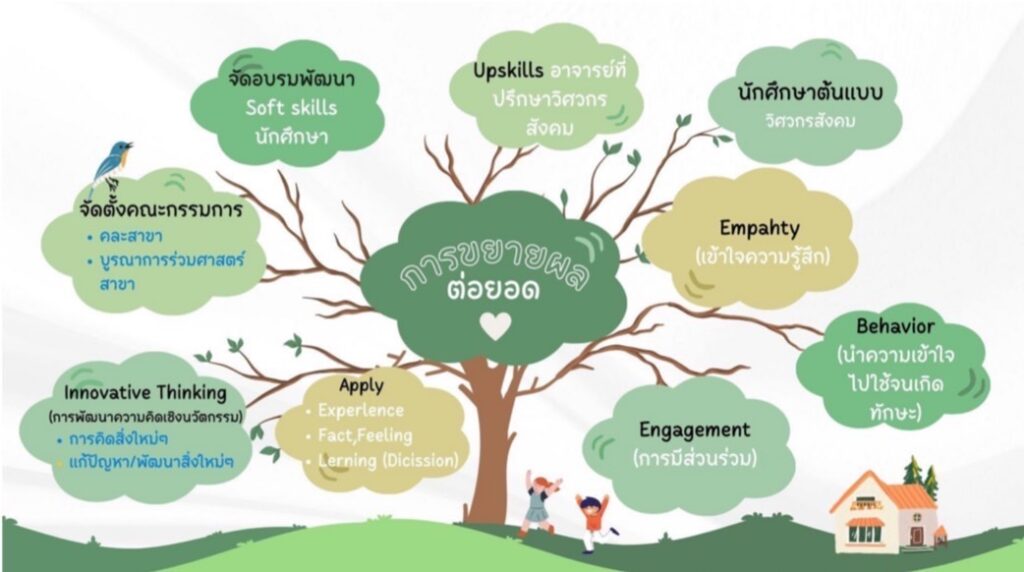 ทั้งนี้ คณะผู้ทรงคุณวุฒิจาก (วช.) ได้ให้ความคิดเห็นกับโครงการดังกล่าว ซึ่งได้นำทักษะด้านศาสตร์สาขาที่เรียนมาบูรณาการการทำงานร่วมกันกับชุมชนในการสร้างฝายกั้นน้ำเป็นการน้อมนำศาสตร์พระราชามาบูรณาการร่วมกับความรู้และทักษะของนักศึกษาวิศวกรสังคม ในการแก้ไขปัญหาของชุมชน อีกทั้งก่อให้เกิดประโยชน์ต่อส่วนรวม จะเห็นได้ว่าการนำหลักคิดในการสร้างฝายกั้นน้ำจะนำไปสู่ความเข้าใจในการชะลอการไหลของกระแสน้ำ การลดการชะล้างพังทลายของตลิ่ง รวมไปถึงการอนุรักษ์พรรณพืชและสัตว์ป่า และสร้างความชุ่มชื้นให้แก่ชุมชนอย่างเป็นขั้นเป็นตอน