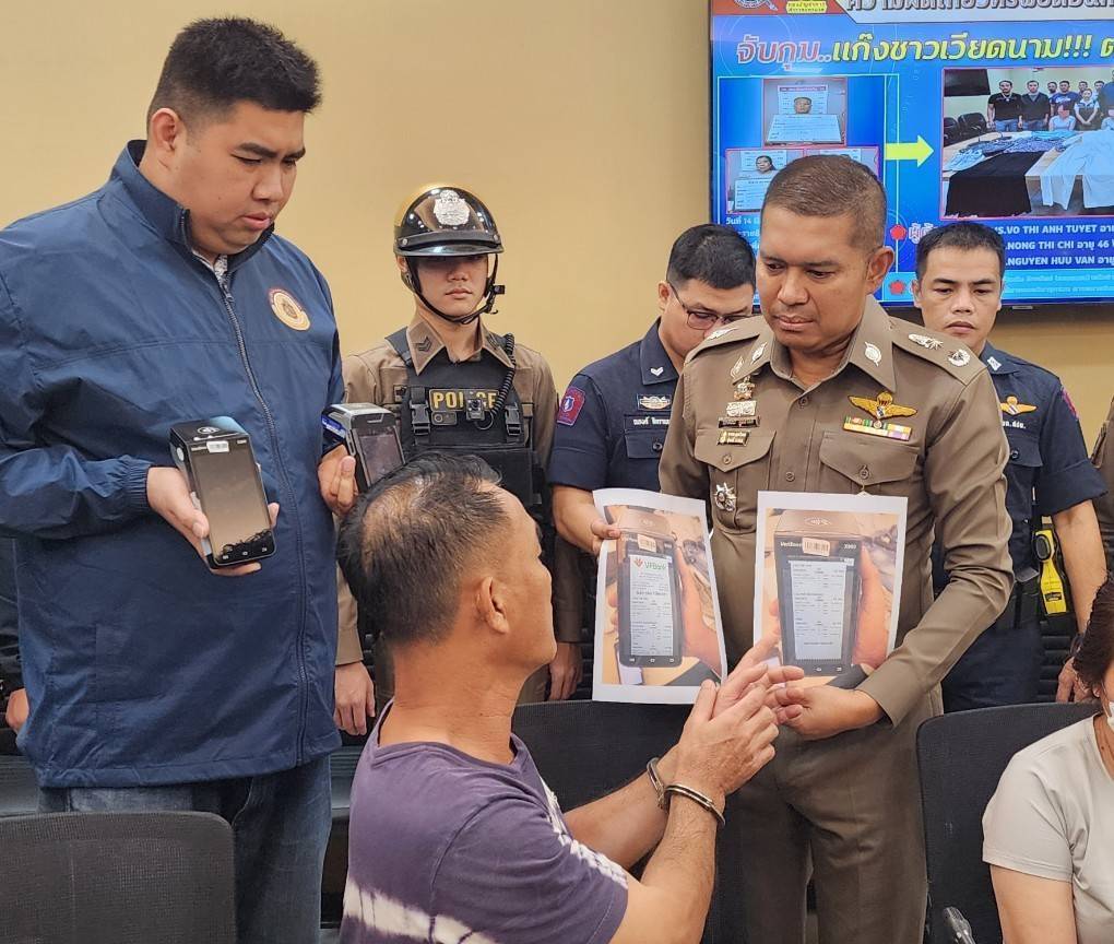 วันที่15มี.ค.67เวลา11.00น. พล.ต.ต.นพศิลป์ พูลสวัสดิ์ รองผบช.น. พล.ต.ต. สามารถ พรหมชาติ ผบก.น6. พ.ต.อ.วิชัย สนสกุล ผกก.สส.บกน.1 พ.ต.ท.ไพศาล เดชกัลยา รองผกก.สส.สนพระราชวัง แถลงผลการจับกุมแก๊งชาวเวียดนามลักทรัพย์นักท่องเที่ยวภายในวัด น.ส.โว ธิ อานห์ ทูเยท อายุ 59 ปี , น.ส.นอง ธิ ชิ อายุ 46 ปี และนายกูเยน ฮู วาน อายุ 53 ปี ทั้ง 3 เป็นชาวเวียดนาม พร้อมของกลางเสื้อผ้าเครื่องแต่งกายของผู้ต้องหาในวันเกิดเหตุ, เครื่องรูดบัตรจำนวน 2 เครื่อง และ กระดาษปริ้นสลิปใบเสร็จ 19 ม้วน