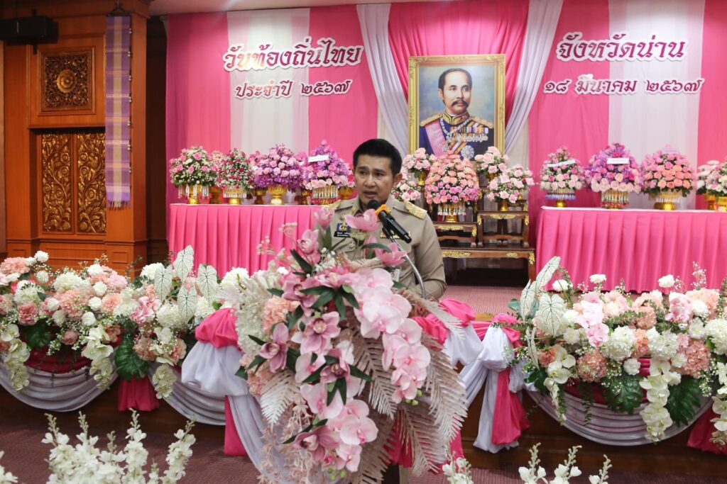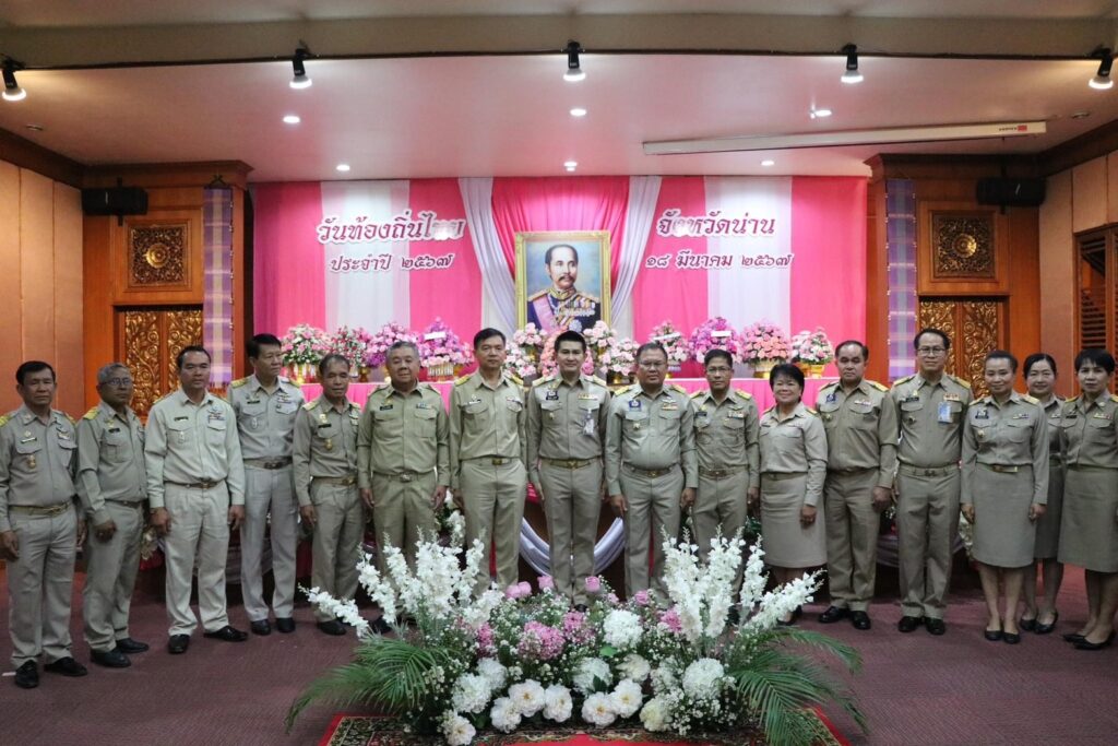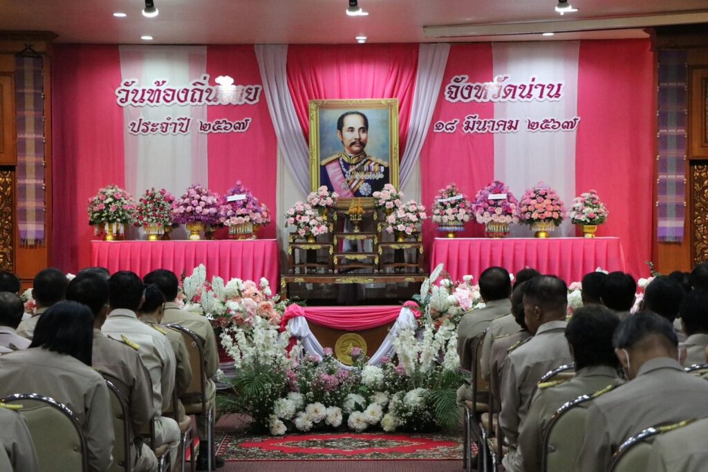วันที่ 18 มีนาคม 2567 ที่ ห้องประชุม 1 สำนักงานเทศบาลเมืองน่าน นายชัยนรงค์ วงศ์ใหญ่ ผู้ว่าราชการจังหวัดน่าน เป็นประธานในพิธีวางพานพุ่มถวายราชสักการะ พระบาทสมเด็จพระจุลจอมเกล้าเจ้าอยู่หัว เนื่องในวันท้องถิ่นไทยประจำปี 2567 พร้อมด้วยหัวหน้าส่วนราชการสังกัดกระทรวงมหาดไทย ผู้บริหารองค์กรปกครองส่วนท้องถิ่น และเจ้าหน้าที่ เข้าร่วมพิธี