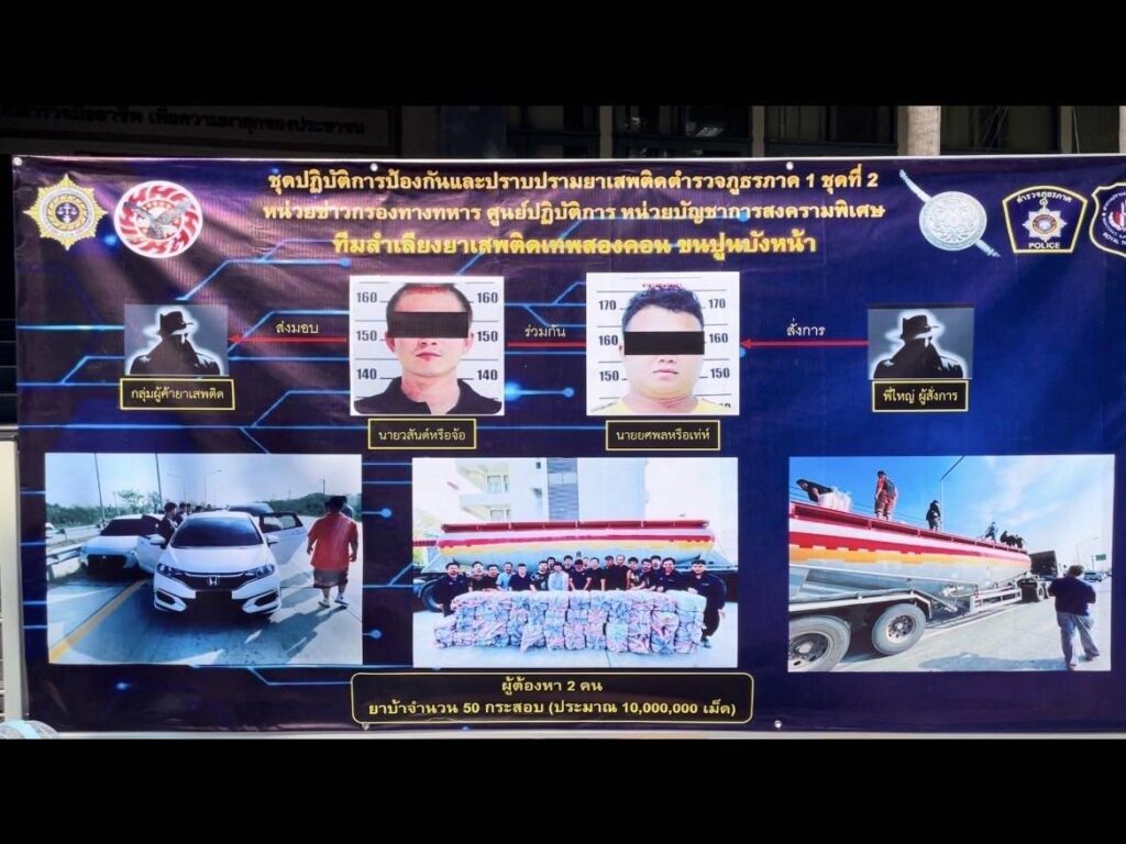 ในการสำรวจเส้นทางด่านตรวจยาเสพติดของเจ้าหน้าที่ตำรวจ เจ้าหน้าที่ชุดจับกุมจึงสะกดรอยติดตามจนถึงบริเวณริมถนนเลี่ยงเมืองลพบุรี (ขาเข้า สระบุรี) ม.6 ต.ป่าตาล อ.เมืองลพบุรี จ.ลพบุรี เจ้าหน้าที่ชุดจับกุม จึงเข้าแสดงตนเข้าตรวจสอบ และสามารถจับกุมตัวผู้ต้องหาได้พร้อมของกลาง ดังนี้ ยาเสพติดให้โทษประเภท 1 (ยาบ้า) จำนวน 50 กระสอบ รวมจำนวน 5,000 มัด ประมาณ 10,000,000 เม็ด,รถบรรทุก HINO สีขาว จำนวน 1 คัน (ใช้ลำเลียงยาเสพติด),รถยนต์ยี่ห้อฮอนด้า แจ๊ส สีขาว จำนวน 1 คัน (ใช้สำรวจเส้นทาง) และ อาวุธปืนสั้นกึ่งอัตโนมัติ SIG SAUER P320SP ขนาด 9 มม. บรรจุกระสุนจำนวน 14 นัด