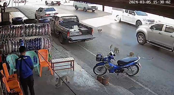กล้องวงจรปิดจับได้อีกแล้วเจ้าจ๋อศาลพระกาฬกระโดดแย้งของชาวบ้านขณะขับรถจักยานยนต์กลับบ้านทำรถล้ม กับข้าวถูกแย้งรถเสียหายตัวบาดเจ็บ
