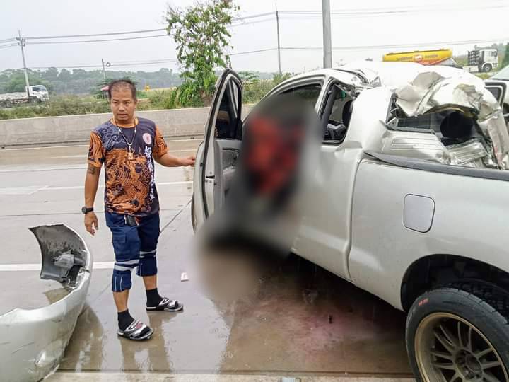 ร้อยตำรวจเอกศักดิ์สิทธิ์ บุญรับ ร้อยเวรสอบสวน สภ.ลาดหลุมแก้ว ได้รับแจ้งจากประชาชนว่ามีรถกระบะเสียหลักชนเสาไฟฟ้า บริเวณหน้าปั๊มเชลล์ ถนนตลิ่งชัน-สุพรรณบุรี มุ่งหน้าบางบัวทอง จึงเดินทางไปตรวจสอบที่เกิดเหตุ พร้อมด้วยรถกู้ชีพองค์การบริหารส่วนตำบลหน้าไม้และอาสามูลนิธิปอเต็กตึ้ง ที่เกิดเหตุพบรถกระบะ Toyota สีบรอนซ์ หมายเลขทะเบียน ตธ 7913 กรุงเทพมหานคร สภาพข้างรถกระบะด้านขวาได้รับความเสียหาย และพบผู้เสียชีวิต 1 ราย ทราบชื่อ นางสาว พรรณธิภา เต็มเกษม อายุ 43 ปี ชาวบุรีรัมย์ ส่วนผู้บาดเจ็บบาดทราบชื่อ นายจิรศักดิ์ สิลินทบูรณ์ อายุ 45 ปี เป็นคนขับ เป็นชาวบุรีรัมย์มีบ้านพักอยู่ใน อ.คลองหลวง กู้ชีพโรงพยาบาลลาดหลุมแก้วนำส่งโรงพยาบาล ซึ่งผู้เสียชีวิตและบาดเจ็บเป็นหัวหน้าห้องคลัง ในบริษัทเอกชนแห่งหนึ่ง ย่าน อ.ลาดหลุมแก้ว ทางด้านร้อยเวรสอบสวนได้ตรวจสอบที่เกิดเหตุพร้อมบันทึกภาพไว้เป็นหลักฐาน เนื่องจากที่เกิดเหตุมีฝนตกและถนนเปียกมีน้ำขัง เก็บภาพไว้เป็นหลักฐาน ได้ตรวจสอบกล้องวงจรปิดใกล้เคียงได้บันทึกภาพขณะรถกระบะลื่นไถล ควบคุมรถไม่ได้ จึงเสียหลักฟาดเสาไฟฟ้า ทำให้แฟนที่นั่งมาด้วยเสียชีวิตดังกล่าว และให้อาสาสมัครมูลนิธิปอเต็กตึ้งนำร่างผู้เสียชีวิตส่งนิติวิทยาศาสตร์ กระทรวงยุติธรรม พร้อมจะประสานญาติมารับศพไปทำพิธีทางศาสนาต่อไป.