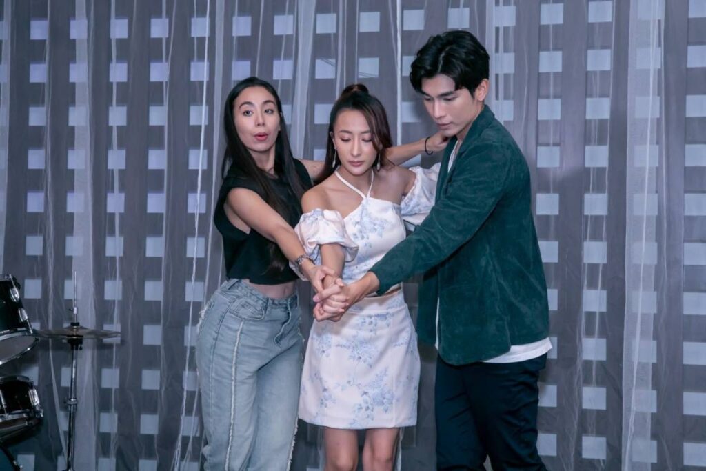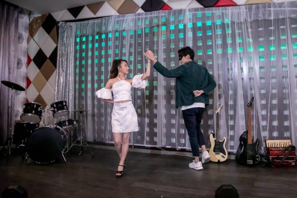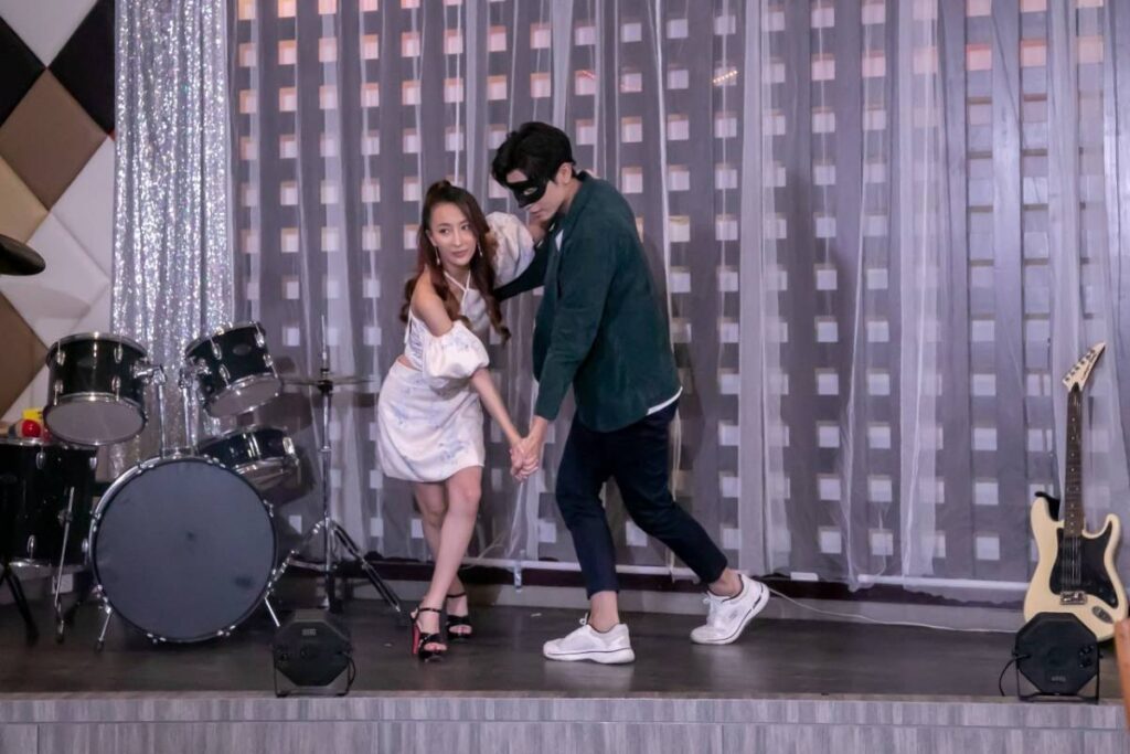 ผู้กำกับฯ และทีมงานใช้พื้นที่ของมหาวิทยาลัยกรุงเทพธนบุรี เป็นสถานที่ถ่ายทำ โดยเซ็ทขึ้นเป็นร้านอาหารสุดหรู มีผู้จัดการร้านและบริกรใส่ชุดเต็มยศ ยืนหล่อคอยรับบริการ ก่อนถ่ายทำผู้กำกับฯ ให้สองนักแสดง หนุ่มมิว กับ สาวเปียโน ขึ้นซ้อมเต้นบนเวทีก่อน โดยมีครูสอนเต้นมาช่วยนเทรน โดยทำการซ้อมอยู่ 2-3 รอบ จนนักแสดงมั่นใจแล้ว ก็ขอถ่ายทำฉากบนเวทีก่อน โดยมีเหล่านักแสดงอย่าง คุณนายทองคำ, ทองกวาว, บุปผา, ธรรมรัตน์ และศิระ ร่วมเฟรมดูการเต้นบนเวทีด้วย