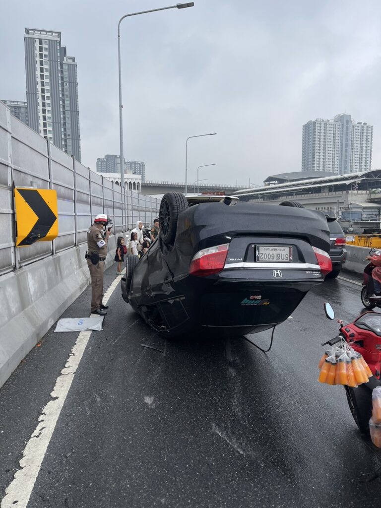 ได้รับแจ้งเหตุผ่านหมายเลขโทรศัพท์ 191เหตุรถเก๋งเสียหลักพลิกคว่ำ บริเวณ ต่างระดับเกือกม้า เพชรเกษม – ถนนราชพฤกษ์ มุ่งหน้าสาทร เกิดฝนตกหนักในพื้นที่ สน.ภาษีเจริญทำให้ถนนเปียกลื่นได้ส่งชุดปฏิบัติการเคลื่อนที่เร็ว ได้ตรวจสอบและให้การช่วยเหลือ รถยนต์นั่งส่วนบุคคล ทะเบียน 5กส 6002 กทม พลิกคว่ำ ไม่มีผู้ได้รับบาดเจ็บ