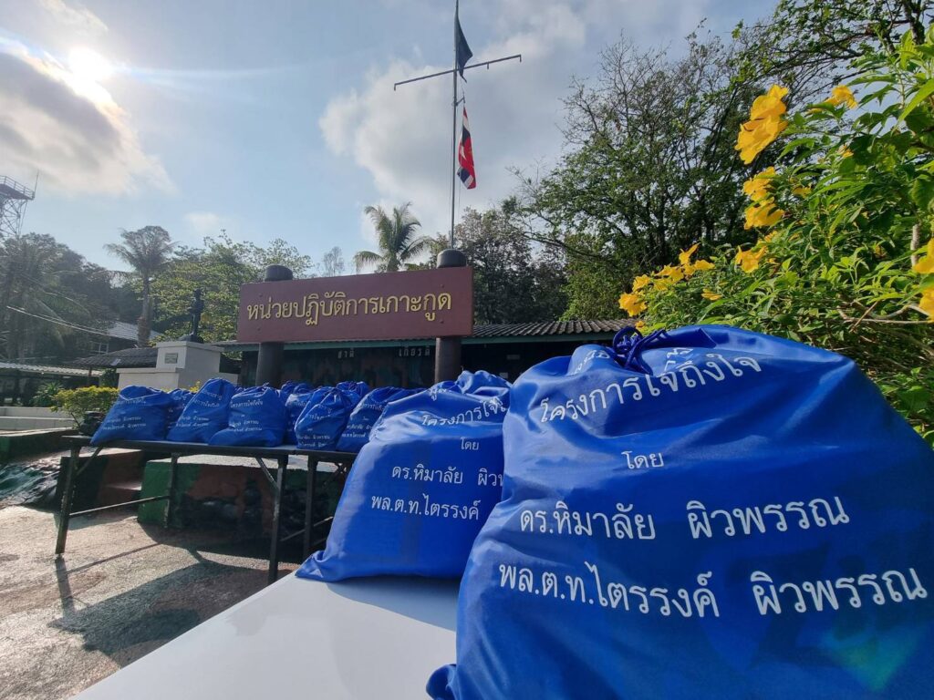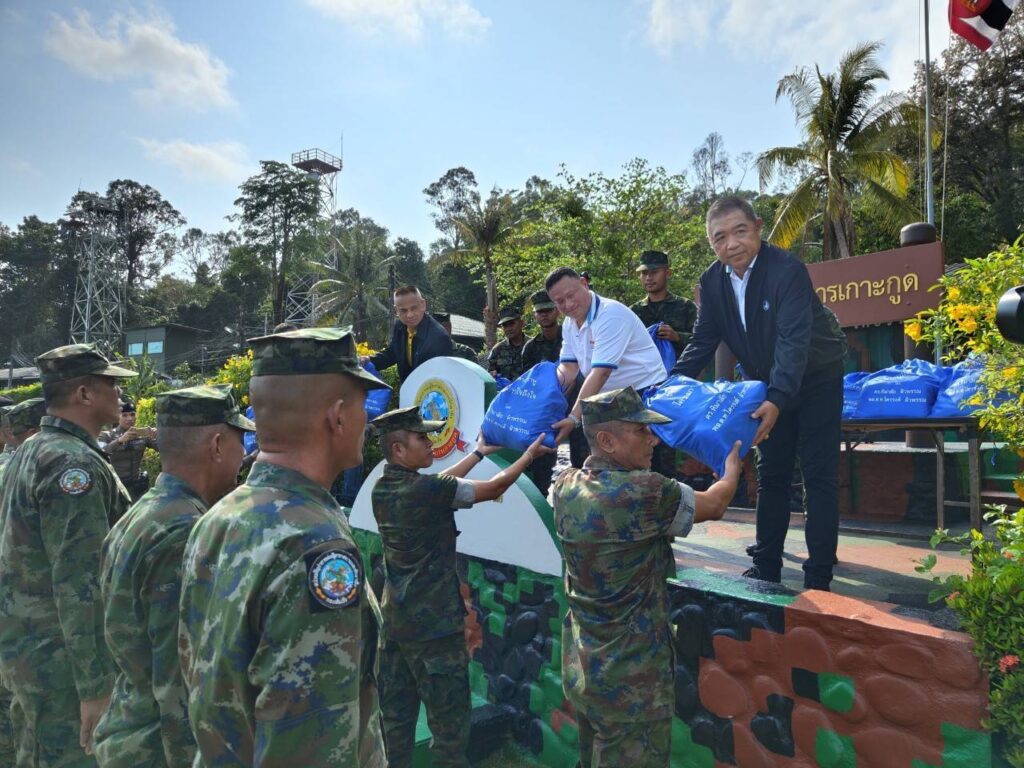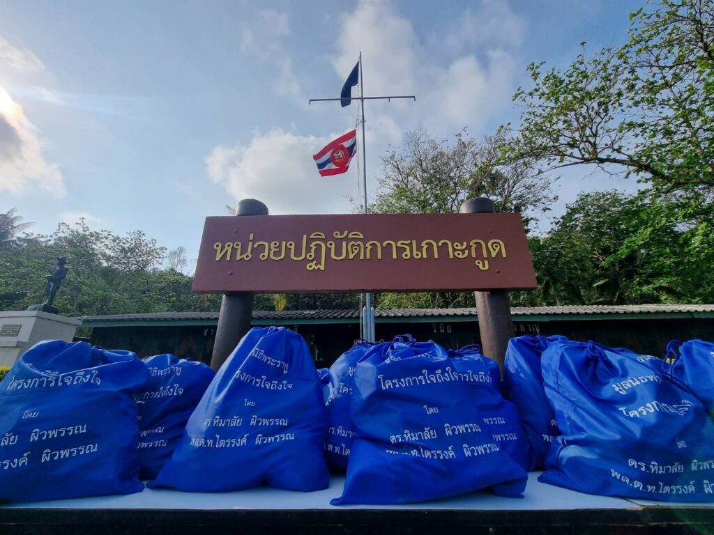 โดยมี พล.ร.ต.นิรัตน์ ทากุดเรือ ผู้บัญชาการศูนย์การฝึก หน่วยบัญชาการนาวิกโยธิน/ผู้บัญชาการโรงเรียนทหารนาวิกโยธินฯ พร้อมด้วย พ.ต.อ.ธนกฤษ พาภิรมย์ รอง ผบก.ภ.จ.ตราด พร้อมทั้งหน่วยปฏิบัติการเกาะกูด นำโดย น.ท.อนุรักษ์ คงคา (รน.),หน่วย ชพส. 1305ฯ นำโดย น.ต.ไพศาล ไคร่ครวญ (รน.),ชุดเฝ้าตรวจนาวิกโยธิน พื้นที่เกาะกูด นำโดย ร.ท.สุเมธ สีอินมน (รน.) และสภ.เกาะกูด นำโดย พ.ต.ท.คมสัน ศรีงิ้ว รอง ผกก.(ป) นำกำลังพลของหน่วยปฏิบัติการเกาะกูดและข้าราชการตำรวจ สภ.เกาะกูด ร่วมให้การต้อนรับและร่วมรับมอบถุงยังชีพ