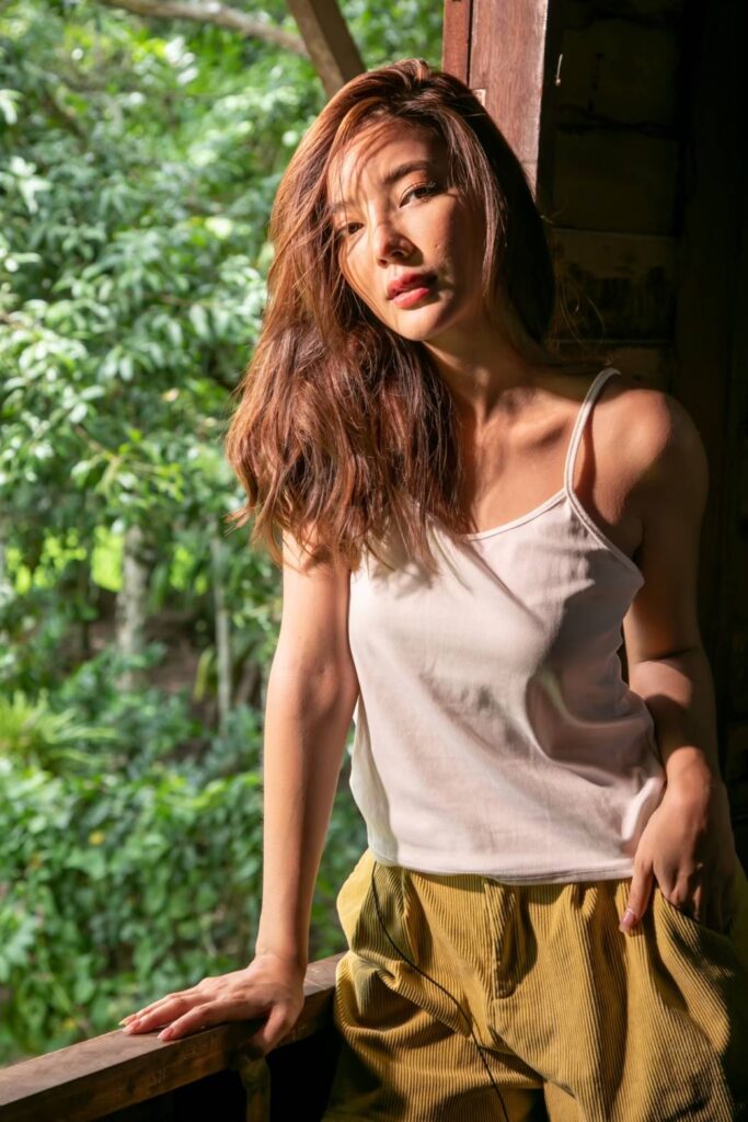 “หนูมองว่า มันดูตลกมากกว่า ไม่ได้ดูเซ็กซี่ หรือแบบนัวแบบจริงจังอะไรเบอร์นั้น เขินมั้ย ไม่นะ อย่างที่บอก มันนัวเนียแบบตลกๆ แล้วแบบ สายใจ ก็รู้ทั้งรู้ว่า พี่คล้าว ไม่ได้รัก แต่ก็ยังแอบนัว มีวางแผนนิดหน่อย ก็ฉันรักของฉันนี่ เล่นเรื่องสนุกดีค่ะ พอผู้กำกับฯ สั่ง คัท เราก็แบบแอบหัวเราะกันตลอด ส่วนกับ หมวดน้อย (ท็อป นรากร) นี่ก็แบบเชิดๆ รู้ว่าเขามาจีบ แต่ก็แบบเชิด ไม่ชอบ รักพี่คล้าวคนเดียว เขาก็ยังตื้อ ก็น่าสงสาร ร่วมงานกับ ท็อป ก็ดีค่ะ เขาดูน่ารัก แอบเขินหนูด้วย