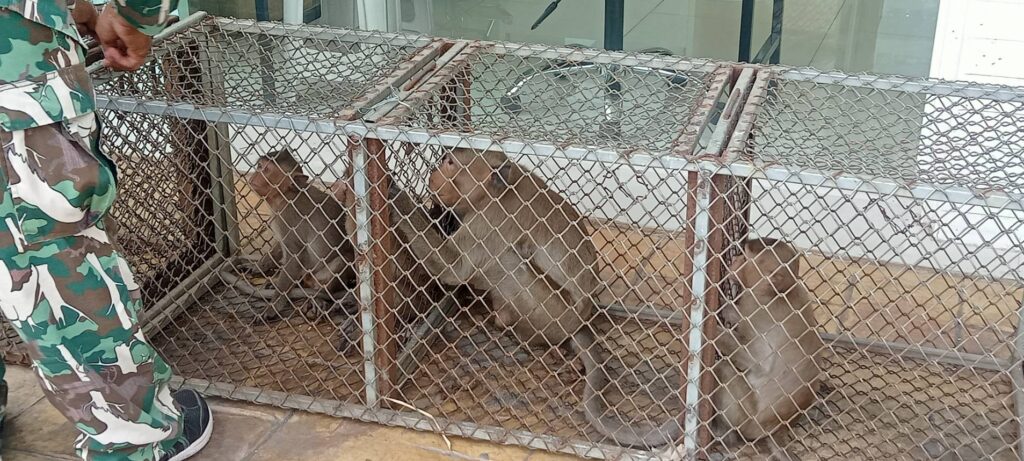 เมื่อเวลา 09 นาฬิกา ของวันจันทร์ที่ 25 มีนาคม 2567 บริเวณ หน้าร้านไพโรจน์สปอร์ต ตำบลท่าหิน อำเภอเมือง จังหวัดลพบุรี เจ้าหน้าที่ทรัพยากรธรรมชาติและสิ่งแวดล้อมนำกำลังกว่า 10 นายตั้งกรงดักลิงบริเวณถนนราชดำเนิน เขตเทศบาลเมืองลพบุรี หน้าร้านไพโรจน์สโตร์ซึ่งเป็นจุดเกิดเหตุเกเรแย้งของชาวบ้านจนได้รับบาดเจ็บและทำให้รถเสียหลักชนกันเมื่อวานที่ผ่านมา เกริกวิทย์ ภูมิพยัคฆ์ หัวหน้าเขตห้ามล่าสัตว์ป่าเขาสมโภชน์ ลพบุรี เปิดเผยว่า ทางกรมอุทยานได้สั่งให้เจ้าหน้าที่มาทำการดักจับลิงเกเรในพื้นที่เขตเทศบาลเมืองลพบุรีโดยครั้งแรกจะมีการใช้ปืนยิงยาสลบเพื่อจับลิงแต่จากการประเมินสถานการณ์แล้วไม่สามารถทำได้เนื่องจากหลังจากที่ยิงแล้วกว่าลิงจะหลับหรือสลบลงต้องใช้เวลามากกว่า 5 นาที นาทีซึ่งอาจทำให้ลิงปีนไปอยู่ยอดตึกหรือหนีไปหลบในฝูงใหญ่ทำให้ทั้งคนและลิงจะเกิดอันตรายทำให้ต้องเปลี่ยนแผนในการจับลิงด้วยการตั้งกรงแบบการดักหนูโดยใช้ข้าวโพดเป็นอาหารล่อให้ลิงเข้ามาติดในเบื้องต้นสามารถจับลิงได้แล้ว6-7ตัว แต่ต้องนำมาคัดแยกก่อนเพราะการดูด้วยตาเปล่าพบว่า เป็นลิงเล็กเสียส่วนใหญ่จึงต้องนำมาตรวจสอบอีกครั้งซึ่งตั้งเป้าไว้ในการทำงานตั้งแต่วันที่ 25 ถึง 27 มีนาคมนี้จะสามารถจับได้ไม่ต่ำกว่า 30 ตัวโดยจะย้ายจุดไปหลายจุดแล้วจะนำลิงทั้งหมดส่งไป อนุบาลที่จังหวัดนครนายกเนื่องจากสวนลิงโพธิ์เก้าต้นจังหวัดลพบุรีการปรับปรุงยังไม่เสร็จสมบูรณ์จึงต้องมีการนำลิงชุดไปที่นครนายกก่อน ไปตั้งนมเปรี้ยว เวลาต่อมาสังเกตการณ์ ทางเจ้าหน้าที่ ทรัพยากรธรรมชาติและสิ่งแวดล้อม กำลังหาลิงแสม ชื่อเจ้ายักษ์ ซึ่งเป็นจ่าฝูงดูแลฝูงลิงอยู่ในบริเวณนี้ ตั้งกรงและเอาข้าวโพดเป็นตัวล่อ อีกไม่นานเจ้ายักษ์ ลิงแสมจ่าฝูงติดกับ เข้าไปในกรง ตามมาด้วยลูกสมุนจำนวน 6 ตัว