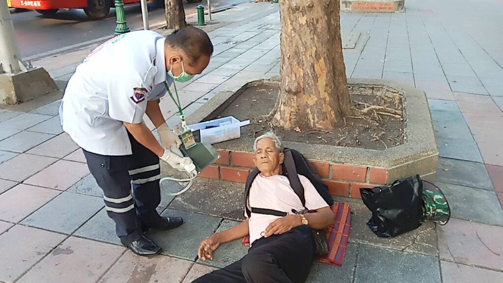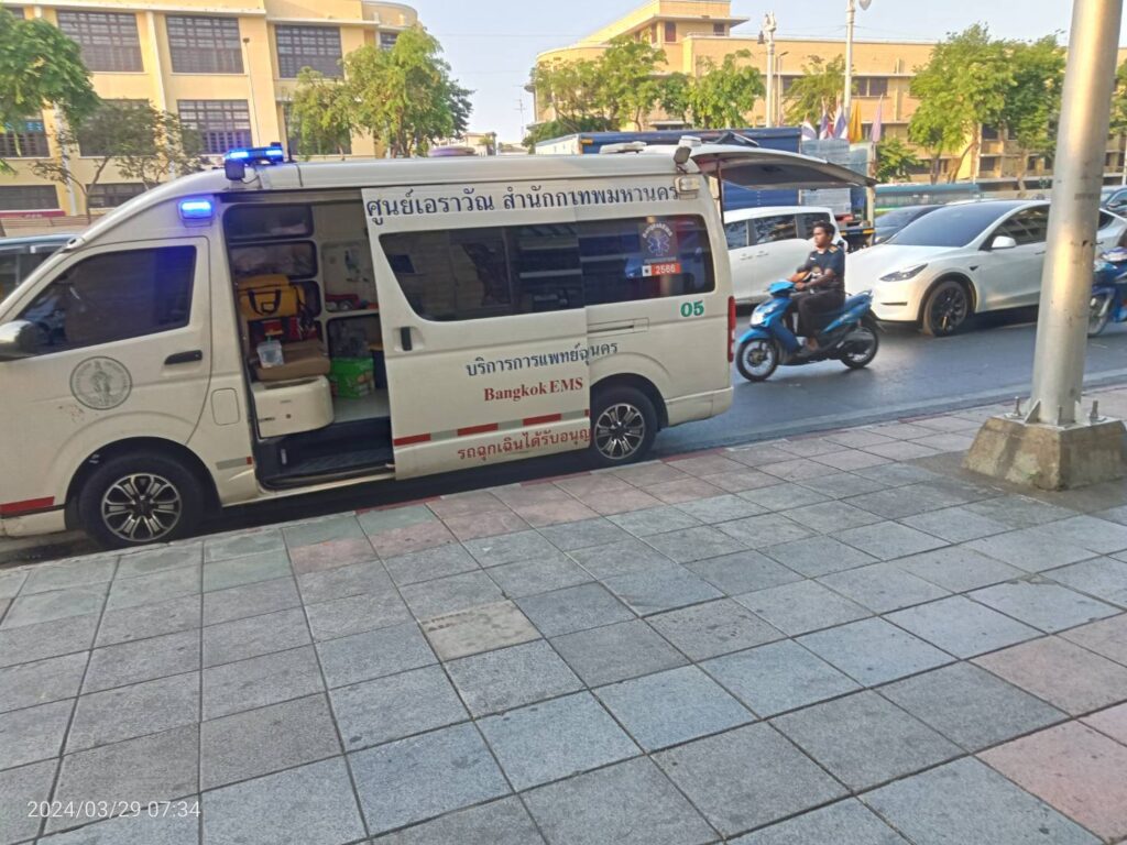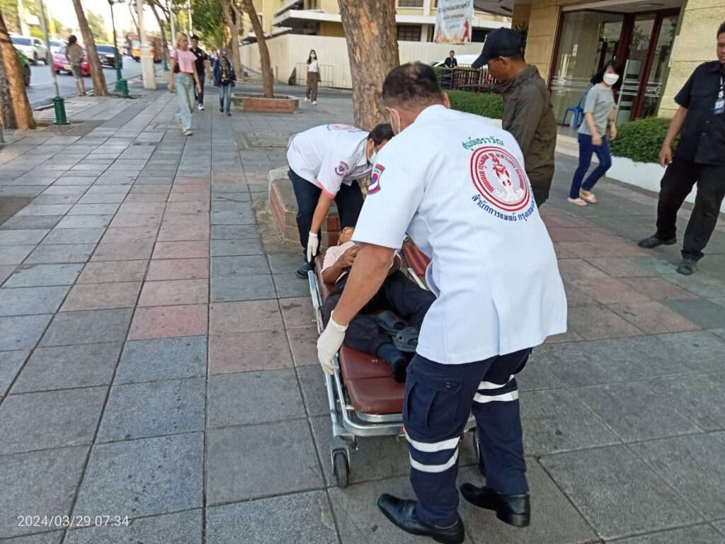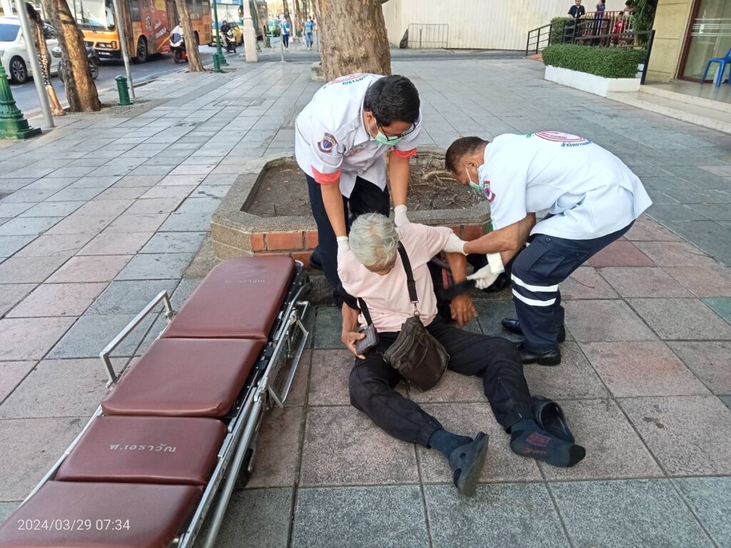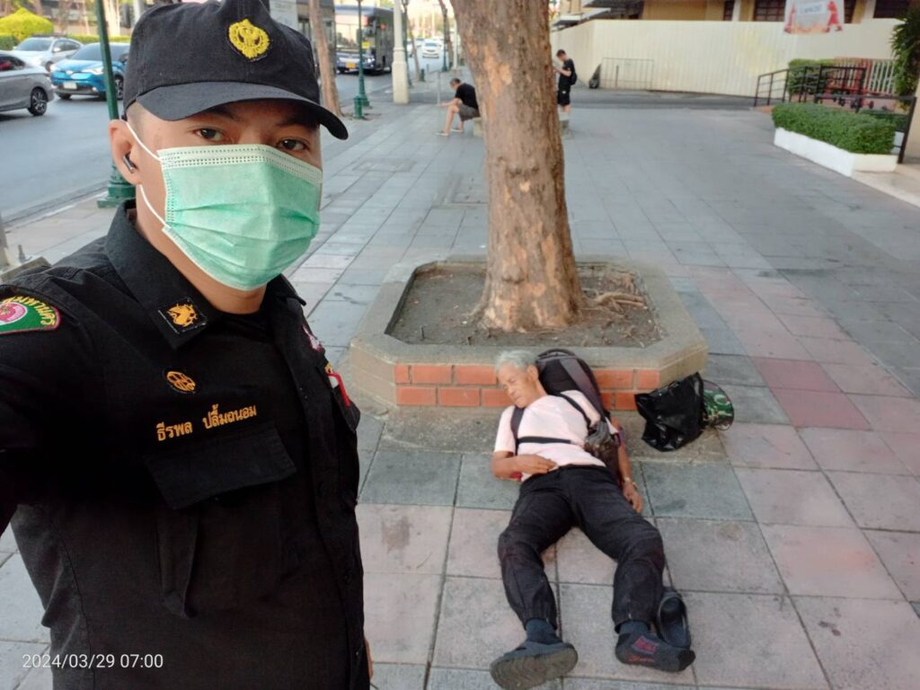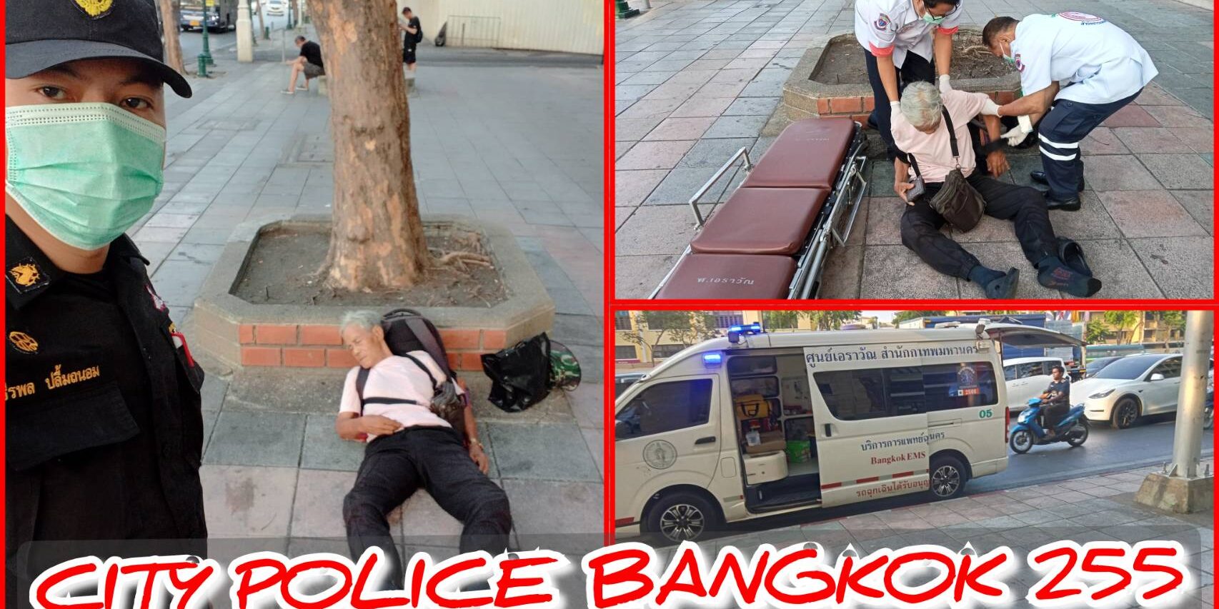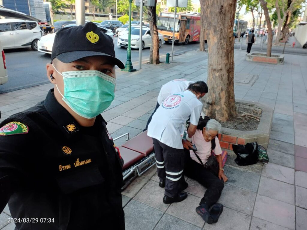เบื้องต้นจากการลงพื้นที่วันนี้ พบ ชายไทยไม่ทราบชื่อ นอนป่วยบนบาทวิถีฝ่าฝืน 1 ราย จากการซักถามทราบว่า มีอาการมึนหัวหน้ามืด อาเจียน ลุกเดินไม่ไหว ต่อมา สายตรวจเทศกิจชุด255 จึงได้โทรประสาน 1669 ส่งเรื่องให้ รถกู้ชีพโรงพยาบาลใกล้เคียงมาตรวจสอบเเละรับตัวไปรักษาต่อไผ #เหตุการณ์ทั่วไปปกติ.