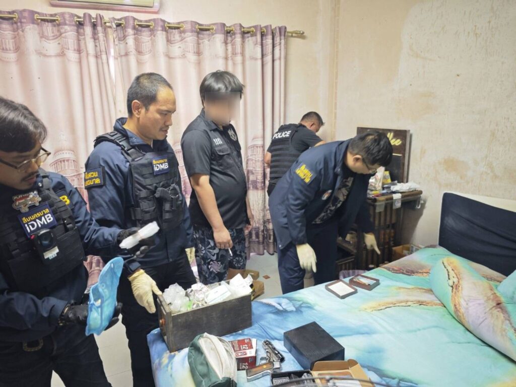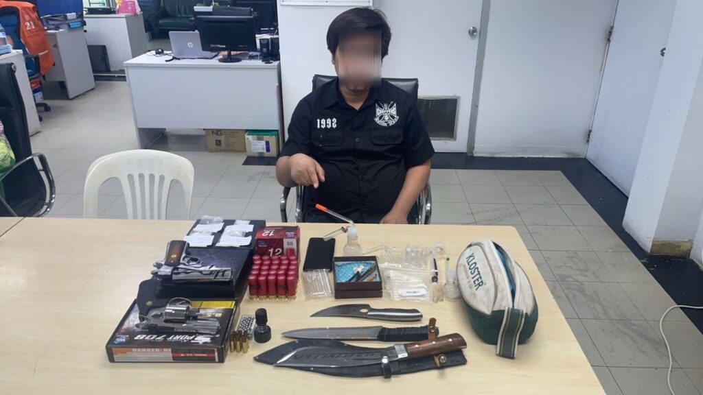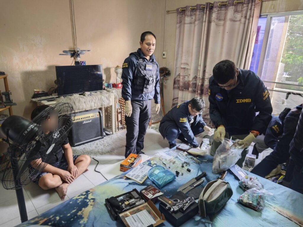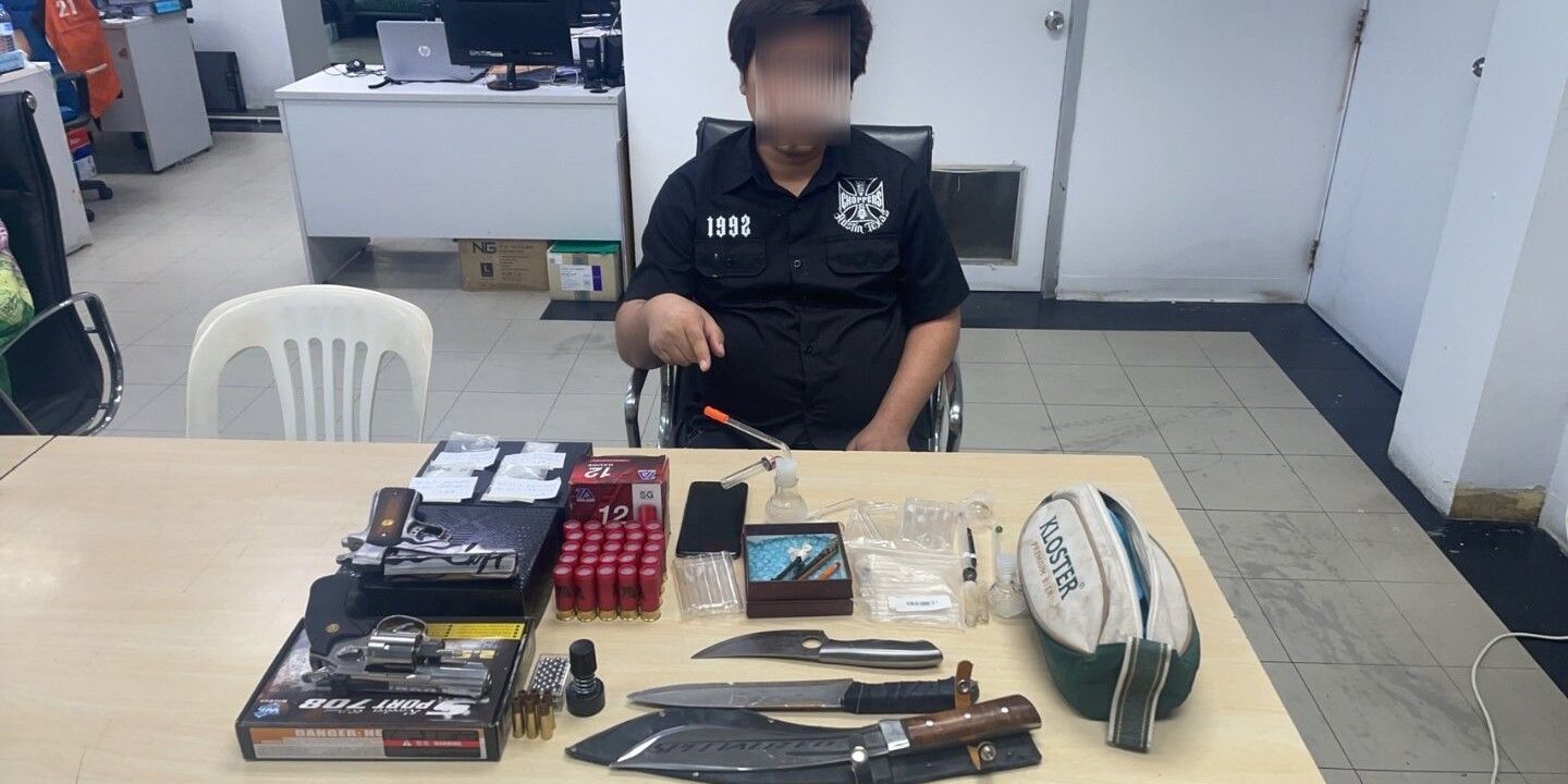 พร้อมด้วยของกลาง เป็นอาวุธปืนไทยประดิษฐ์ กระสุนปืนลูกซอง ยาเสพติด อาวุธมีด รวม 10 รายการ ประกอบด้วย อาวุธปืนไทยประดิษฐ์ ขนาดลูกซองเบอร์ 12 จำนวน 1 กระบอก, กระสุนลูกซองเบอร์12 จำนวน 25 นัด, ปืนอัดลมชนิดลูกโม่ จำนวน 1 กระบอก, กระสุนลูกเหล็ก จำนวน 1กล่อง, ตัวป้อนลูกกระสุน จำนวน 1 อัน, ลูกกระสุนสำหรับใส่ลูกเหล็ก จำนวน 6 นัด, อาวุธมีด จำนวน 3 เล่ม, ยาไอซ์ น้ำหนักรวมถุง 16.63 กรัม น้ำหนักยาไอซ์ 13.56 กรัม, อุปกรณ์เสพยา จำนวน 34 ชิ้น