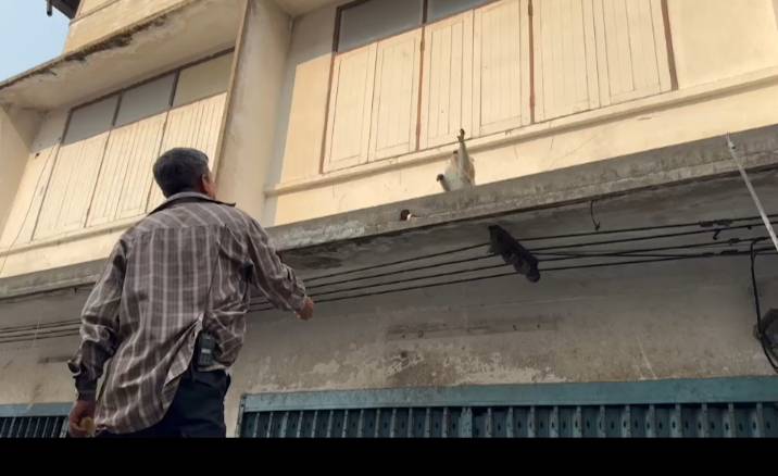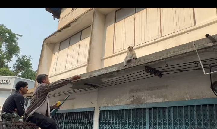 บรรยากาศปฏิบัติการไล่ล่าลิงเกเร ไอ้แหว่ง ในพื้นที่เขตเทศบาลเมืองลพบุรี ตำบลท่าหิน อำเภอเมือง จังหวัดลพบุรี
