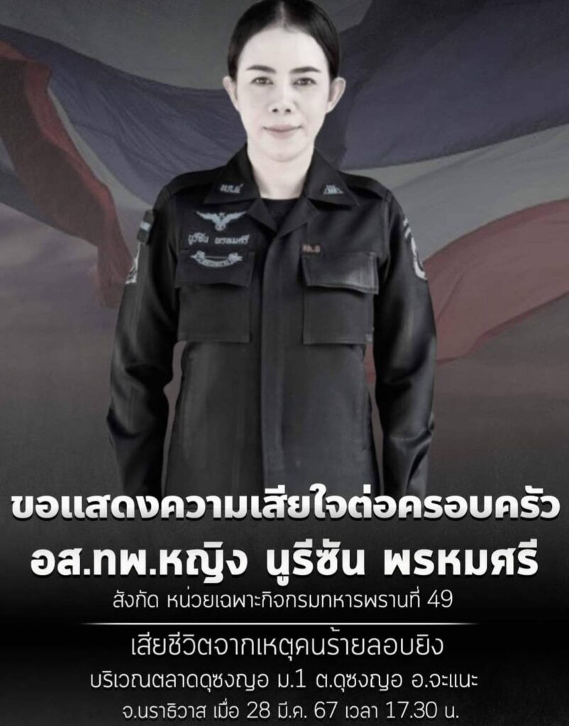 ร่วมมอบเงินช่วยเหลือครอบครัว และพูดคุยให้กำลังใจ แก่ จ.ส.ต.สรนันท์ คงเพ็ช ผบ.หมู่ (ป.) สภ.รือเสาะ จ.นราธิวาส ซึ่งเป็นสามีของ อส.ทพ.หญิง นูรีซัน พรหมศรี สังกัด หน่วยเฉพาะกิจกรมทหารพรานที่ 49 ซึ่งเสียชีวิตจากเหตุคนร้ายลอบยิง บริเวณตลาดดุซงญอ ม.1 ต.ดุงซงญอ อ.จะแนะ จ.นราธิวาส เมื่อวันที่ 28 มี.ค.2567 เวลา 17.30 น.