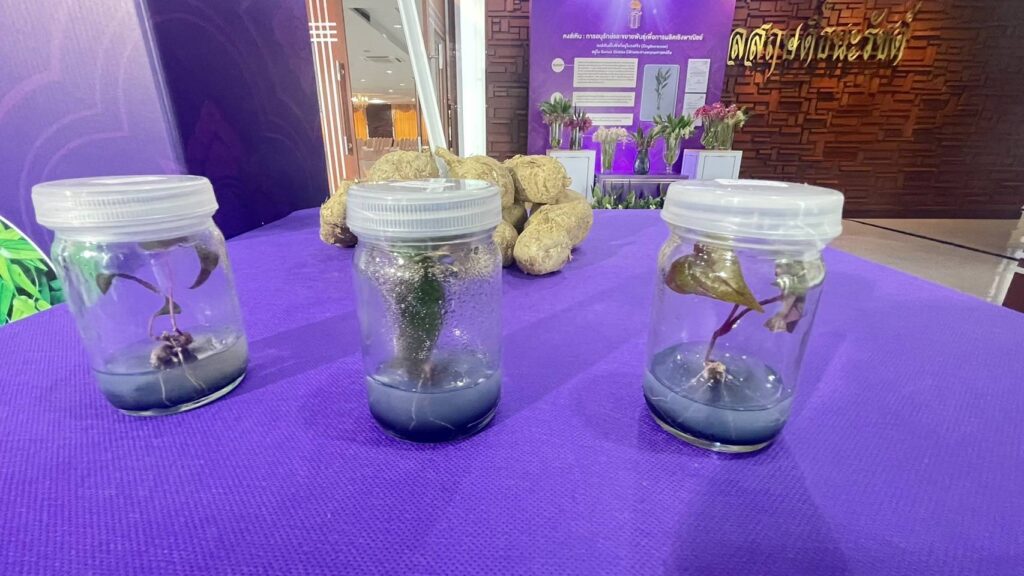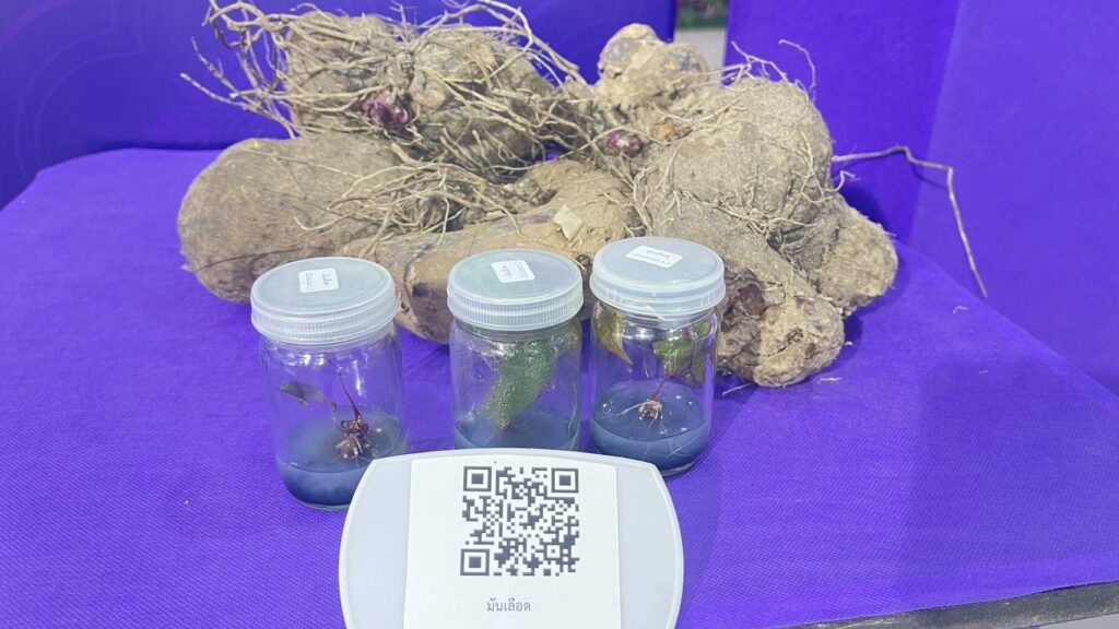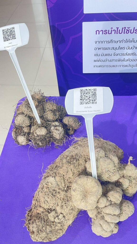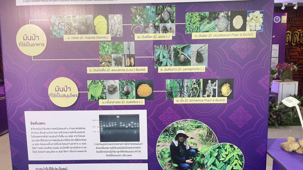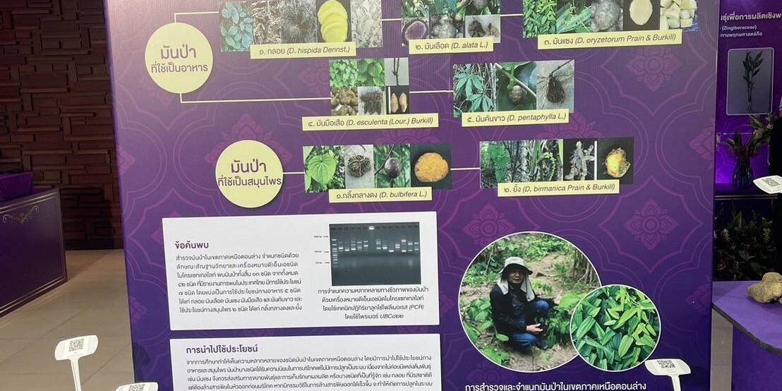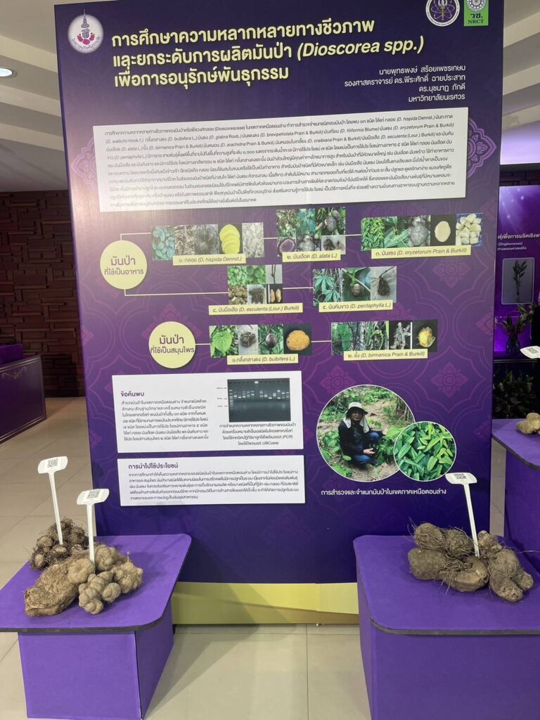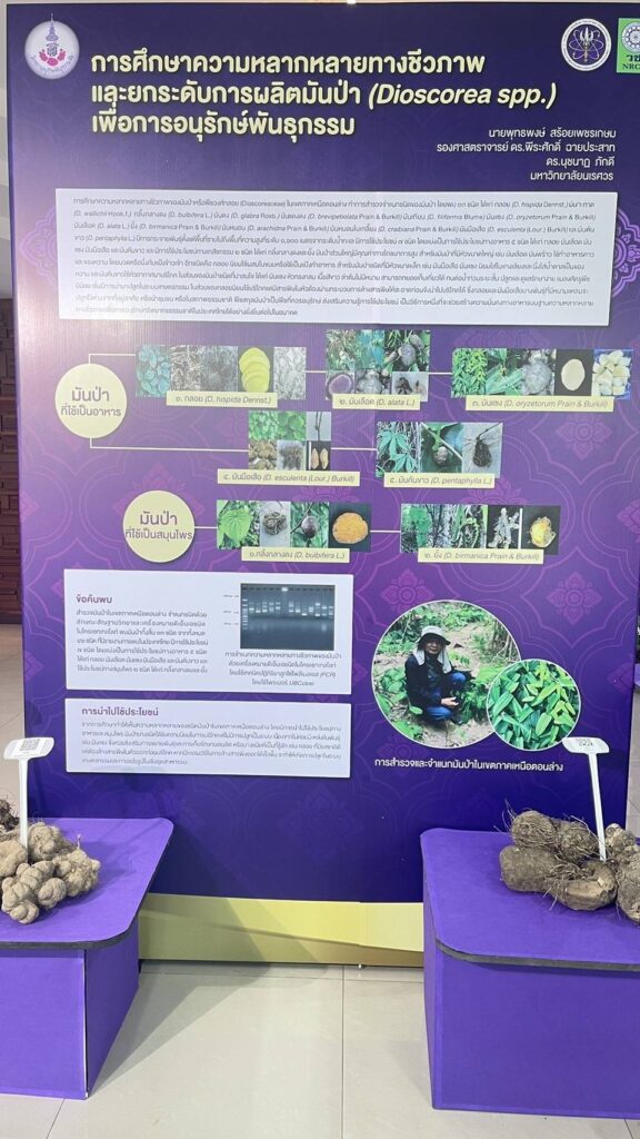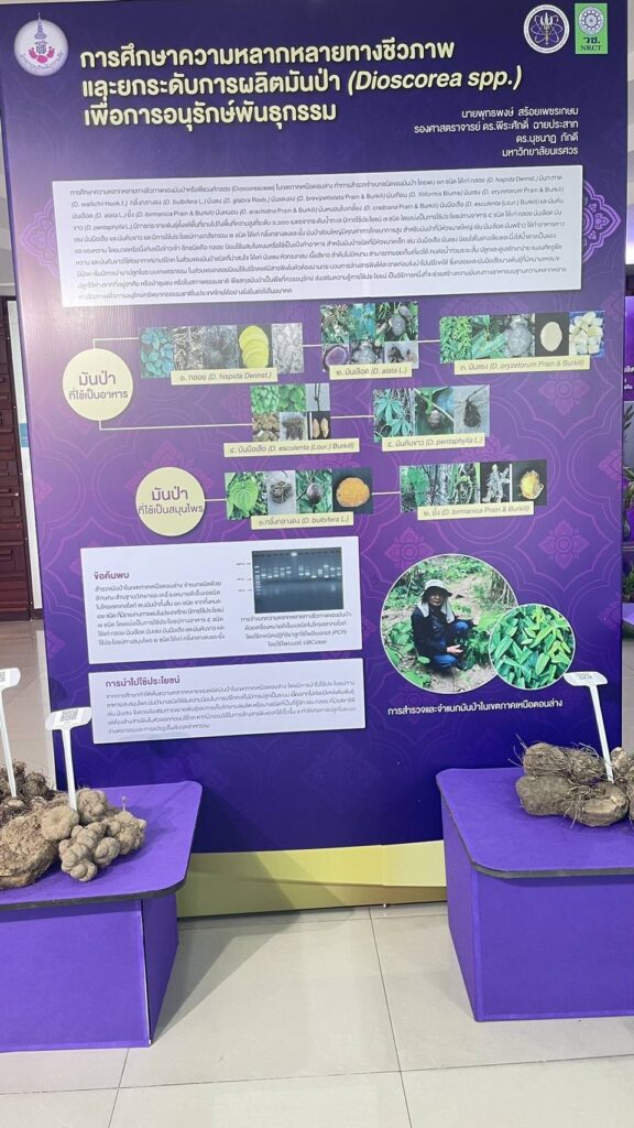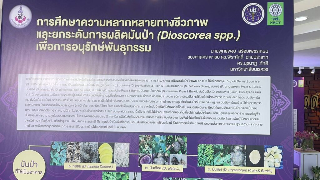 มหาวิทยาลัยนเรศวร โดย นายพุทธพงษ์ สร้อยเพชรเกษม นักวิชาการเกษตร ได้รับโจทย์วิจัยและการสนับสนุนจาก สำนักงานการวิจัยแห่งชาติ (วช.) โดยมี รศ.ดร.พีระศักดิ์ ฉายประสาท เป็นผู้ร่วมวิจัย ได้จัดทำโครงการวิจัยเรื่อง การศึกษาความหลากหลายทางชีวภาพและขยายพันธุ์มันม่วง (Dioscorea alata L.) เพื่อการใช้ประโยชน์อย่างยั่งยืน สนองโครงการอนุรักษ์พันธุกรรมพืชอันเนื่องมาจากพระราชดำริ สมเด็จพระเทพรัตนราชสุดาฯ สยามบรมราชกุมารี (อพ.สธ.) เพื่อศึกษาความหลากหลายทางชีวภาพของมันป่าด้วยเทคนิคเครื่องหมายดีเอ็นเอ ศึกษาวิธีการขยายพันธุ์และวิธีการปลูกมันป่าเพื่อให้ได้ผลผลิตที่ดี เพื่อศึกษาวิธีการทำเมล็ดเทียมสำหรับการอนุรักษ์พันธุกรรมและขยายพันธุ์มันป่า พร้อมวิเคราะห์ปริมาณสาระสำคัญ ได้แก่ saponin และ diosgenin พร้อมสร้างแปลงรวบรวมสายพันธุ์มันป่าสำหรับเป็นธนาคารพันธุกรรมพืชต่อไป