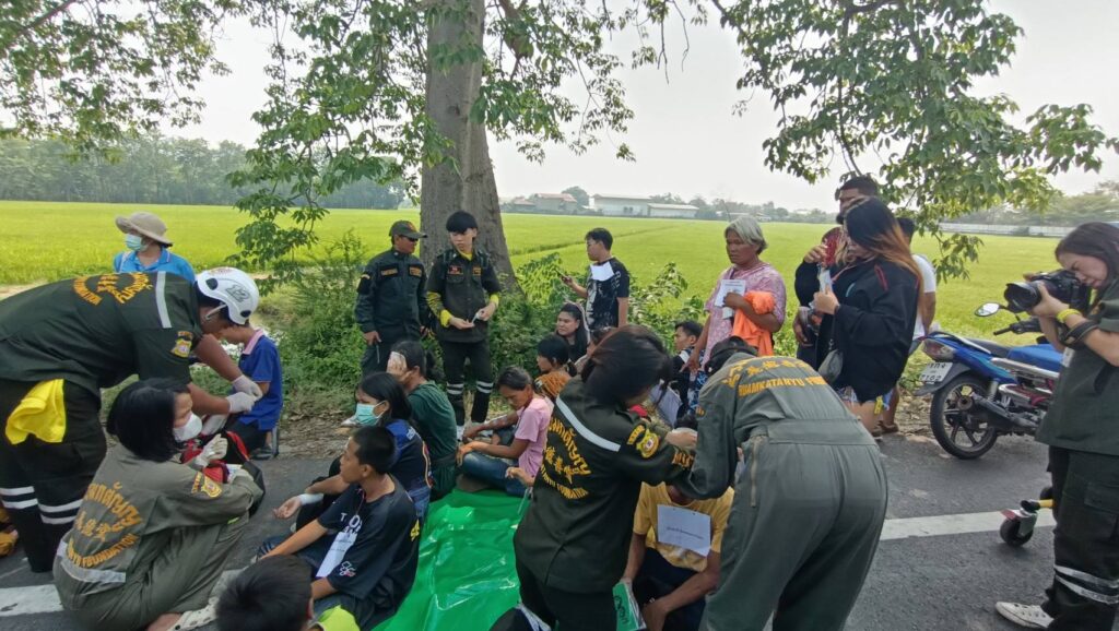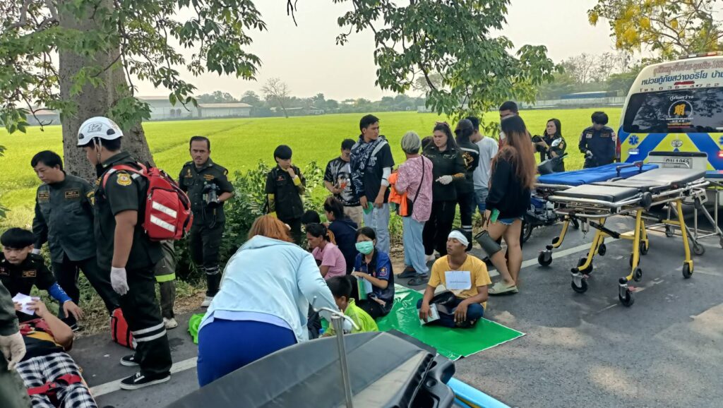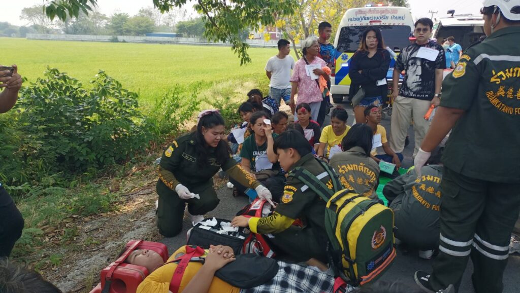 ผู้บาดเจ็บสีเหลืองสว่างอริโยบ้านหมี่นำส่ง รพ.บ้านหมี่ 2 ราย