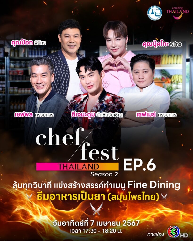 พิธีกร ป็อก กิตติพันธ์ พาเที่ยว นครปฐม ตามหาแหล่งสมุนไพรใกล้กรุงเทพ กับโจทย์วัตถุดิบสุดท้าทายใน EP. 6 กับ โจทย์อาหารเป็นยา(สมุนไพรไทย) ใน EP. นี้ได้รับเกียรติจาก อาจารย์ คมสัน ทินกร ณ อยุธยา รองคณบดีฝ่ายการแพทย์แผนไทย วิทยาลัยการแพทย์แผนตะวันออก มหาวิทยาลัยรังสิต “หมอหลวง” ลำดับชั้นที่ 6 ในสาย ราชสกุล “ทินกร” มาให้คำแนะนำผู้เข้าแข่งขันที่เหลือทั้ง 5 คน การแข่งขันดุเดือดขึ้นทุกสัปดาห์ เพราะแต่ละสัปดาห์ผู้เข้าแข่งขันจะต้องเจอโจทย์ที่คาดเดาไม่ได้และไม่รู้มาก่อนว่าจะเจอกับโจทย์แบบไหน ผู้เข้าแข่งขันจะต้องรังสรรค์เมนูตามโจทย์ที่ได้รับและต้องเอาชนะใจคณะกรรมการทั้ง 3 ท่าน เชฟเมย์ พัทธนันท์ , เชฟพล ตัณฑเสถียร และ ดีเจมะตูม มาลุ้นกันว่าเชฟผู้เข้าแข่งขันคนไหนจะมีผลงานถูกใจคณะกรรมการมากที่สุดและจะผ่านเข้าไปรอบไฟนอล ติดตามรายการ “Chef Fest Thailand season 2” เวลา 17.30 น. วันอาทิตย์ที่ 7 เมษายน 2567 ดูทีวีกด 33 ดู มือถือกด 3Plus