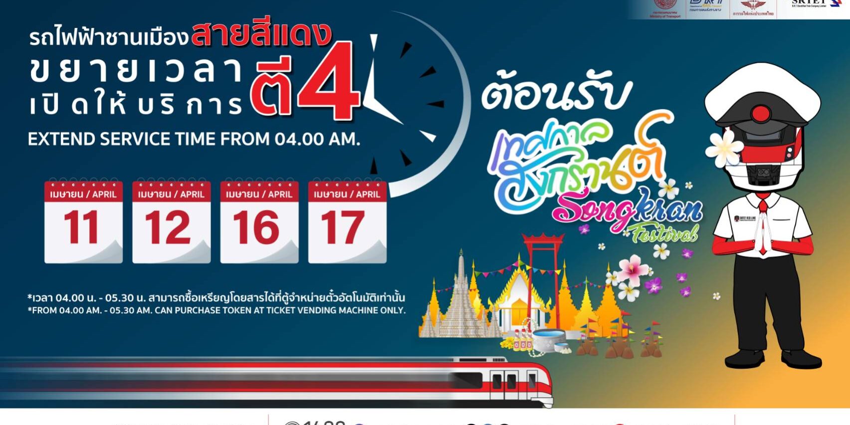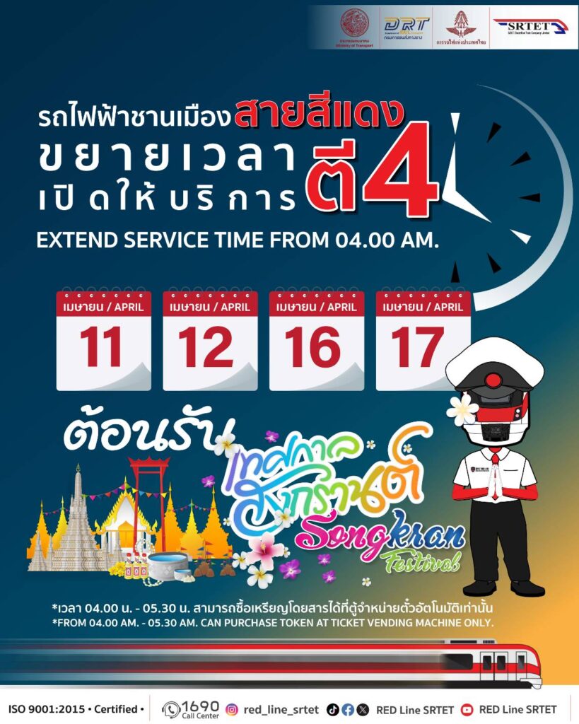 นายสุเทพ พันธุ์เพ็ง กรรมการผู้อำนวยการใหญ่ บริษัท รถไฟฟ้า ร.ฟ.ท. จำกัด หรือผู้ให้บริการรถไฟฟ้าชานเมืองสายสีแดง เปิดเผยว่า เพื่อให้การเดินทางของประชาชนในช่วงเทศกาลปีสงกรานต์เต็มไปด้วยรอยยิ้ม ได้รับความสะดวกสบายและปลอดภัย สามารถเชื่อมต่อกับระบบขนส่งอื่นๆอย่างไร้รอยต่อ จึงพร้อมดำเนินการตามนโยบายของกระทรวงคมนาคมที่มุ่งเน้นให้ทุกการเดินทางเชื่อมโยงเข้าด้วยกัน เพื่อความสะดวกของประชาชน จึงปรับเวลาการเปิดให้บริการเดินรถไฟฟ้า ให้ประชาชนได้ใช้บริการเร็วขึ้นจากเดิม เวลา 05.00 น. เป็น 04.00 น. ในวันที่ 11,12,16 และ 17 เมษายน 2567 ซึ่งจะช่วยให้ผู้ใช้บริการสามารถเชื่อมต่อการเดินทางกับระบบขนส่งอื่นได้อย่างสะดวก โดยผู้ที่จะเดินทางกลับภูมิลำเนาด้วยรถไฟทางไกล และรถขนส่ง บขส. ก็สามารถเชื่อมต่อได้ที่สถานีกลางกรุงเทพอภิวัฒน์ หรือผู้ที่เดินทางด้วยเครื่องบินก็สามารถเชื่อมต่อที่สถานีดอนเมืองได้อย่างสะดวกเช่นกัน ทั้งนี้เพื่อเป็นการมอบความสุขแทนคำขอบคุณมายังประชาชนทุกท่านที่ให้ความไว้วางใจรถไฟฟ้าชานเมืองสายสีแดงมาโดยตลอด และหวังเป็นอย่างยิ่งว่าประชาชนทุกท่านจะได้รับความสุข สะดวกสบาย และปลอดภัยตลอดการเดินทางในช่วงเทศกาลแห่งความสุขนี้