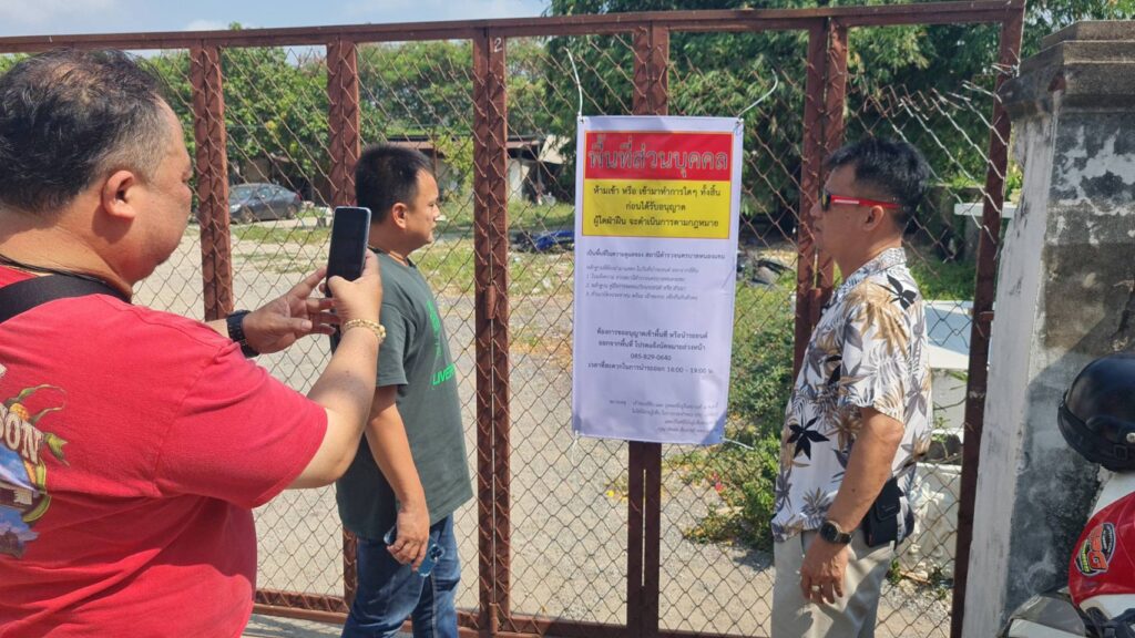 ที่เกิดเหตุเป็นพื้นที่ว่างใช้สำหรับโรงจอดรถ มีประตูรั้วเหล็กปิดอยู่ ลักษณะเป็นอาคารชั้นเดียว พื้นที่ประมาณ 2 ไร่ ทางเจ้าของที่ได้เปิดประตูพาเจ้าหน้าที่เข้าไปด้านในเพื่อตรวจสอบ ด้านหน้าเจ้าของที่จึงมีการนำป้ายมาติดว่า” พื้นที่ส่วนบุคคล หากต้องการขออนุญาตเข้า หรือต้องการนำรถออกจากพื้นที่ โปรดนักหมายล่วงหน้า ” พร้อมระบุเบอร์โทรไว้ติดต่อ