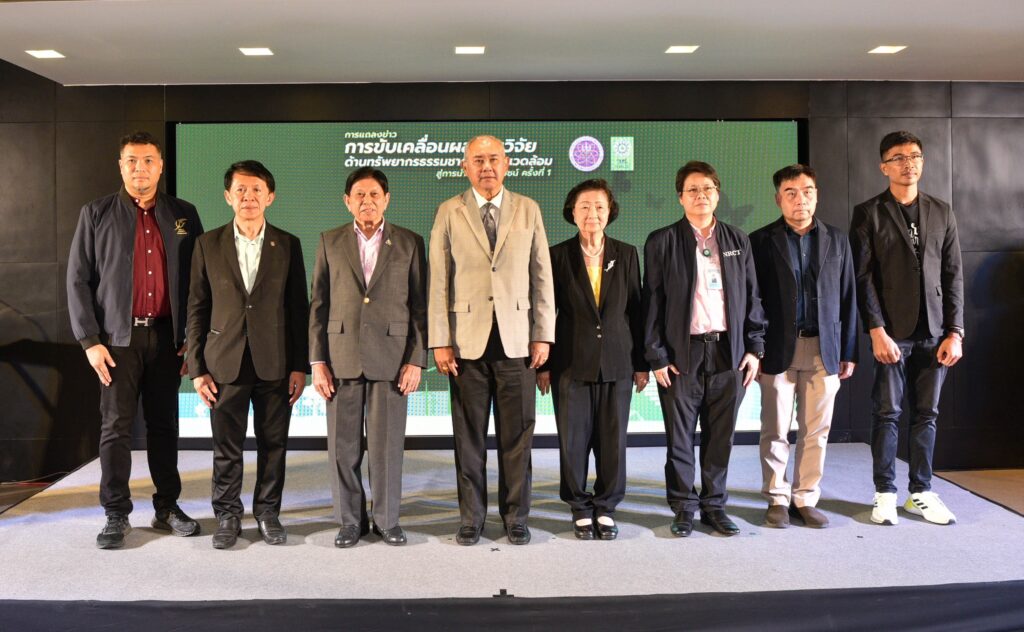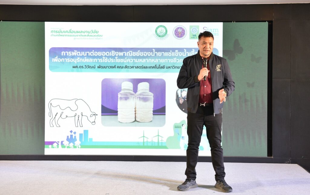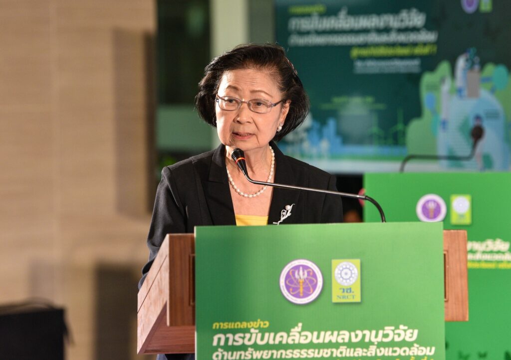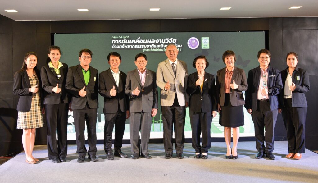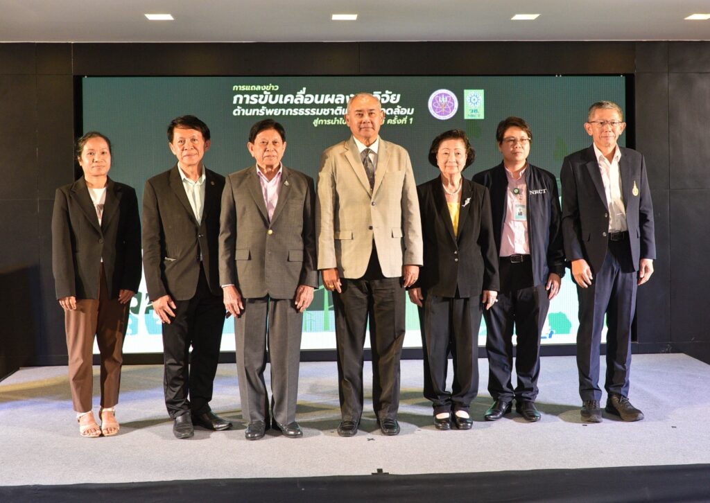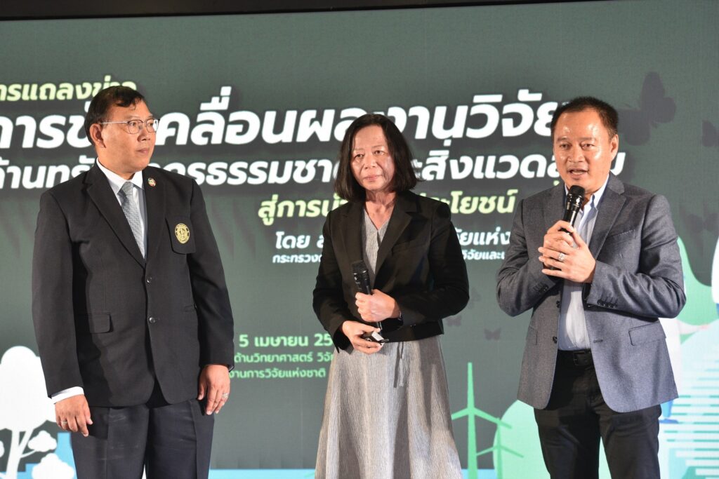 รศ.ดร.นภาวรรณ นพรัตนราภรณ์ ผู้อำนวยการแผนงานศูนย์ขับเคลื่อนผลงานวิจัยด้านทรัพยากรธรรมชาติและสิ่งแวดล้อมสู่การนำไปใช้ประโยชน์ กล่าวถึง แผนงานวิจัยศูนย์ขับเคลื่อนผลงานวิจัยด้านทรัพยากรธรรมชาติและสิ่งแวดล้อมสู่การนำไปใช้ประโยชน์ ที่ได้รับการสนับสนุนทุนจาก (วช.) เพื่อประเมินผลผลิต ผลลัพธ์ ผลกระทบของโครงการวิจัย และขับเคลื่อนขยายผลสู่การใช้ประโยชน์ในกลุ่มเป้าหมายภาคส่วนต่างๆ นั้น โดยระยะแรกได้ดำเนินการประเมินโครงการวิจัยที่ได้รับทุนด้านทรัพยากรธรรมชาติและสิ่งแวดล้อม ตั้งแต่ปี 2557 – 2563 จำนวนรวมทั้งสิ้น 468 โครงการ ในเบื้องต้นพบว่ามีโครงการวิจัยที่สามารถขับเคลื่อนขยายผลสู่การนำไปใช้ประโยชน์ทางด้านเศรษฐกิจ สังคม และสิ่งแวดล้อม อย่างเป็นรูปธรรม แบ่งเป็น 3 กลุ่ม ได้แก่ กลุ่มที่ 1 โครงการวิจัยที่มีการนำผลงานวิจัยไปใช้ประโยชน์เชิงพาณิชย์โดยจัดตั้งธุรกิจเริ่มต้น และผลิตผลิตภัณฑ์จำหน่ายในท้องตลาดอย่างต่อเนื่องหรือผลิตเพื่อทดสอบตลาด กลุ่มเรื่องที่ 2 โครงการวิจัยที่มีผู้แสดงเจตจำนงนำไปใช้ประโยชน์เชิงพาณิชย์ กลุ่มเรื่องที่ 3 โครงการวิจัยที่มีการใช้ประโยชน์ในระดับนโยบายโดยมีการประกาศใช้แล้ว ซึ่งวันนี้ (วช.) นำผลงานวิจัยมาจัดแสดงนิทรรศการภายในงานแถลงข่าวครั้งนี้ จำนวน 6 โครงการ ได้แก่ โครงการการพัฒนาต่อยอดเชิงพาณิชย์ของน้ำยาแช่แข็งน้ำเชื้อโค เพื่อการอนุรักษ์และการใช้ประโยชน์ความหลากหลายทางชีวภาพอย่างยั่งยืน โครงการการพัฒนาฟิล์มหดแบบใช้ความร้อนจากพลาสติกย่อยสลายทางชีวภาพ โครงการการวิจัยและพัฒนาผลิตภัณฑ์สปาพืชสมุนไพรล้านนา โครงการการพัฒนาผลิตภัณฑ์เพื่อสุขภาพจากกล้วยไม้สกุลหวาย โครงการนวัตกรรมการใช้ประโยชน์จากชีวมวลและสารชีวภัณฑ์จากแบคทีเรียทนเค็มสายพันธุ์คัดเลือกเพื่อเพิ่มประสิทธิภาพการปลูกพืชผักแบบเกษตรอินทรีย์ และโครงการการศึกษาแหล่งที่มาและแผนที่ของอนุภาคขนาดนาโนในบรรยากาศของประเทศไทยรวมถึงผลกระทบต่อสุขภาพมนุษย์ทั้งทางตรงและทางอ้อม เพื่อเป็นการเผยแพร่ประชาสัมพันธ์ผลงานวิจัยและนวัตกรรมด้านทรัพยากรธรรมชาติและสิ่งแวดล้อม ที่ วช. ให้การสนับสนุน และสามารถนำไปสู่การใช้ประโยชน์อย่างเป็นรูปธรรมและใช้งานได้จริง รวมทั้งสามารถสร้างรายได้เข้าสู่ประเทศได้