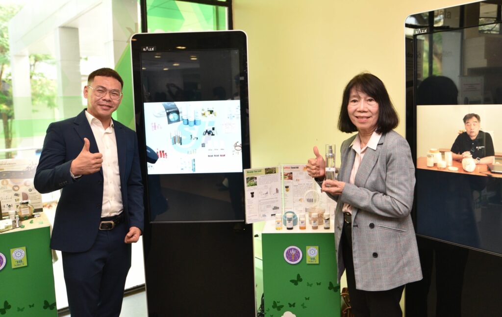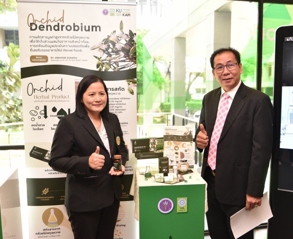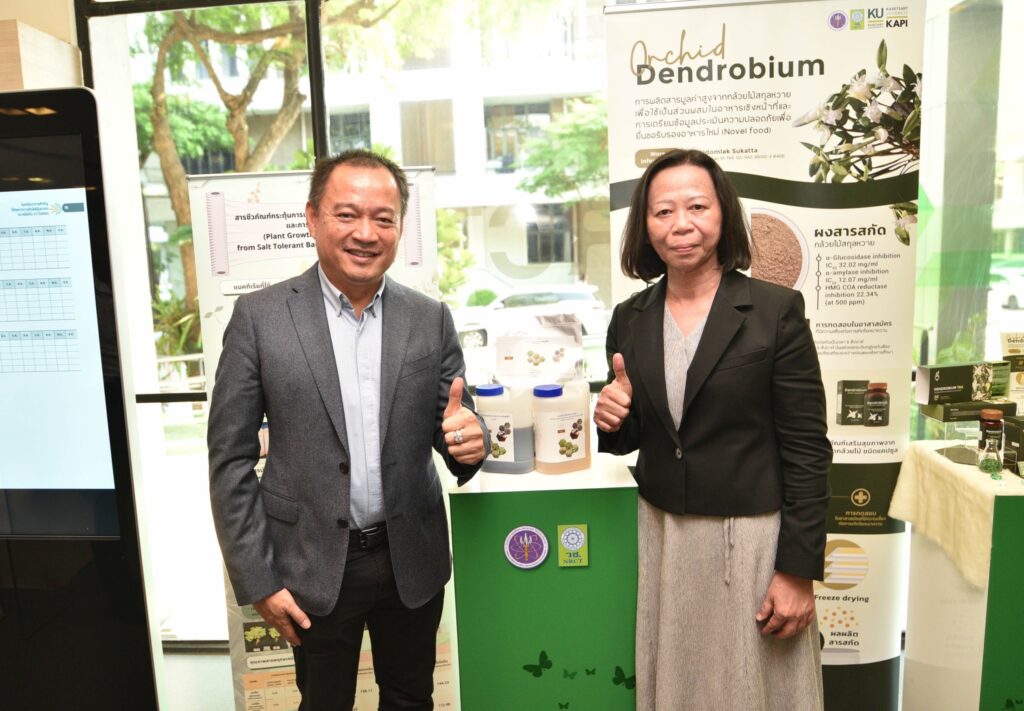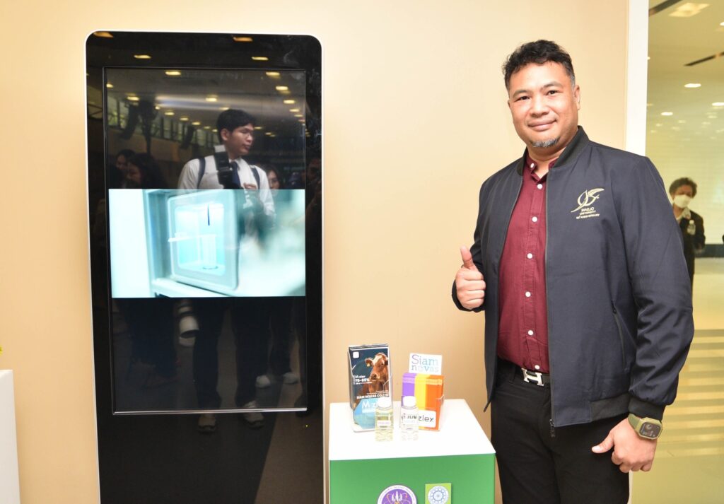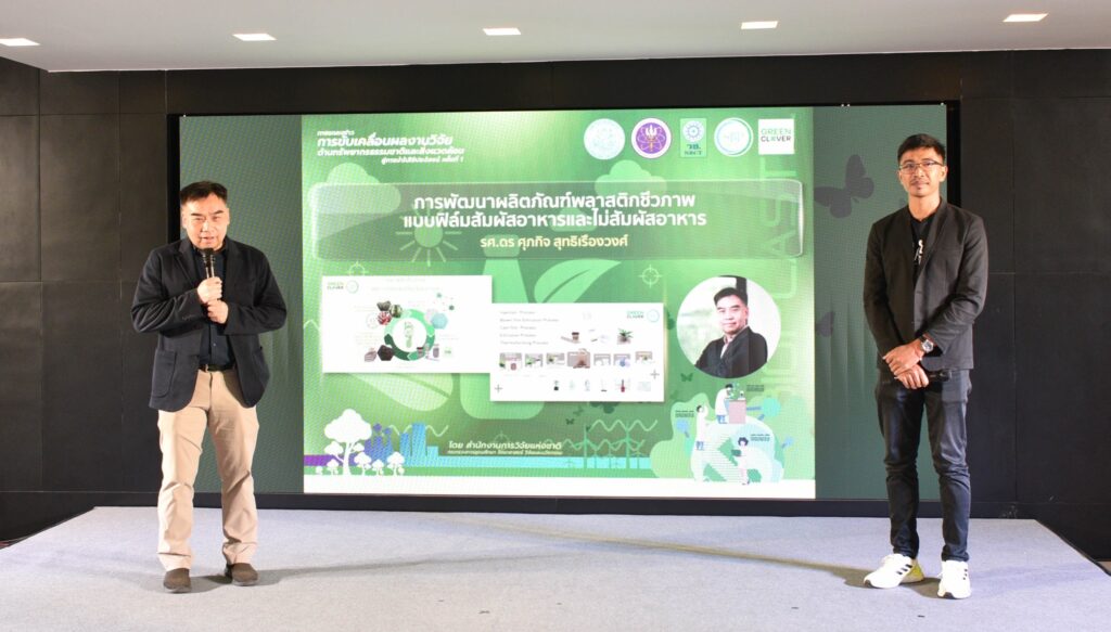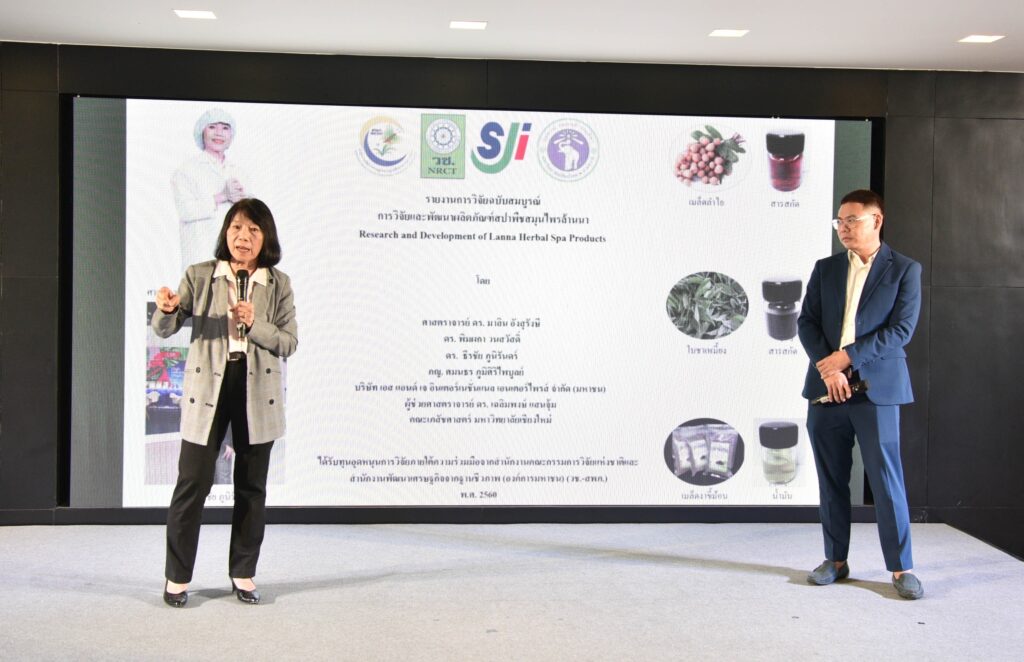รศ.ดร.นภาวรรณ นพรัตนราภรณ์ ผู้อำนวยการแผนงานศูนย์ขับเคลื่อนผลงานวิจัยด้านทรัพยากรธรรมชาติและสิ่งแวดล้อมสู่การนำไปใช้ประโยชน์ กล่าวถึง แผนงานวิจัยศูนย์ขับเคลื่อนผลงานวิจัยด้านทรัพยากรธรรมชาติและสิ่งแวดล้อมสู่การนำไปใช้ประโยชน์ ที่ได้รับการสนับสนุนทุนจาก (วช.) เพื่อประเมินผลผลิต ผลลัพธ์ ผลกระทบของโครงการวิจัย และขับเคลื่อนขยายผลสู่การใช้ประโยชน์ในกลุ่มเป้าหมายภาคส่วนต่างๆ นั้น โดยระยะแรกได้ดำเนินการประเมินโครงการวิจัยที่ได้รับทุนด้านทรัพยากรธรรมชาติและสิ่งแวดล้อม ตั้งแต่ปี 2557 – 2563 จำนวนรวมทั้งสิ้น 468 โครงการ ในเบื้องต้นพบว่ามีโครงการวิจัยที่สามารถขับเคลื่อนขยายผลสู่การนำไปใช้ประโยชน์ทางด้านเศรษฐกิจ สังคม และสิ่งแวดล้อม อย่างเป็นรูปธรรม แบ่งเป็น 3 กลุ่ม ได้แก่ กลุ่มที่ 1 โครงการวิจัยที่มีการนำผลงานวิจัยไปใช้ประโยชน์เชิงพาณิชย์โดยจัดตั้งธุรกิจเริ่มต้น และผลิตผลิตภัณฑ์จำหน่ายในท้องตลาดอย่างต่อเนื่องหรือผลิตเพื่อทดสอบตลาด กลุ่มเรื่องที่ 2 โครงการวิจัยที่มีผู้แสดงเจตจำนงนำไปใช้ประโยชน์เชิงพาณิชย์ กลุ่มเรื่องที่ 3 โครงการวิจัยที่มีการใช้ประโยชน์ในระดับนโยบายโดยมีการประกาศใช้แล้ว ซึ่งวันนี้ (วช.) นำผลงานวิจัยมาจัดแสดงนิทรรศการภายในงานแถลงข่าวครั้งนี้ จำนวน 6 โครงการ ได้แก่ โครงการการพัฒนาต่อยอดเชิงพาณิชย์ของน้ำยาแช่แข็งน้ำเชื้อโค เพื่อการอนุรักษ์และการใช้ประโยชน์ความหลากหลายทางชีวภาพอย่างยั่งยืน โครงการการพัฒนาฟิล์มหดแบบใช้ความร้อนจากพลาสติกย่อยสลายทางชีวภาพ โครงการการวิจัยและพัฒนาผลิตภัณฑ์สปาพืชสมุนไพรล้านนา โครงการการพัฒนาผลิตภัณฑ์เพื่อสุขภาพจากกล้วยไม้สกุลหวาย โครงการนวัตกรรมการใช้ประโยชน์จากชีวมวลและสารชีวภัณฑ์จากแบคทีเรียทนเค็มสายพันธุ์คัดเลือกเพื่อเพิ่มประสิทธิภาพการปลูกพืชผักแบบเกษตรอินทรีย์ และโครงการการศึกษาแหล่งที่มาและแผนที่ของอนุภาคขนาดนาโนในบรรยากาศของประเทศไทยรวมถึงผลกระทบต่อสุขภาพมนุษย์ทั้งทางตรงและทางอ้อม เพื่อเป็นการเผยแพร่ประชาสัมพันธ์ผลงานวิจัยและนวัตกรรมด้านทรัพยากรธรรมชาติและสิ่งแวดล้อม ที่ วช. ให้การสนับสนุน และสามารถนำไปสู่การใช้ประโยชน์อย่างเป็นรูปธรรมและใช้งานได้จริง รวมทั้งสามารถสร้างรายได้เข้าสู่ประเทศได้