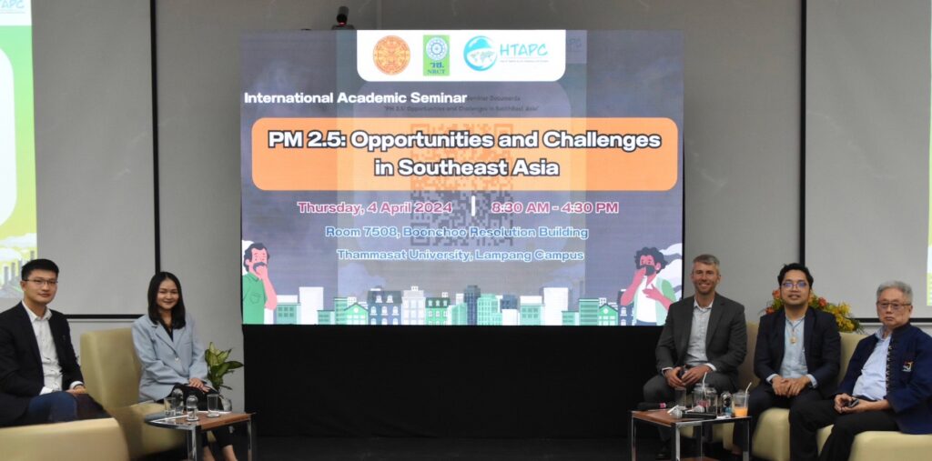 เมื่อวันที่ 4 เมษายน 2567 สำนักงานการวิจัยแห่งชาติ (วช.) กระทรวงการอุดมศึกษา วิทยาศาสตร์ วิจัยและนวัตกรรม (อว.) โดยศูนย์รวมผู้เชี่ยวชาญด้านมลพิษอากาศและภูมิอากาศ (Hub of Talents on Air Pollution and Climate – HTAPC) ร่วมกับ มหาวิทยาลัยธรรมศาสตร์ ศูนย์ลำปาง (มธ.) จัดการเสวนาวิชาการระดับนานาชาติ เรื่อง “PM2.5 โอกาสและความท้าทายในภูมิภาคเอเชียตะวันออกเฉียงใต้” เพื่อเผยแพร่องค์ความรู้และผลงานวิชาการ รวมทั้งสร้างความเชื่อมโยงทางวิชาการทั้งในและต่างประเทศ โดยมี ดร.วิภารัตน์ ดีอ่อง ผู้อำนวยการสำนักงานการวิจัยแห่งชาติ เป็นประธานเปิดงาน และมี รองศาสตราจารย์ ดร.สุปรียา แก้วละเอียด รองอธิการบดีฝ่ายบริหารศูนย์ลำปางและกฎหมาย มหาวิทยาลัยธรรมศาสตร์ เป็นประธานร่วมกล่าวเปิดและกล่าวต้อนรับผู้เข้าร่วมงานฯ ซึ่งการเสวนาในครั้งนี้ ได้รับเกียรติจาก ดร.วิจารย์ สิมาฉายา ผู้อำนวยการสถาบันสิ่งแวดล้อมไทย ปาฐกถาพิเศษ เรื่อง “สถานการณ์ฝุ่น PM2.5 ในประเทศไทย” และ Dr. Zbigniew Klimont (Research Group Leader and Principal Research Scholar of Pollution Management Research Group, Energy, Climate, Environment, International Institute for Applied Systems Analysis (IIASA), Austria) ปาฐกถาพิเศษเรื่อง “สถานการณ์ปัญหา PM2.5 ข้ามพรมแดน ในภูมิภาคเอเชียตะวันออกเฉียงใต้” ณ อาคารบุญชูปณิธาน มหาวิทยาลัยธรรมศาสตร์ ศูนย์ลำปาง