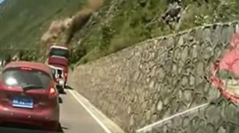 ชาวจีนเผยแพร่คลิปสุดระทึก ก้อนหินจำนวนมากถล่มครืนลงมาจากภูเขาตกลงบนถนน ทางหลวง