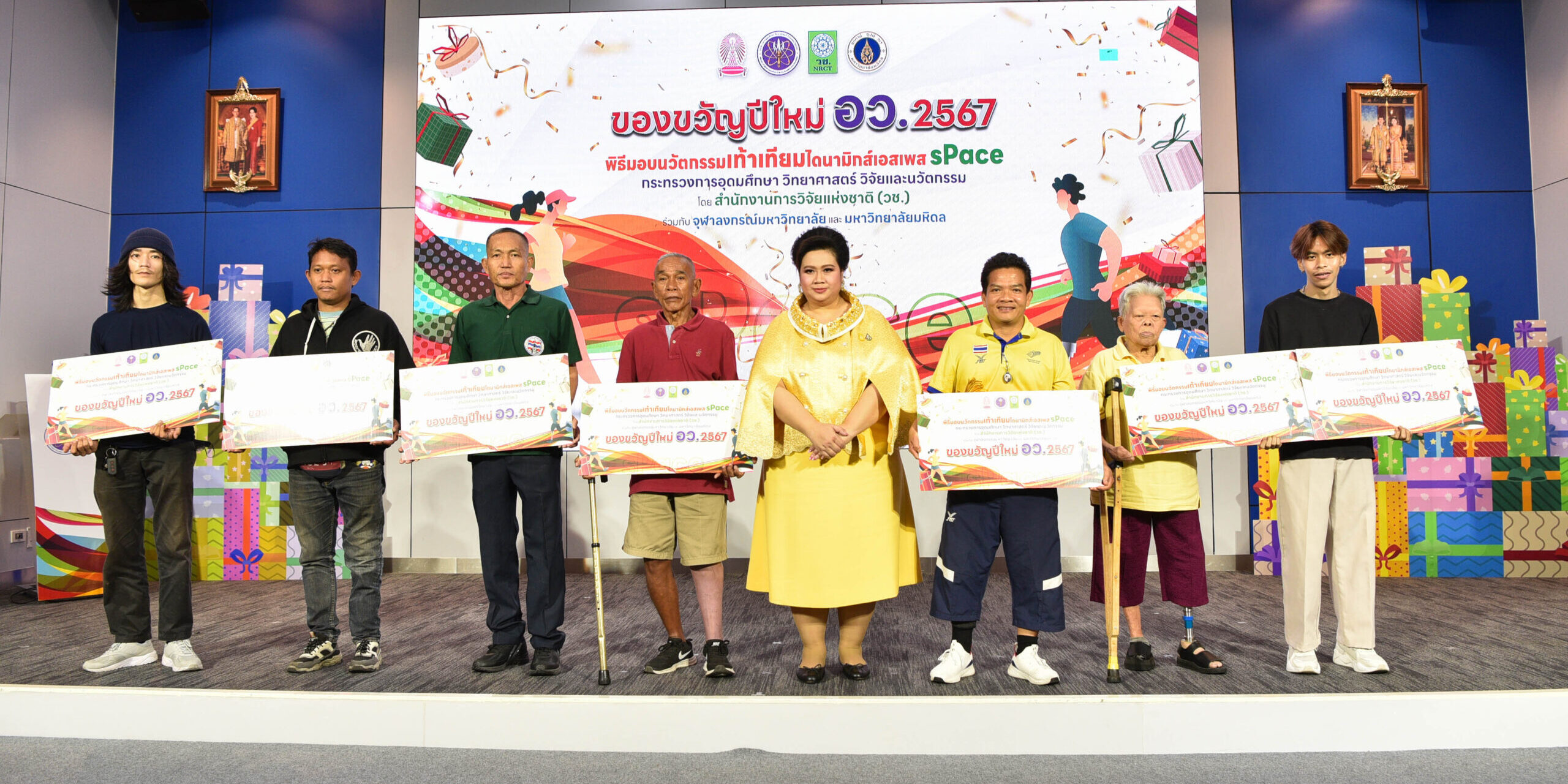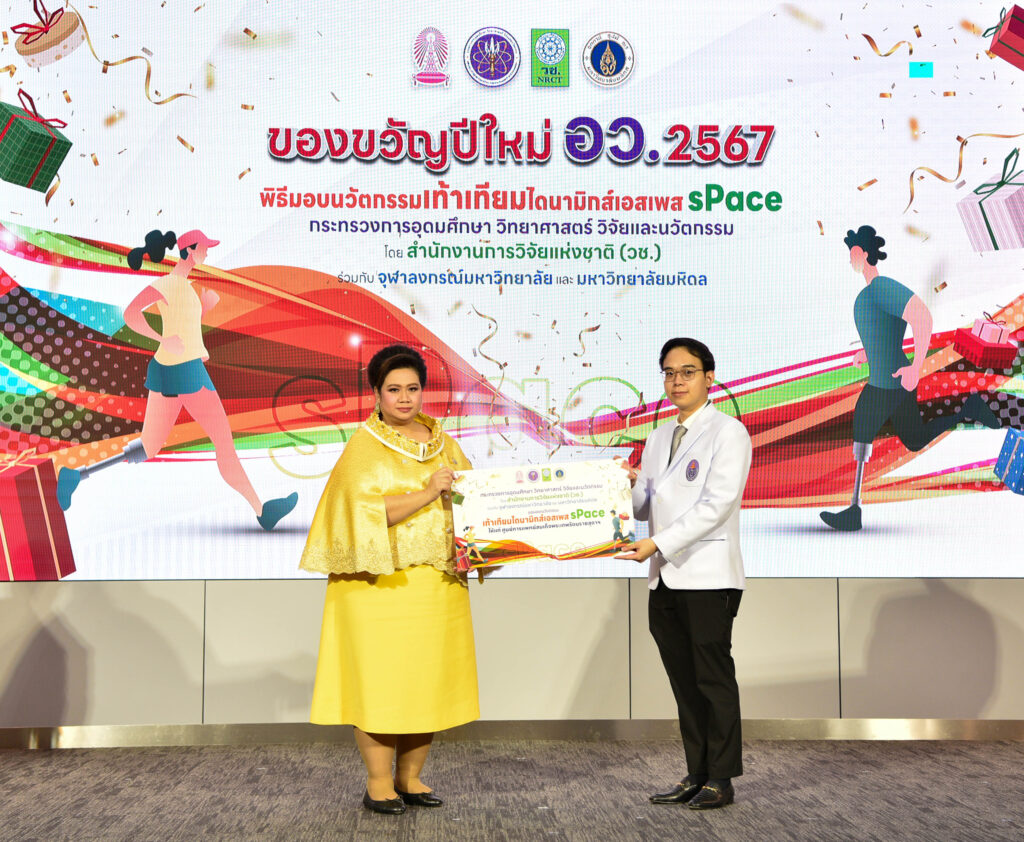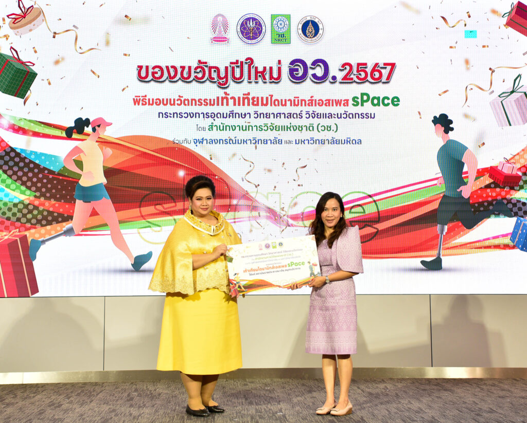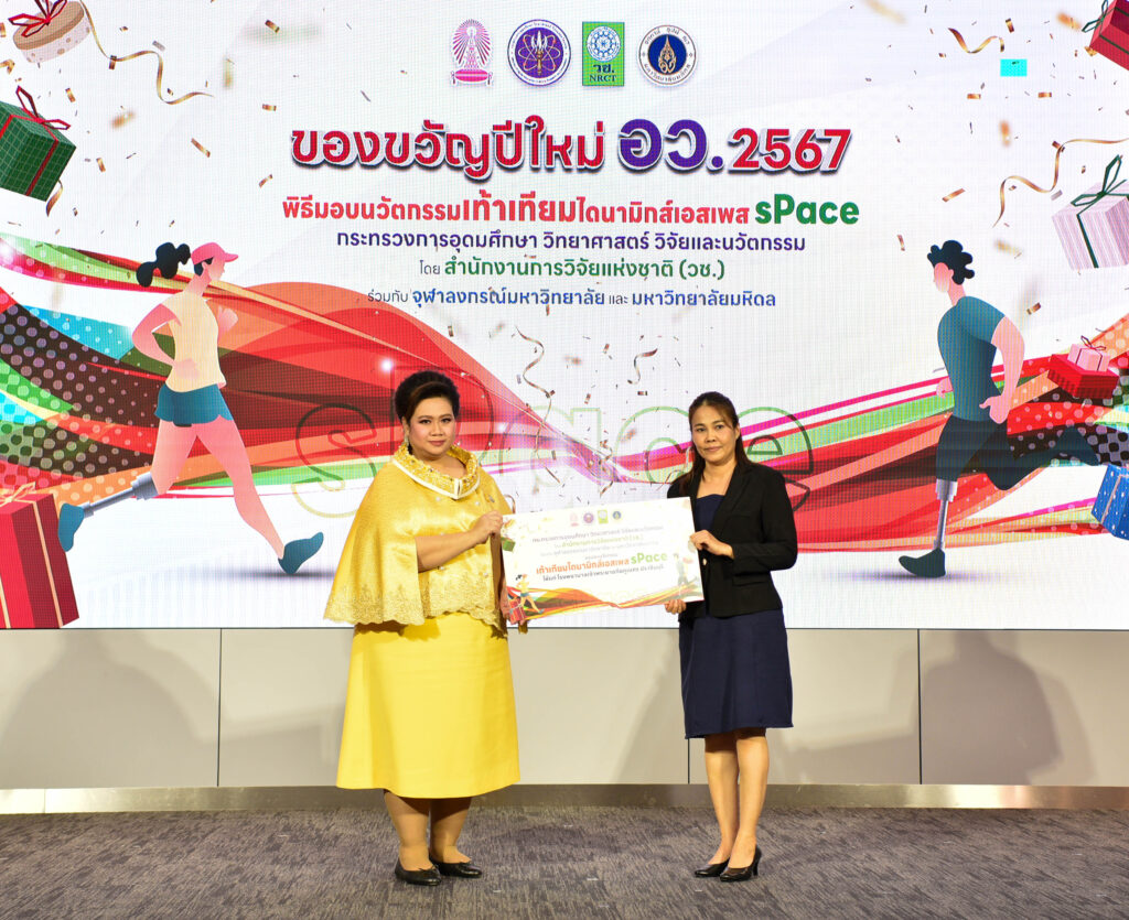 เมื่อวันที่ 3 เมษายน 2567 กระทรวงการอุดมศึกษา วิทยาศาสตร์ วิจัยและนวัตกรรม โดย สำนักงานการวิจัยแห่งชาติ (วช.) ร่วมกับ จุฬาลงกรณ์มหาวิทยาลัย และมหาวิทยาลัยมหิดล จัดพิธีส่งมอบนวัตกรรมเท้าเทียมไดนามิกส์เอสเพส (sPace) คุณภาพสูง เพื่อพัฒนาคุณภาพชีวิตผู้พิการ ให้กับ โรงพยาบาล ทั้ง 7 แห่ง ภายใต้โครงการของขวัญปีใหม่ 2567 จาก กระทรวง (อว.) ภายใต้การสนับสนุนทุนวิจัย จาก (วช.)